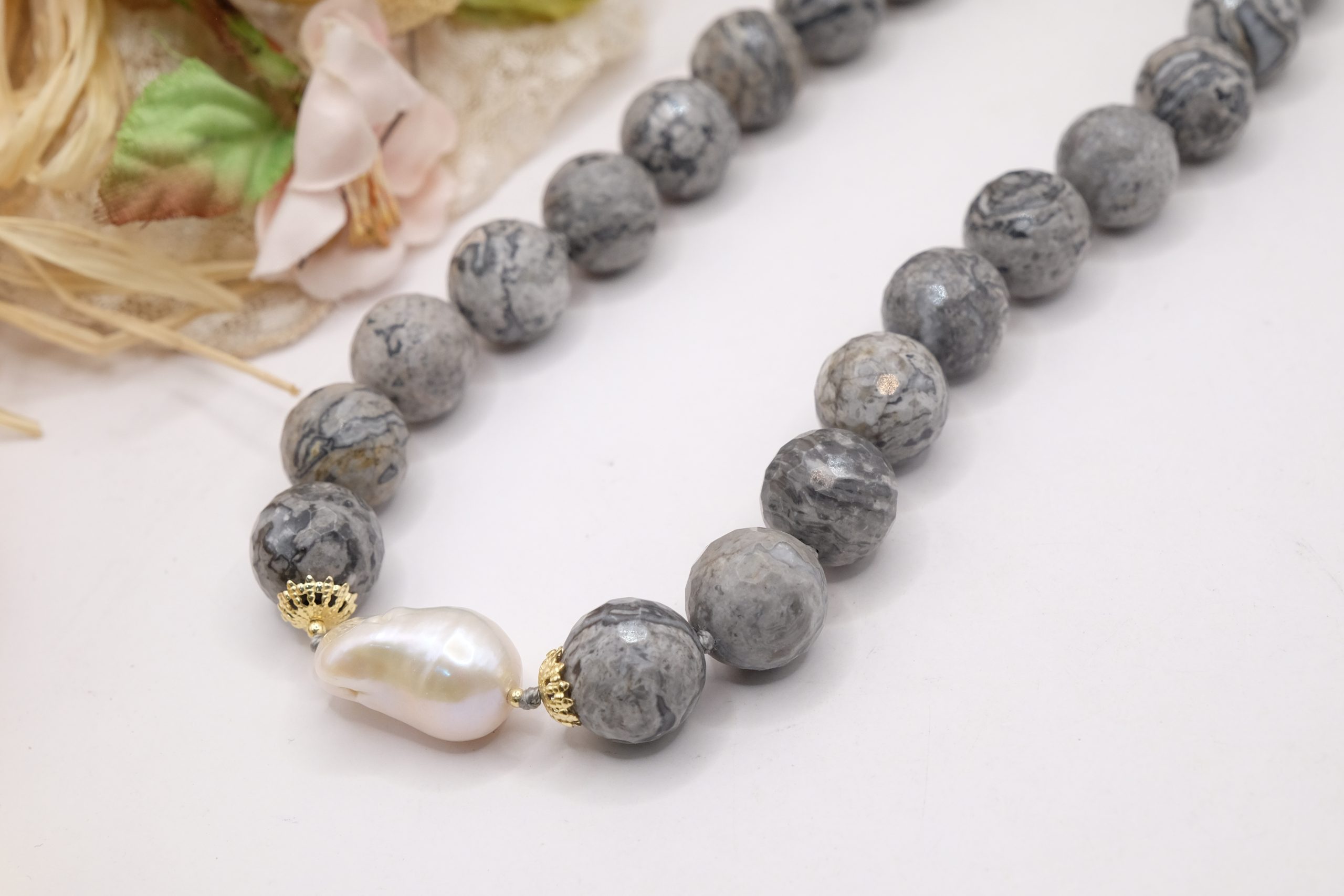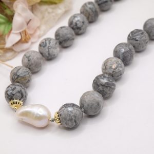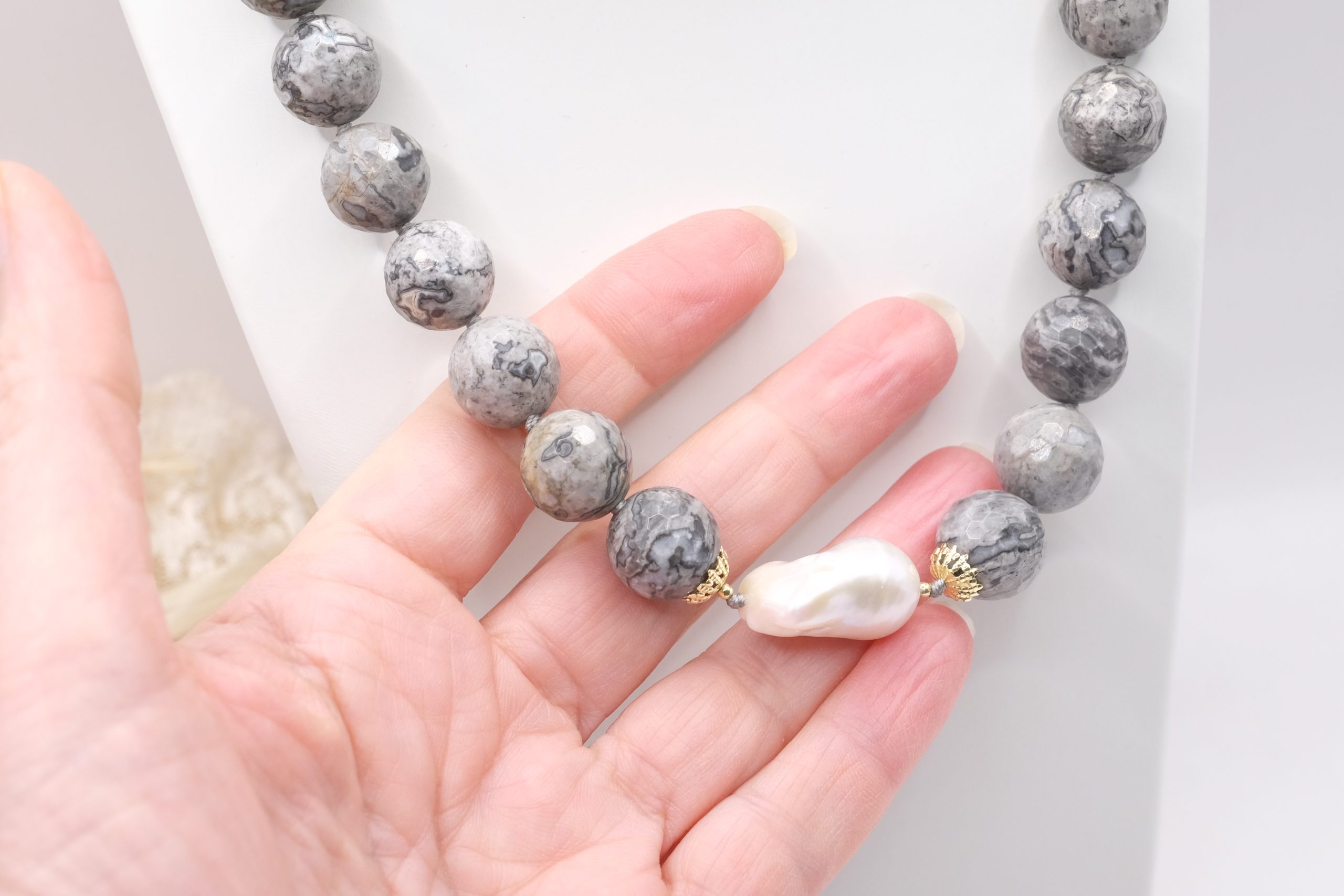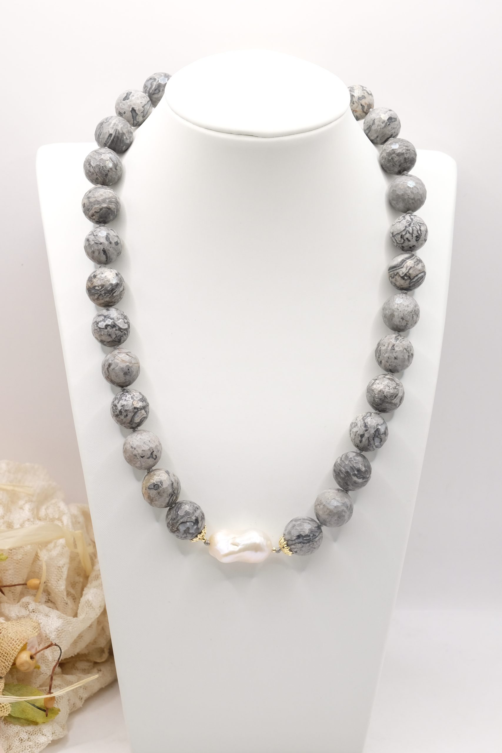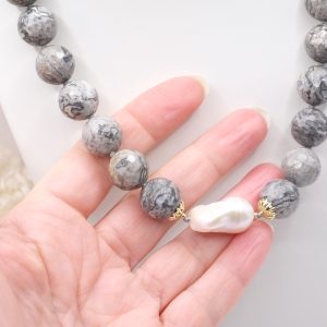 Collana meravigliosa in calcedonio da 15 mm e grande perla barocca grande 22 x 15 mm