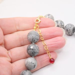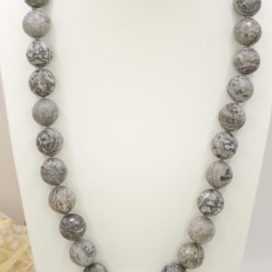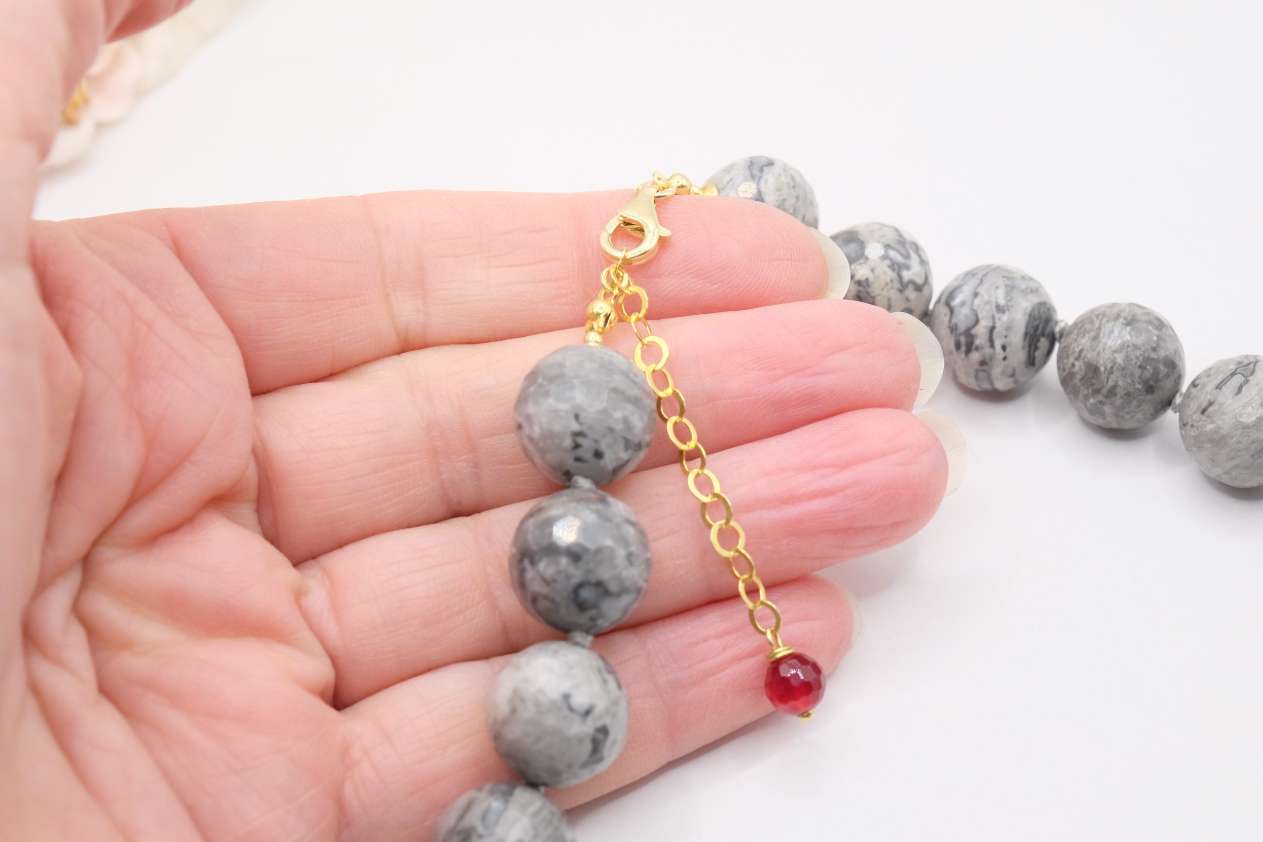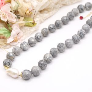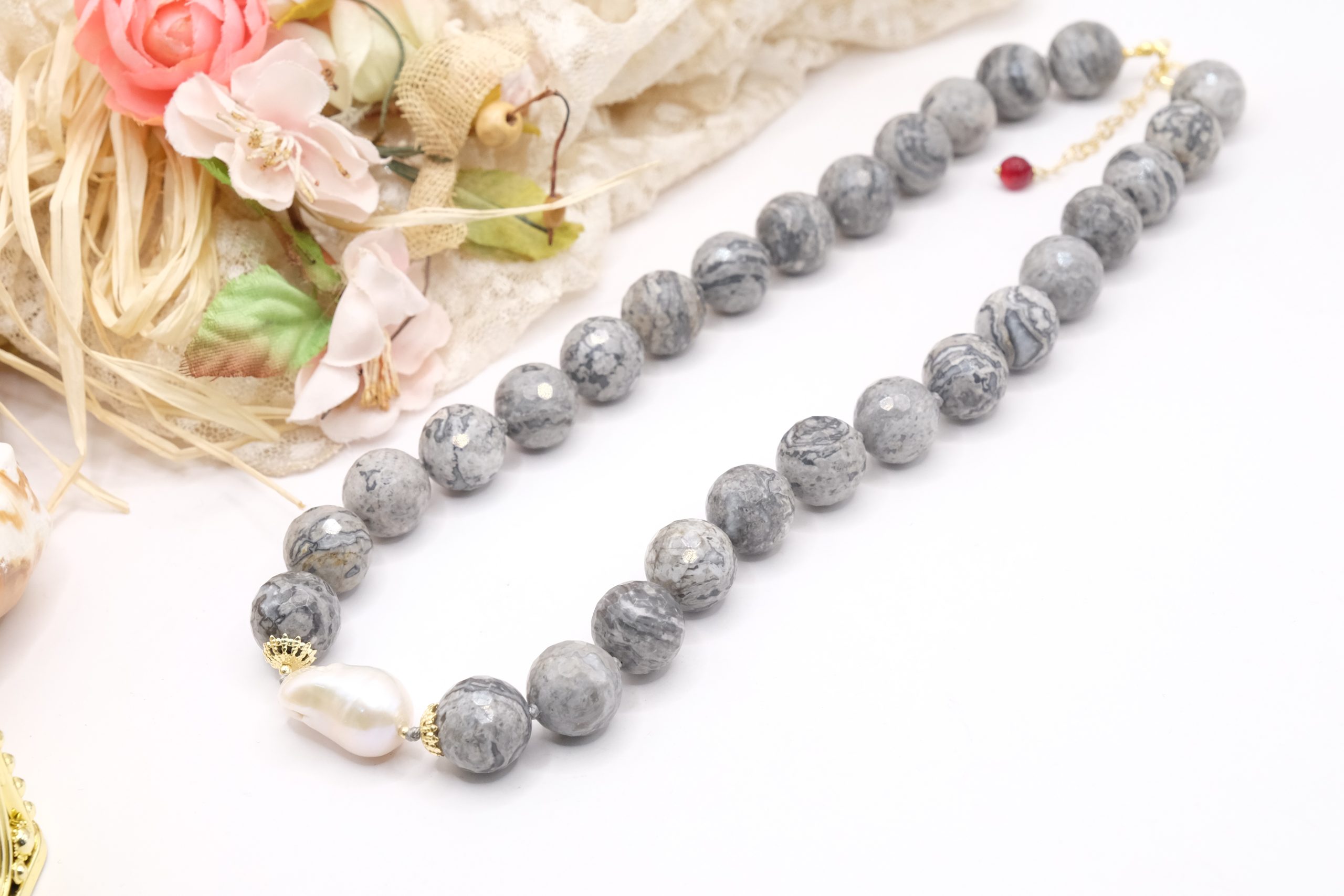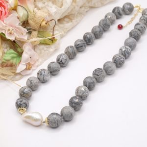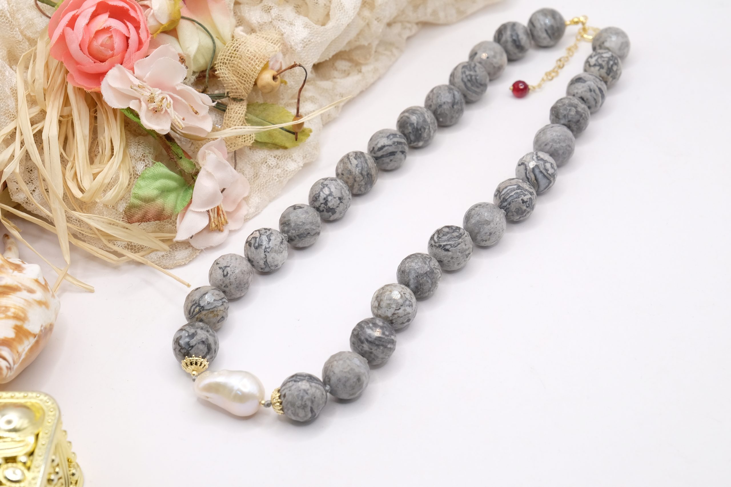 Collana meravigliosa in calcedonio da 15 mm e grande perla barocca grande 22 x 15 mm