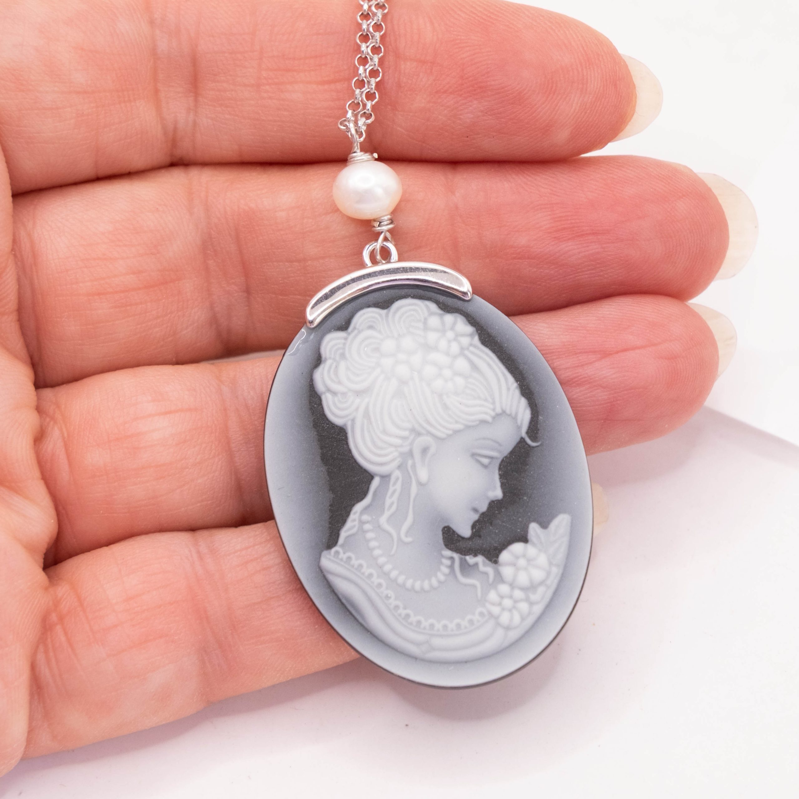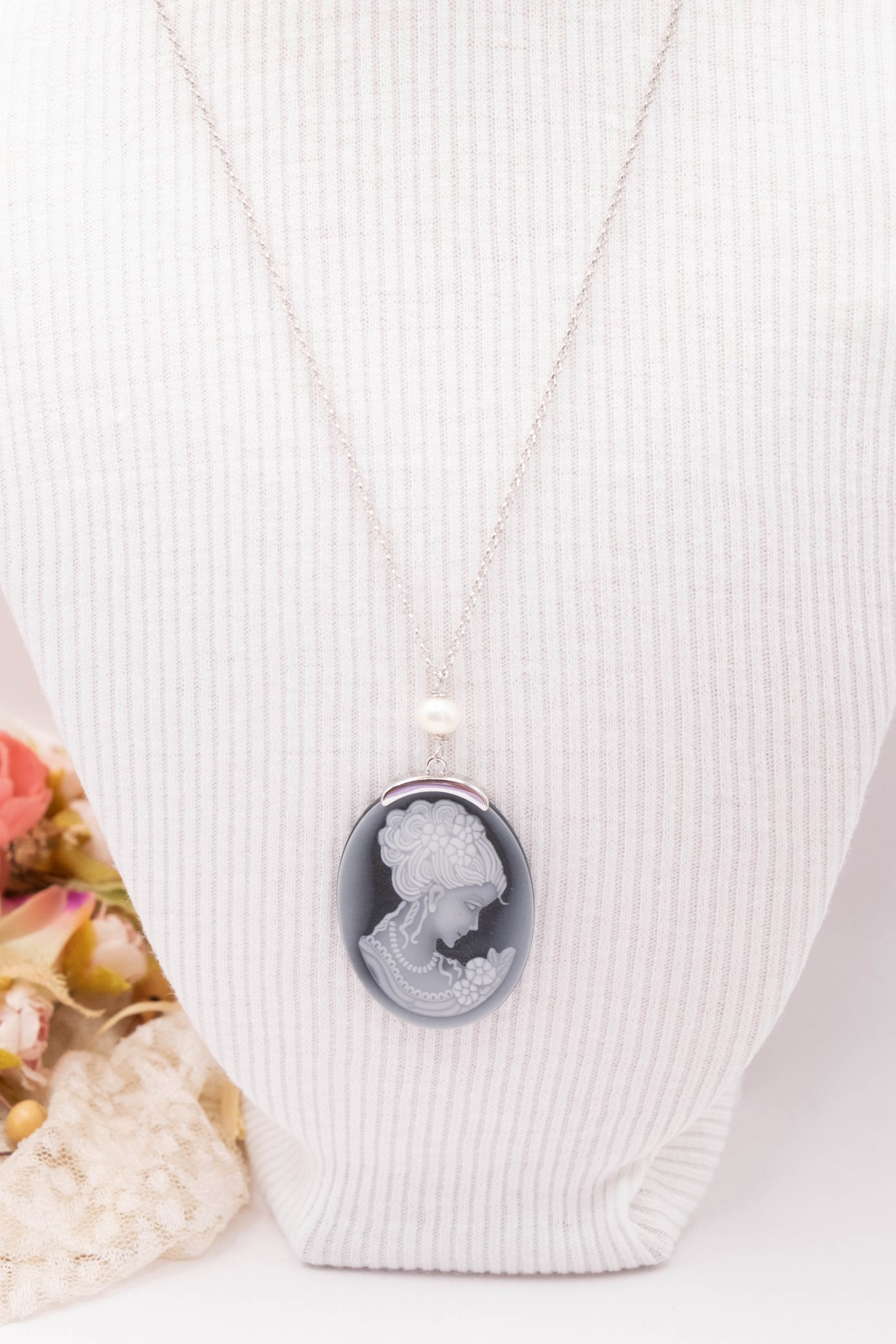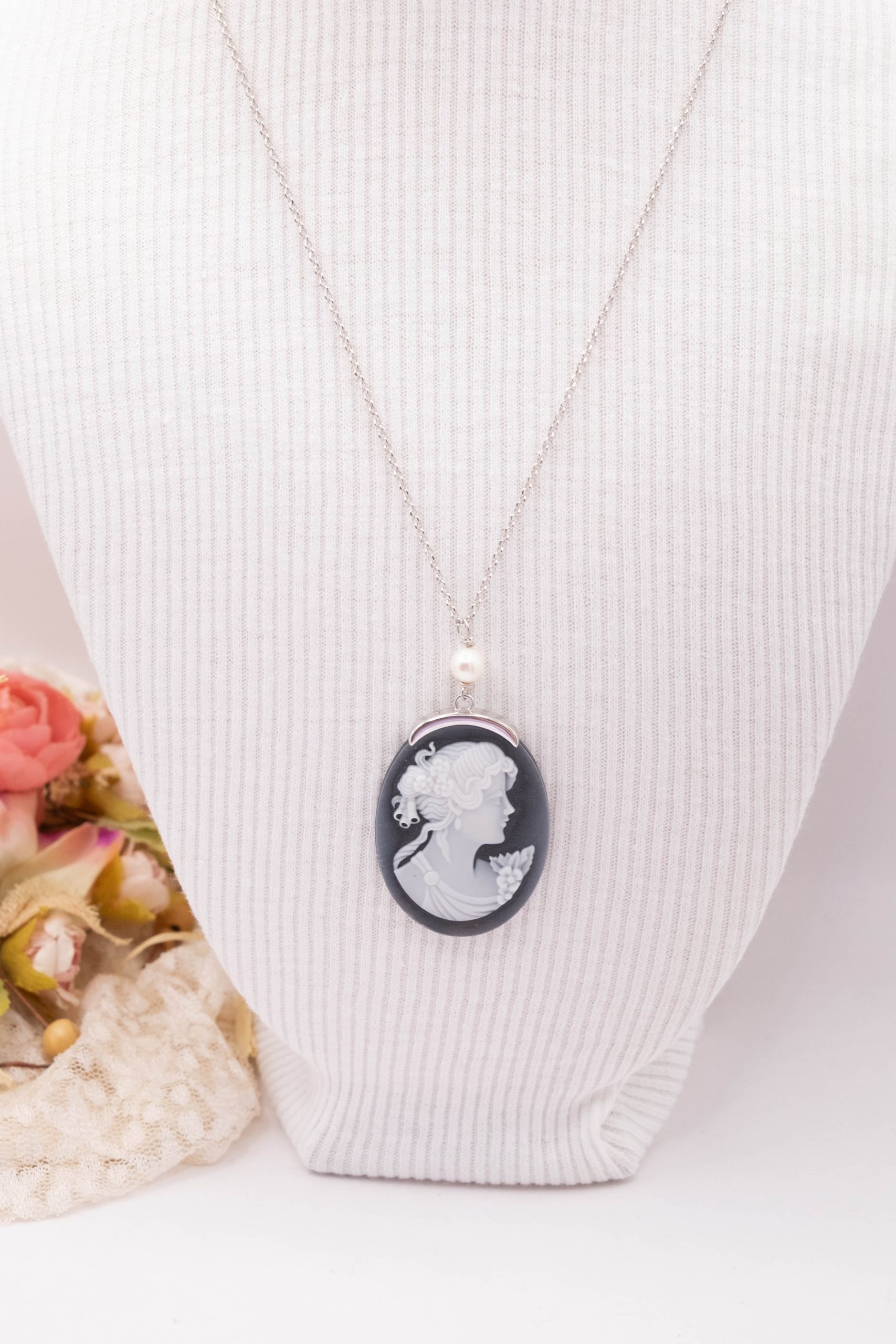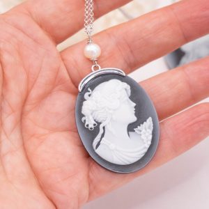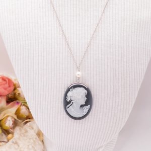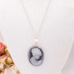 Collana cammeo volto dama agata nera perle argento rodiato 2 varianti