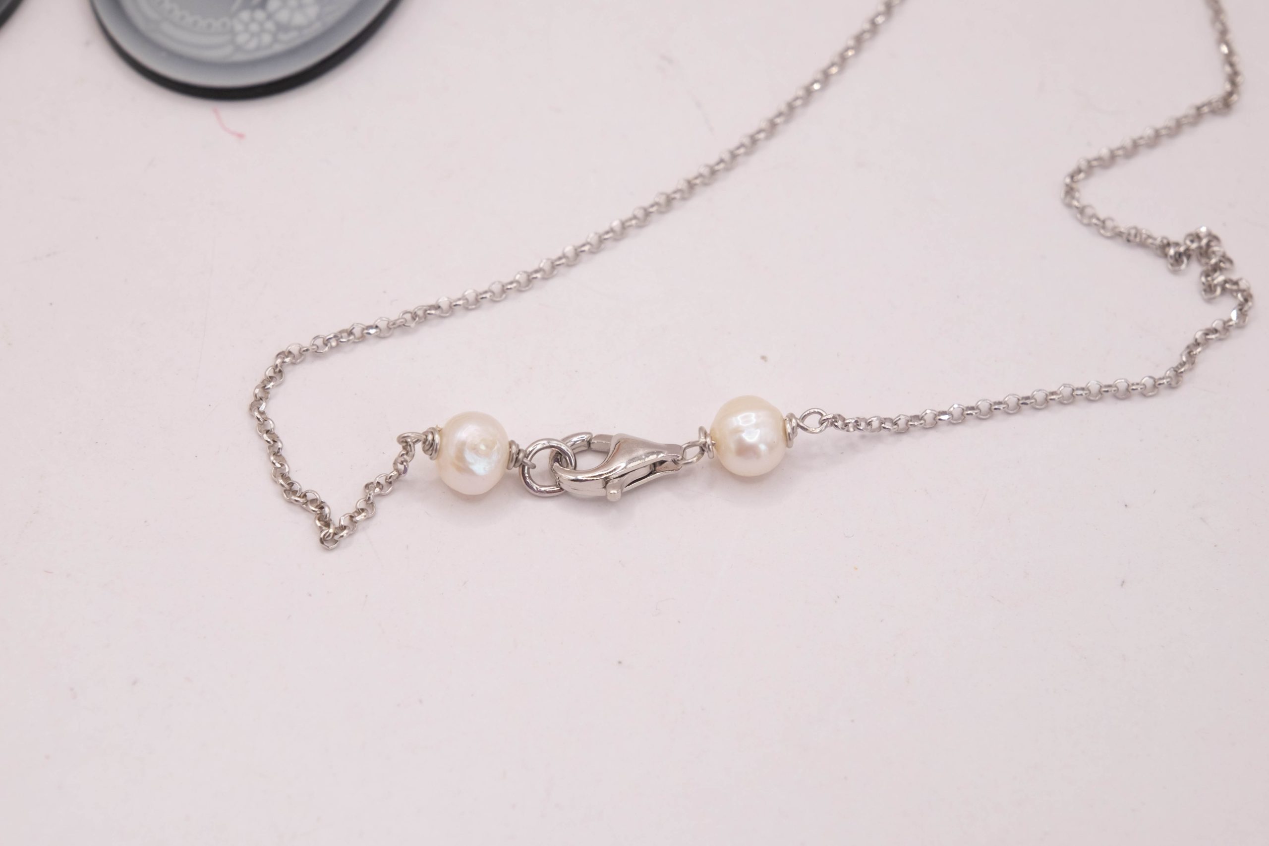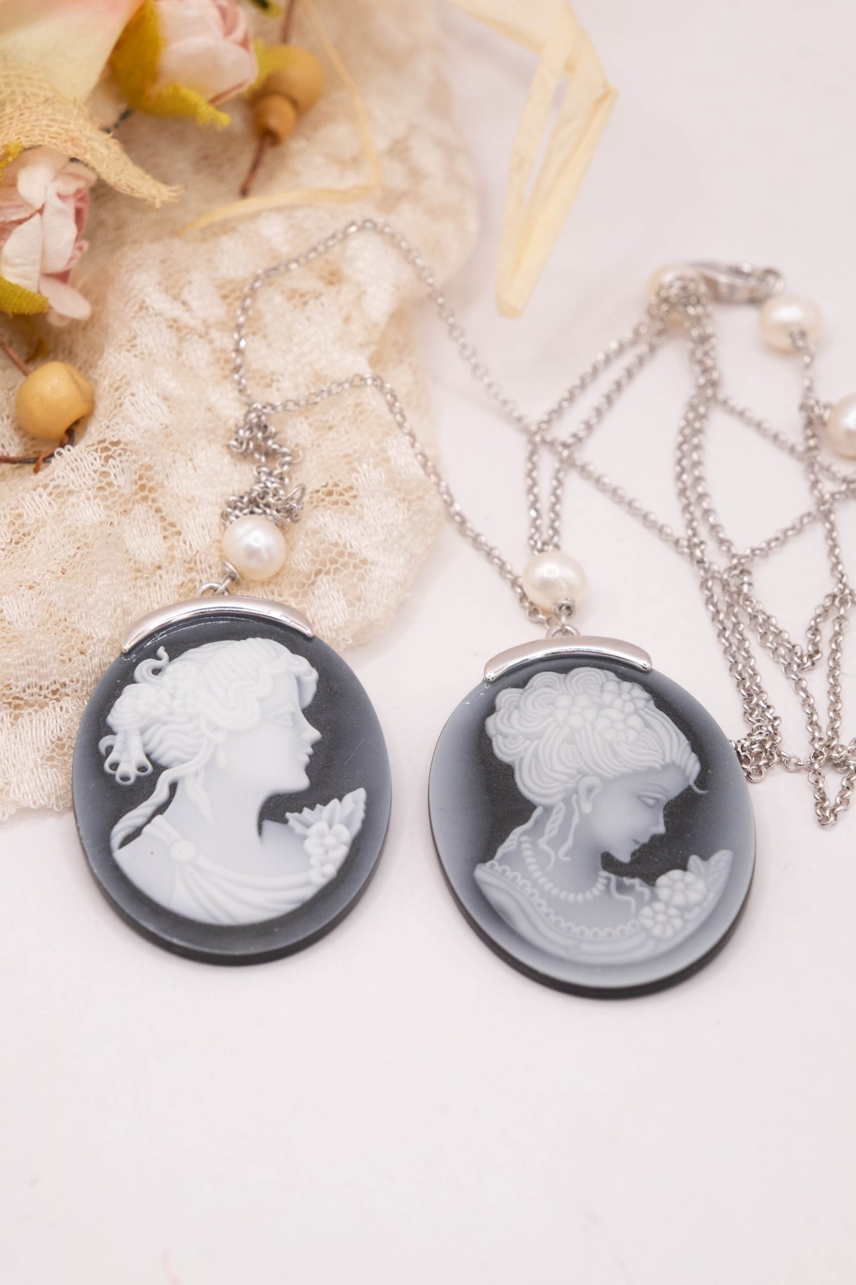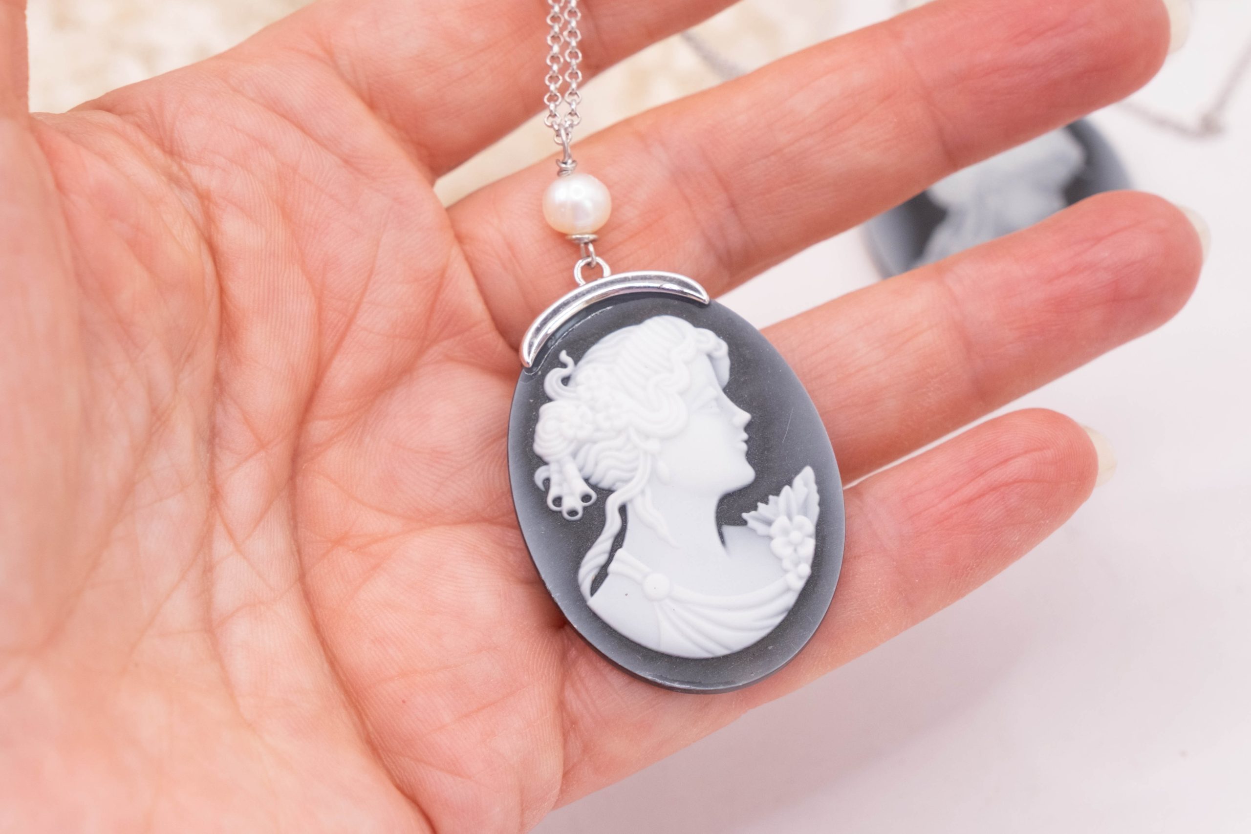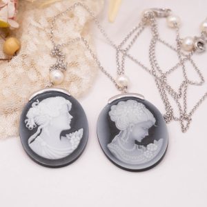 Collana cammeo volto dama agata nera perle argento rodiato 2 varianti