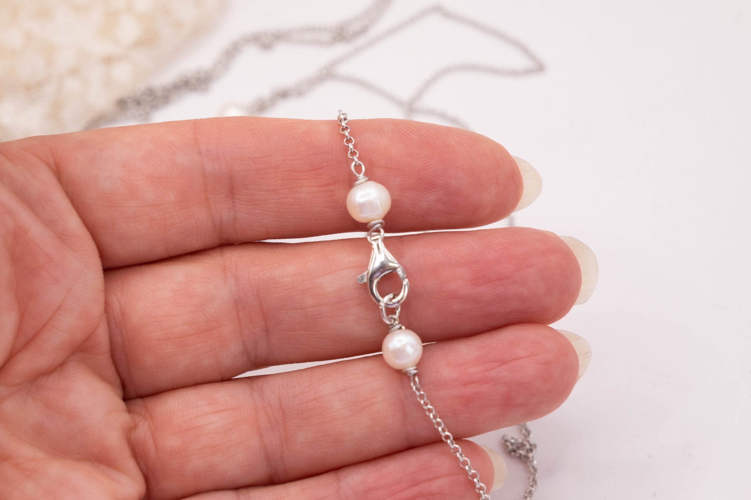 La catenina, realizzata a mano, con perle naturali alla chiusura e’ lunga 44 cm