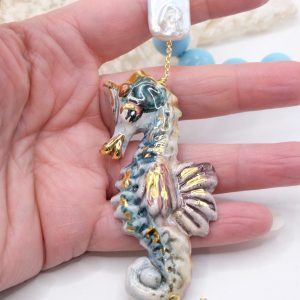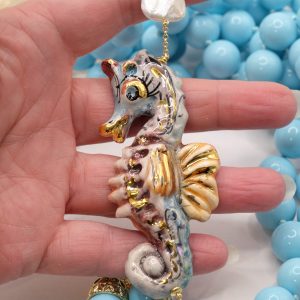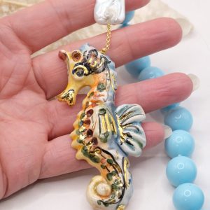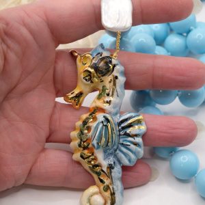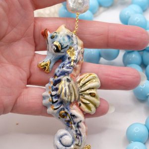 Collana magnifica, in pasta di turchese da 14mm, cavalluccio marino in ceramica di Caltagirone da 7,6 x 3,5 cm realizzato e decorato a mano con oro zecchino.