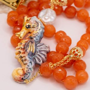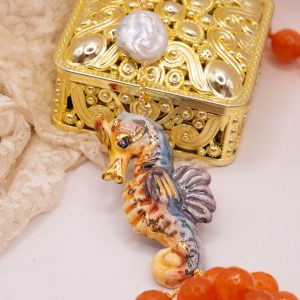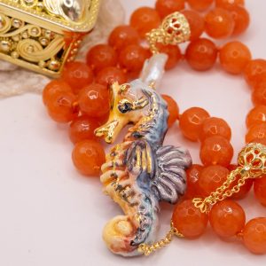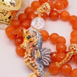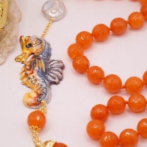 Collana magnifica, in corniola sfaccettata da 14mm, cavalluccio marino in ceramica di Caltagirone da 7,6 x 3,5 cm realizzato e decorato a mano con oro zecchino.