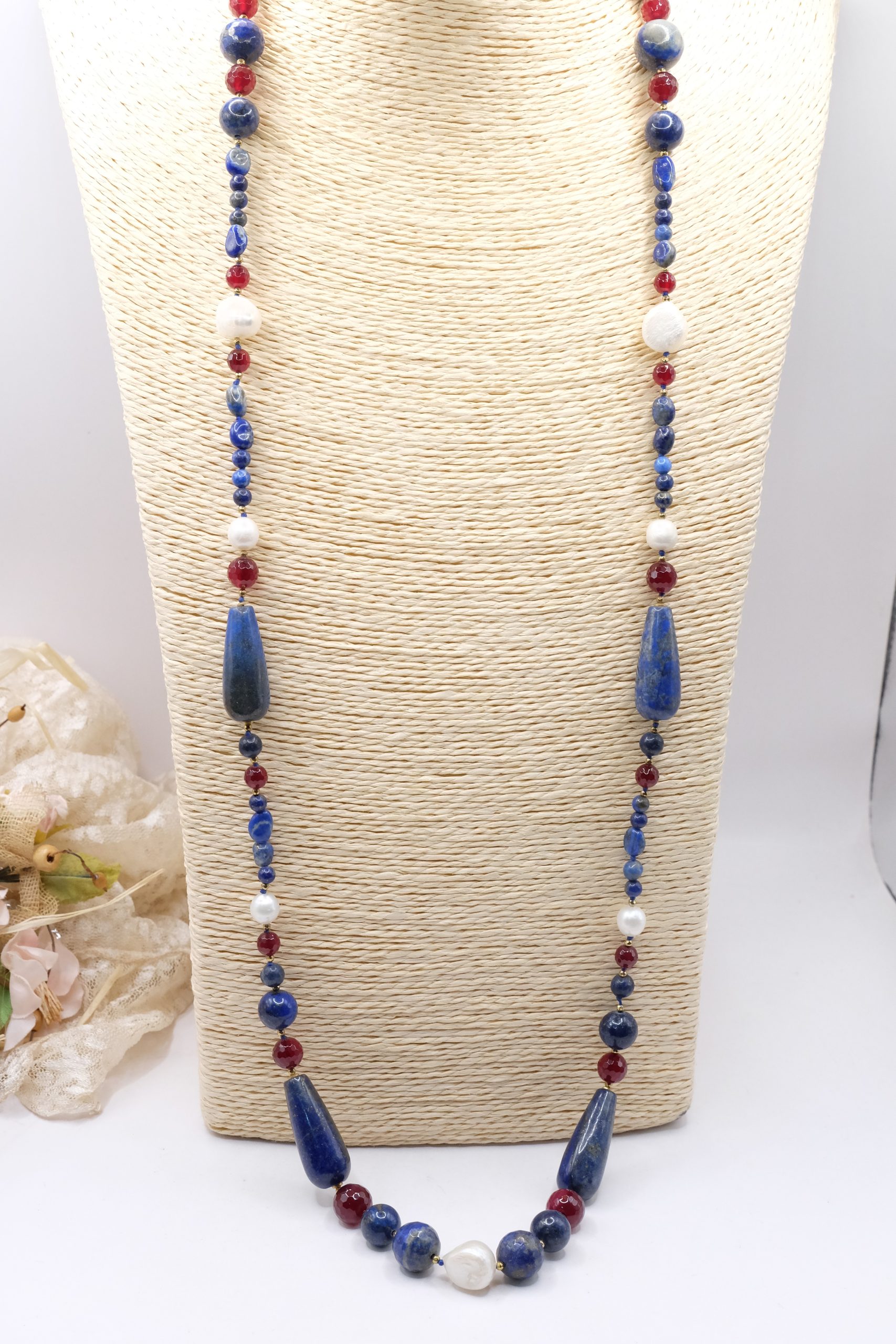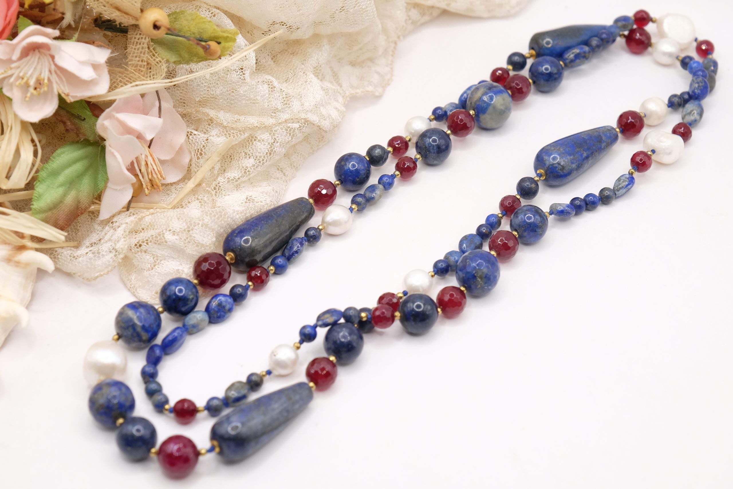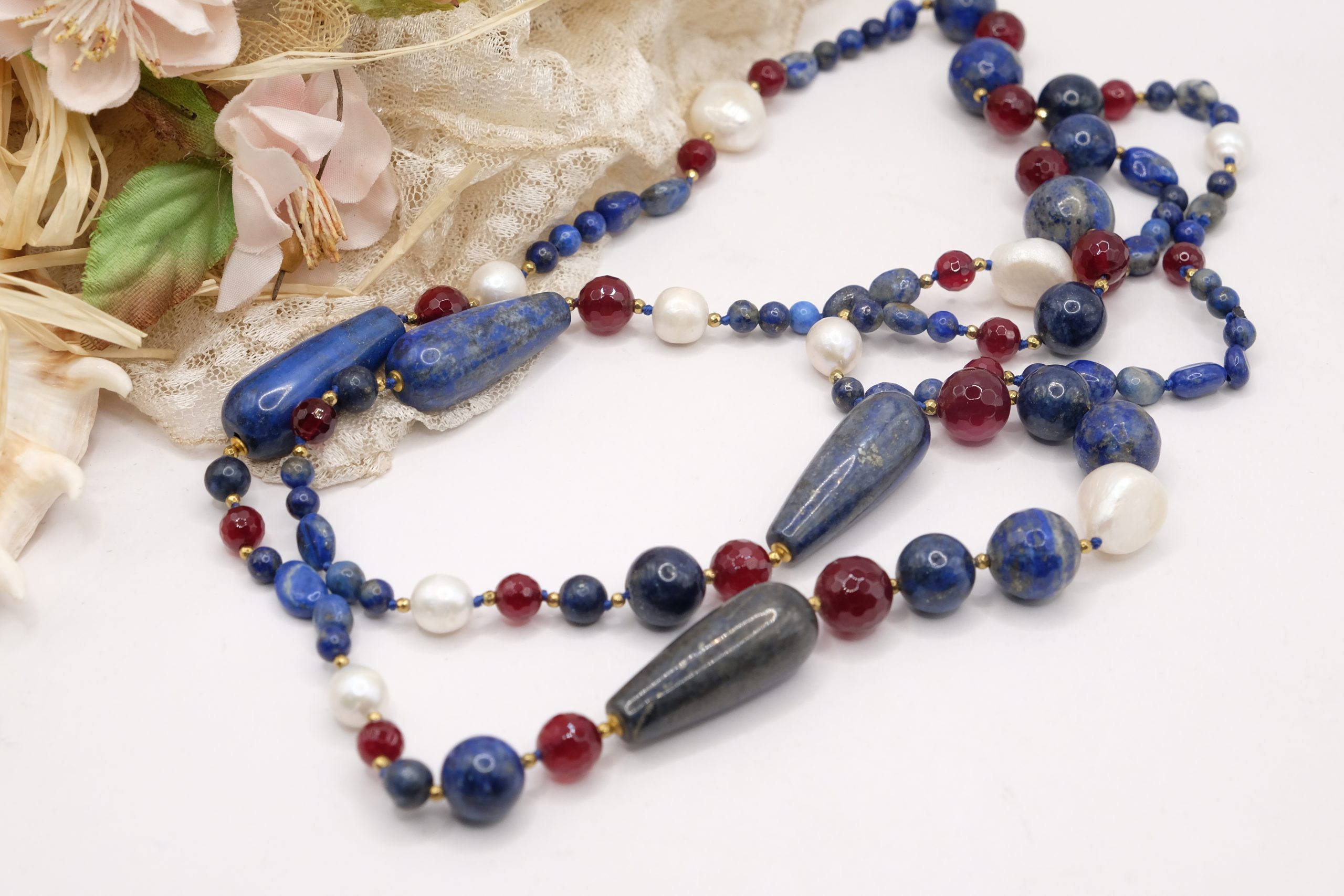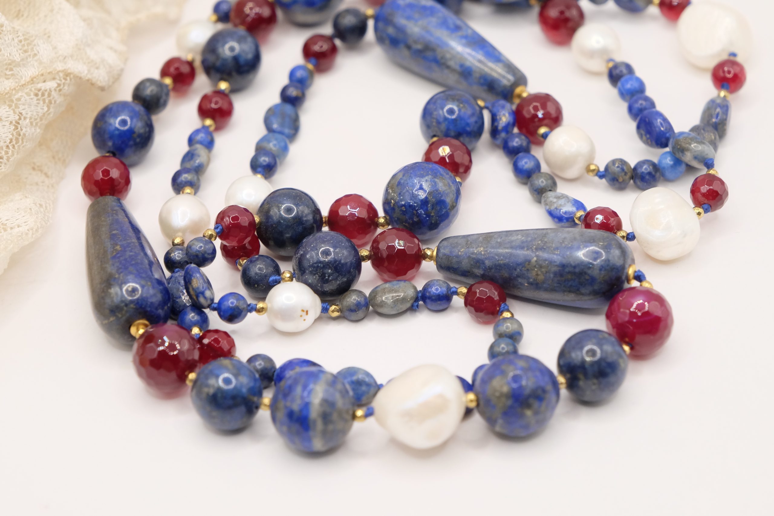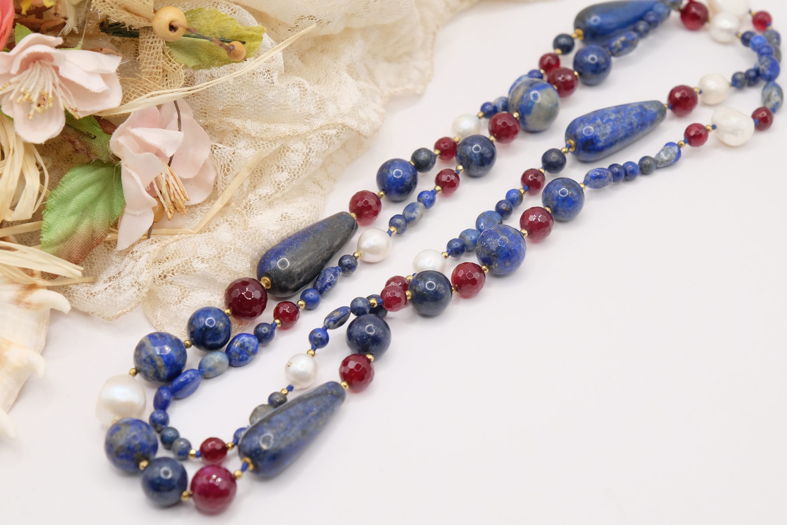 Aggiungi un tocco di eleganza e fascino al tuo look con questa elegante collana stile Chanel (o charleston) in Lapislazuli di vari tagli e dimensioni e perle naturali, giada borgogna, il tutto illuminato da ematite brillante