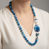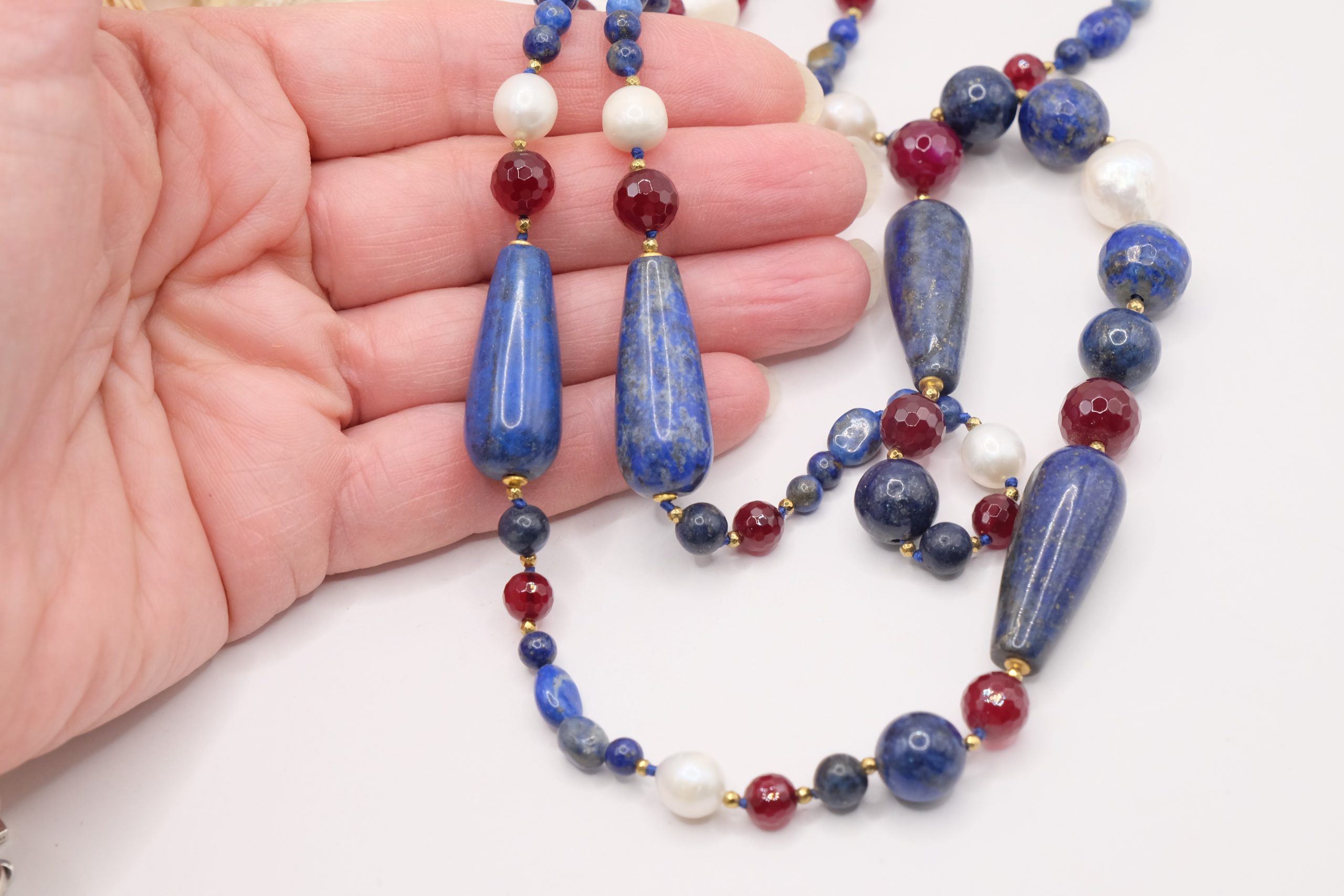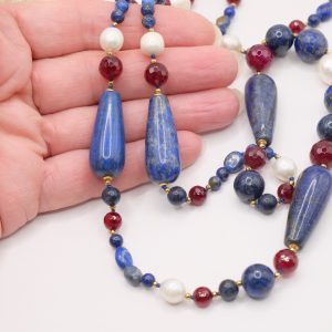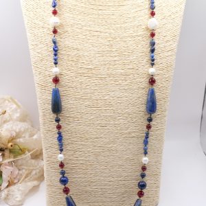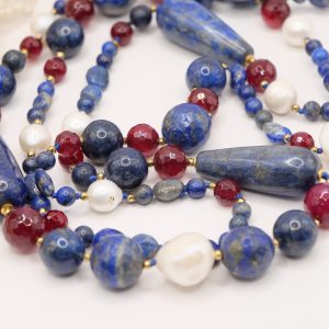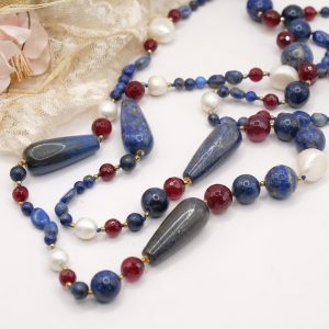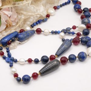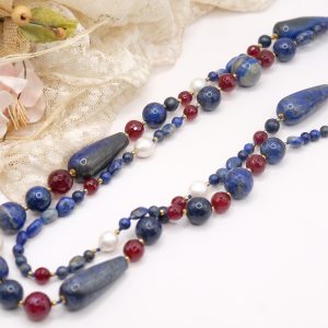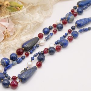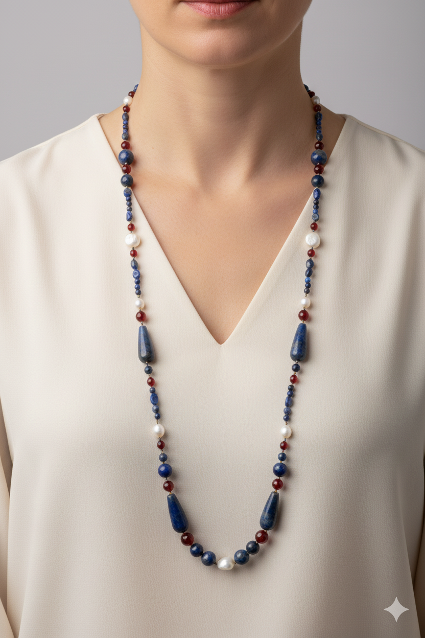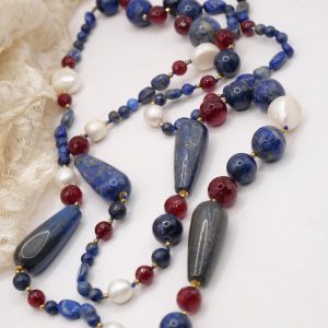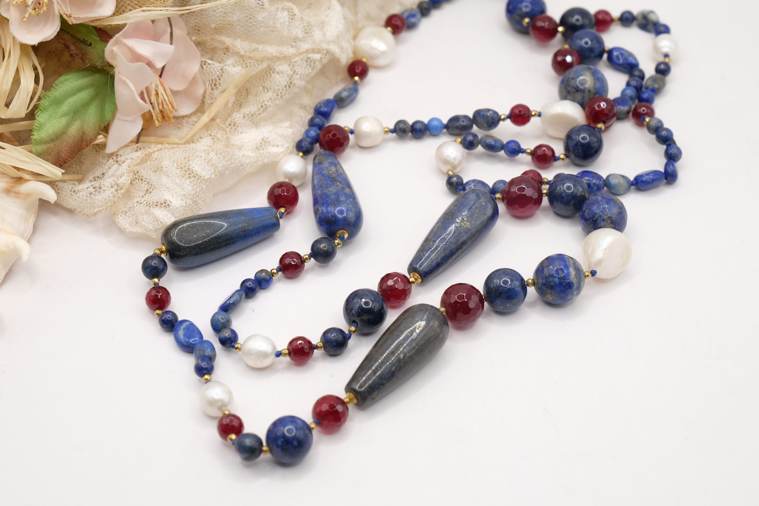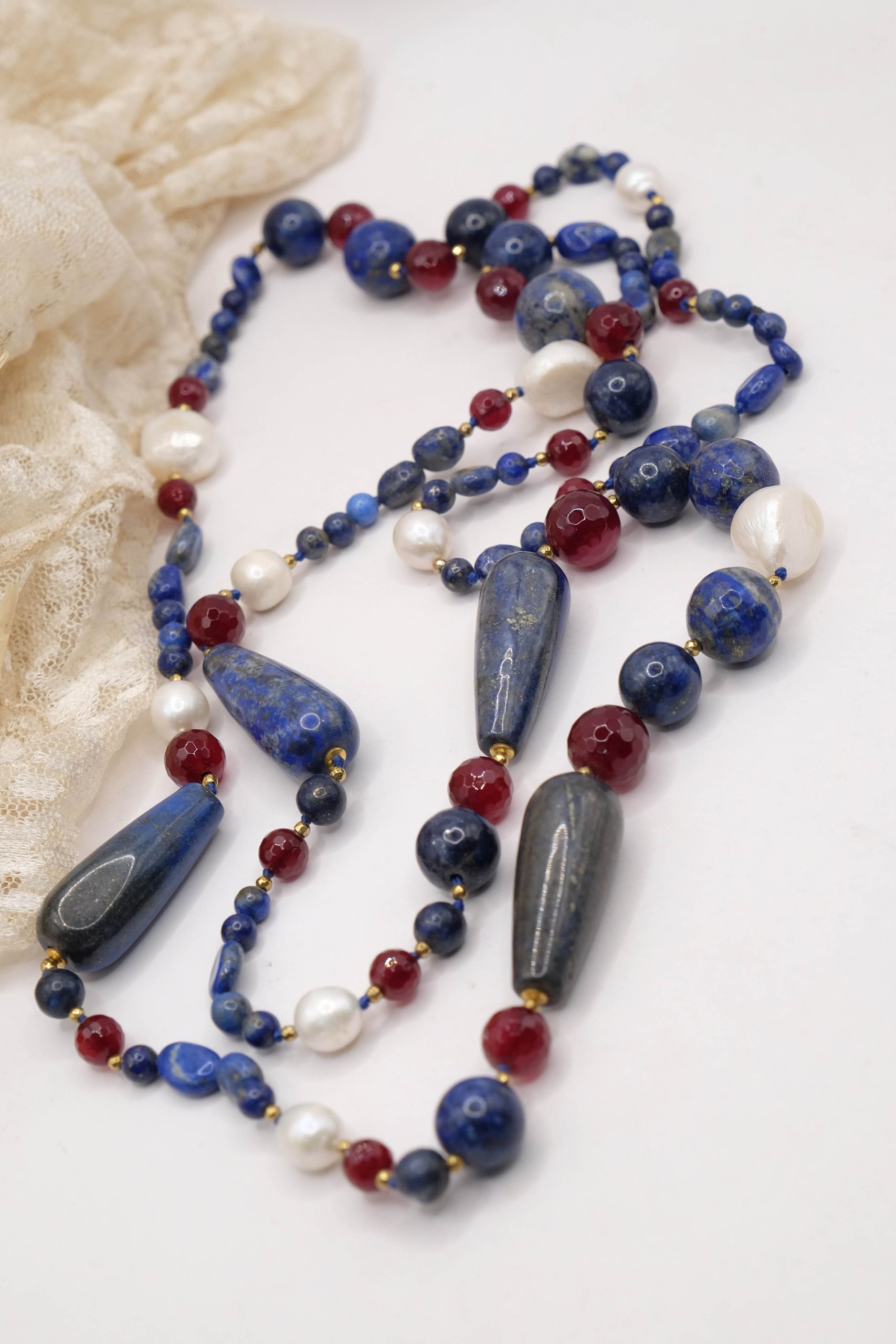 Aggiungi un tocco di eleganza e fascino al tuo look con questa elegante collana stile Chanel (o charleston) in Lapislazuli di vari tagli e dimensioni e perle naturali, giada borgogna, il tutto illuminato da ematite brillante