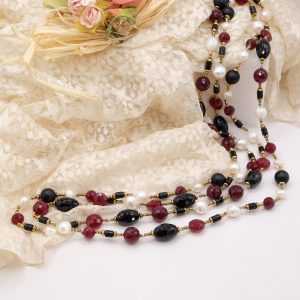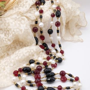 Questa collana lunga stile Charleston/Chanel unisce Giada borgogna, Onice, Perle ed Ematite gold in un raffinato gioco di colori e forme.