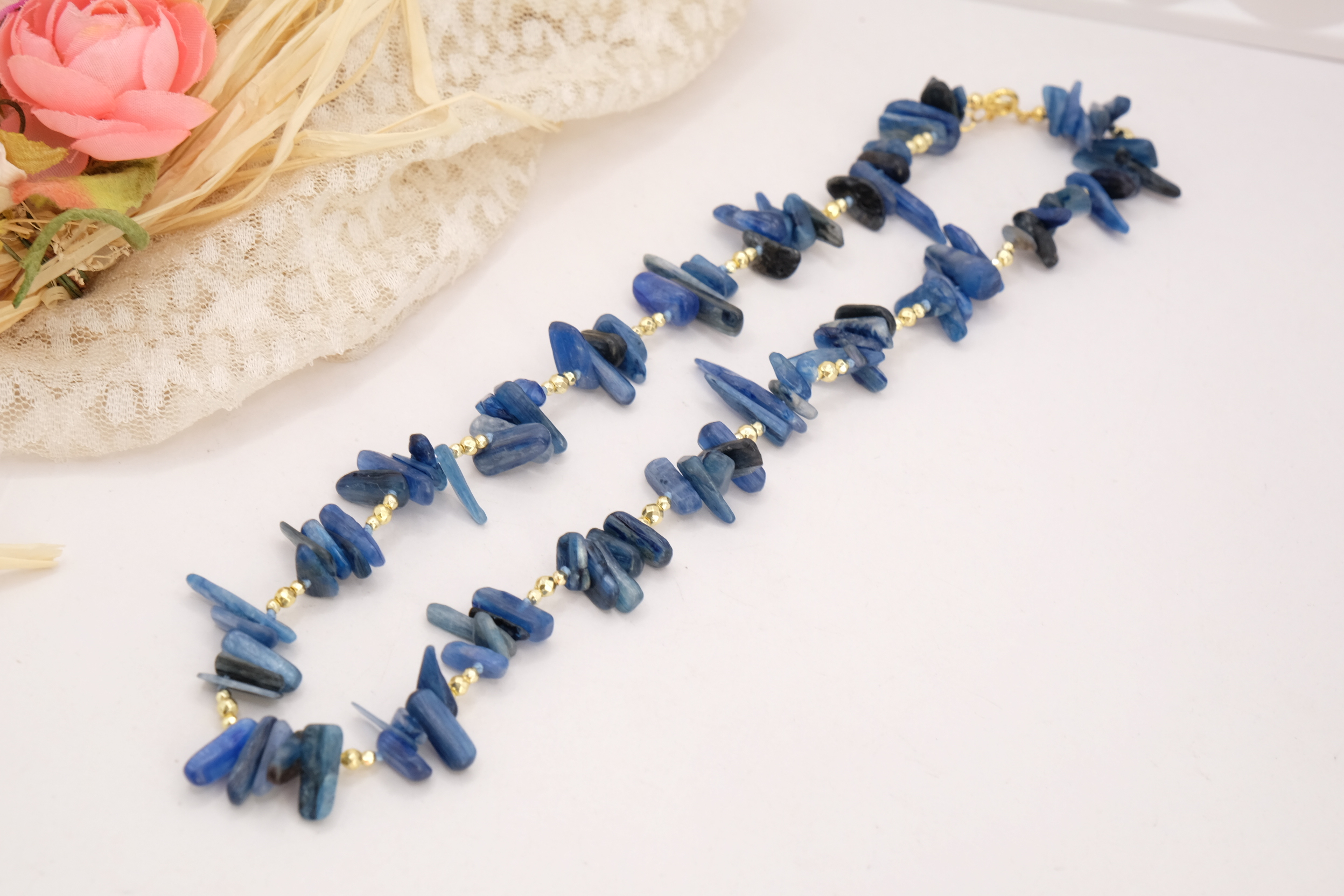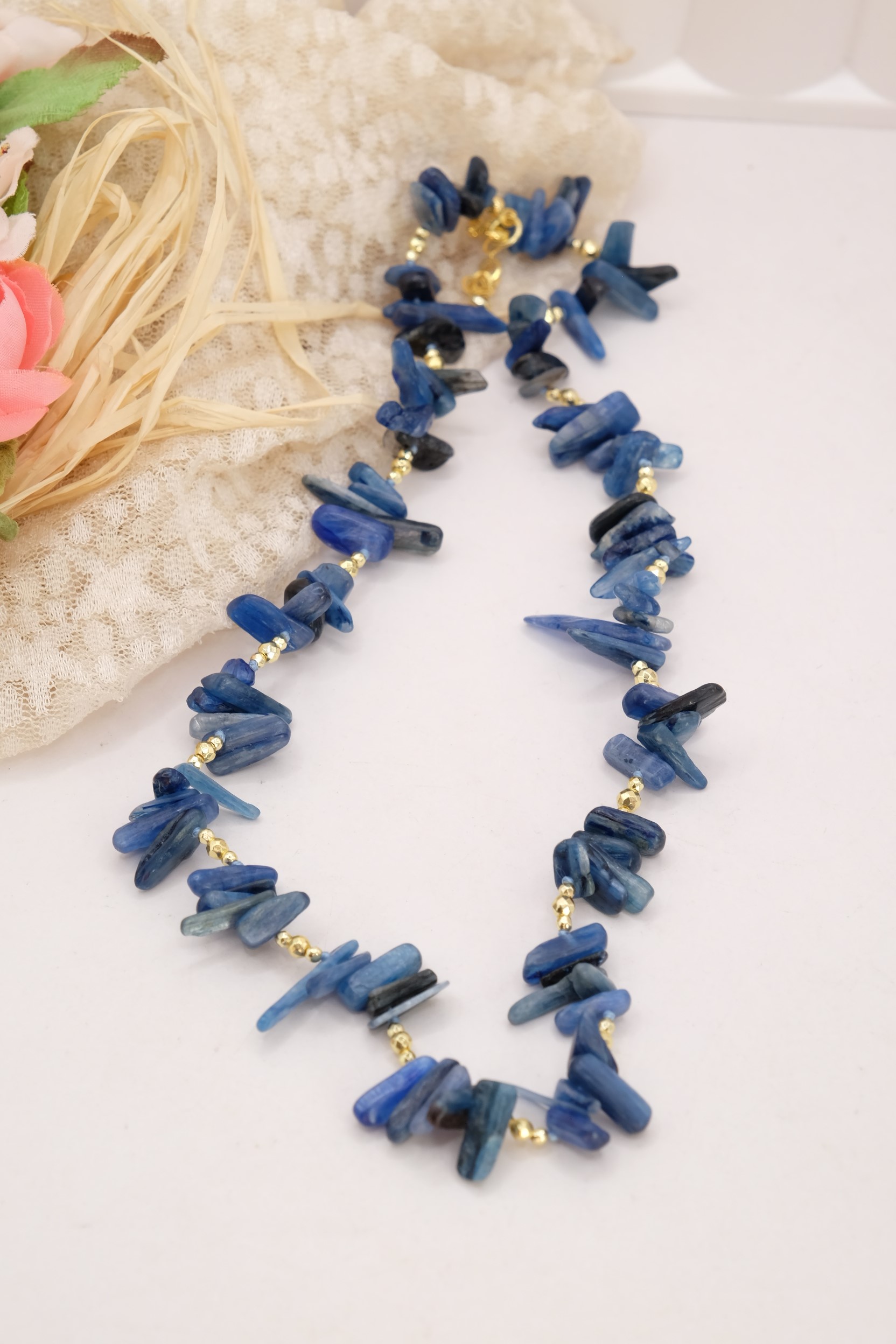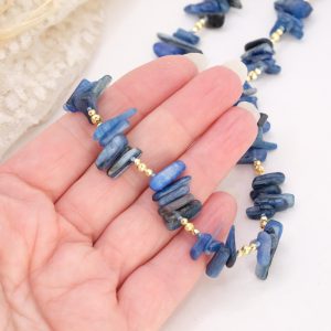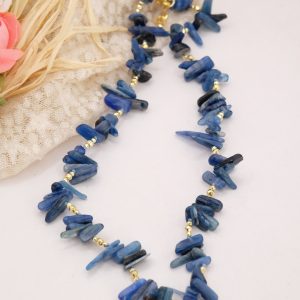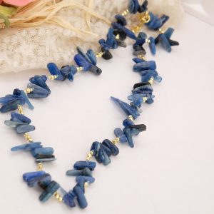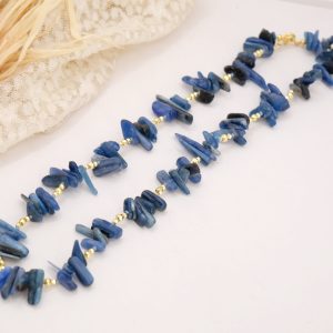 Elegante collana realizzata con chips grandi di Lapis naturale, caratterizzate da sfumature uniche e irregolari che rendono ogni pezzo autentico e irripetibile. Le pietre sono alternate a dettagli in ematite gold, che donano luminosità e un tocco sofisticato.