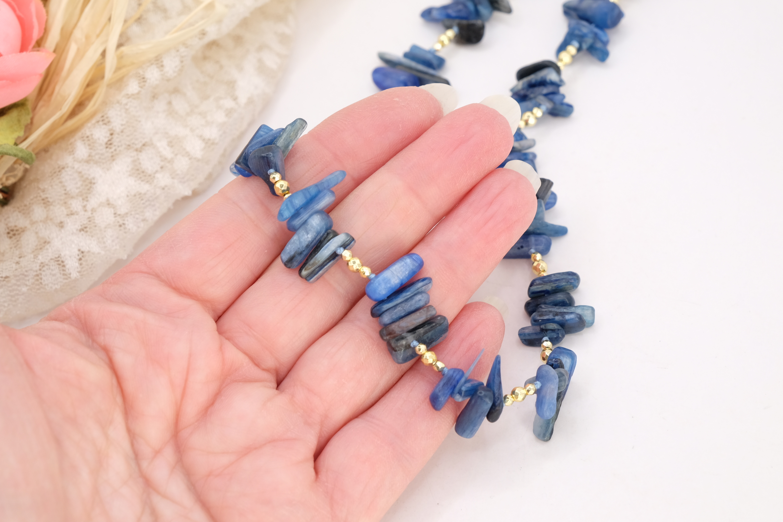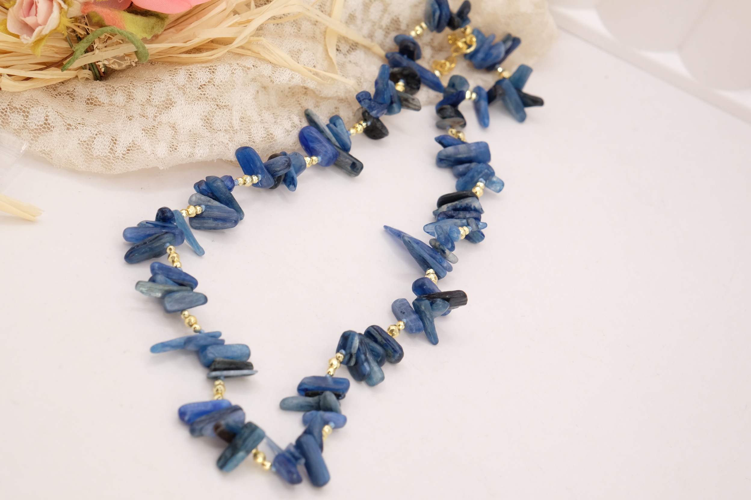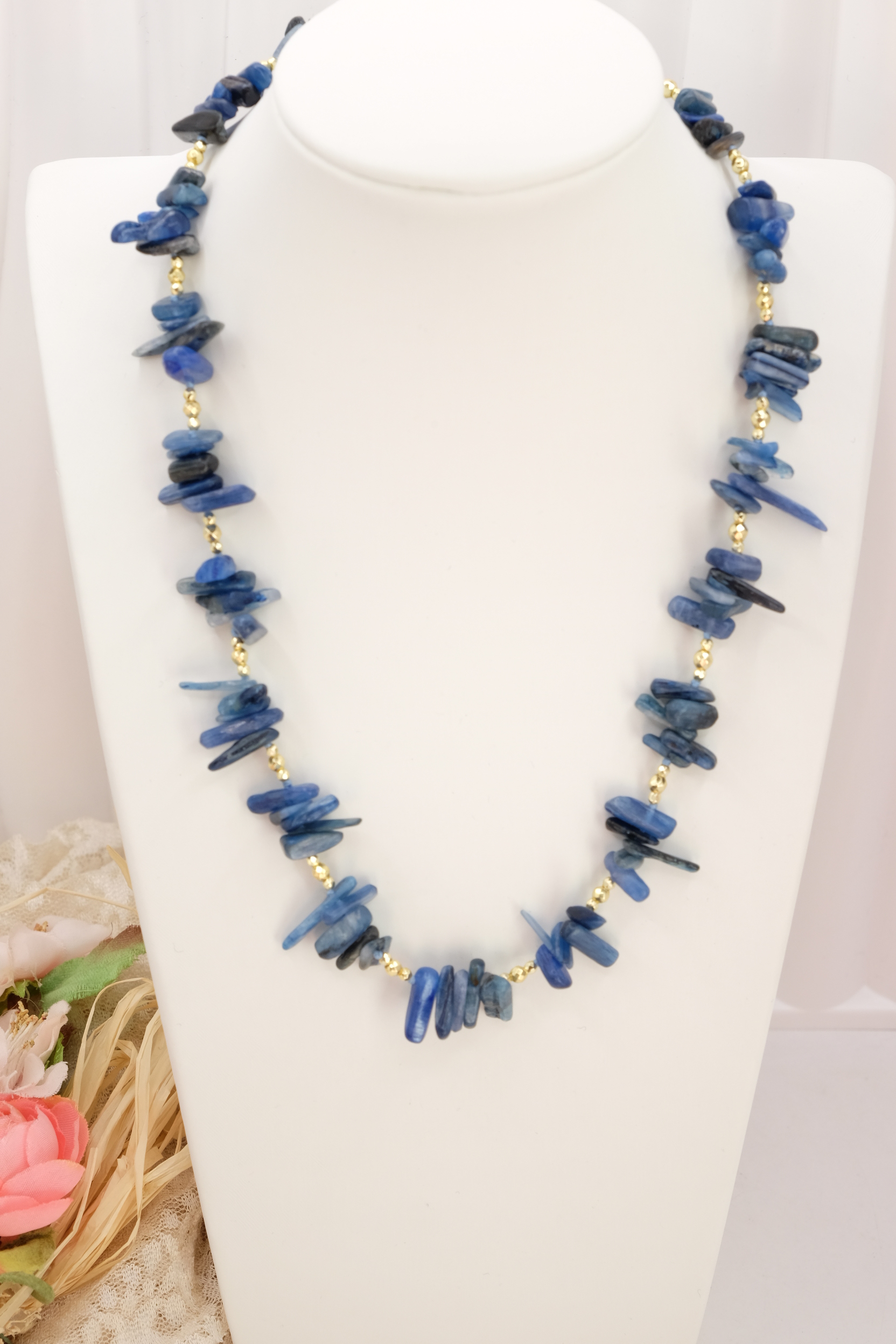 Elegante collana realizzata con chips grandi di Lapis naturale, caratterizzate da sfumature uniche e irregolari che rendono ogni pezzo autentico e irripetibile. Le pietre sono alternate a dettagli in ematite gold, che donano luminosità e un tocco sofisticato.