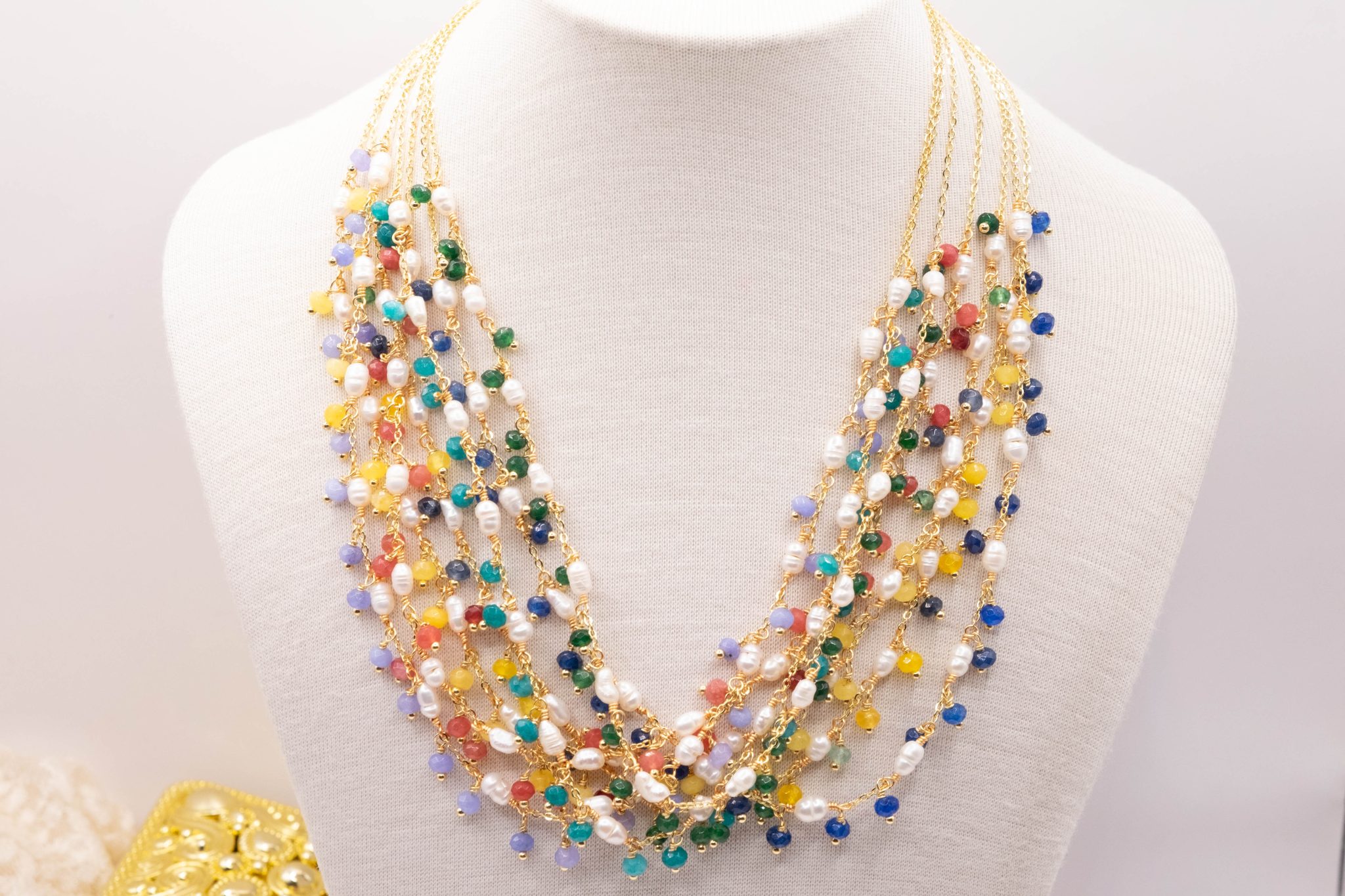 Un tocco di luce e femminilità per ogni giorno. Collana artigianale in ottone lavorato a rosario, impreziosita da Perle Naturali e delicati ciondoli in pietre dure naturali. Ogni dettaglio è realizzato a mano con cura e passione. Indossarla significa aggiungere eleganza al tuo stile con semplicità. Lunghezza totale 51 cm, regolabile grazie alla catenina. Dal vivo è ancora più bella: le foto non riescono a catturare tutta la sua grazia.