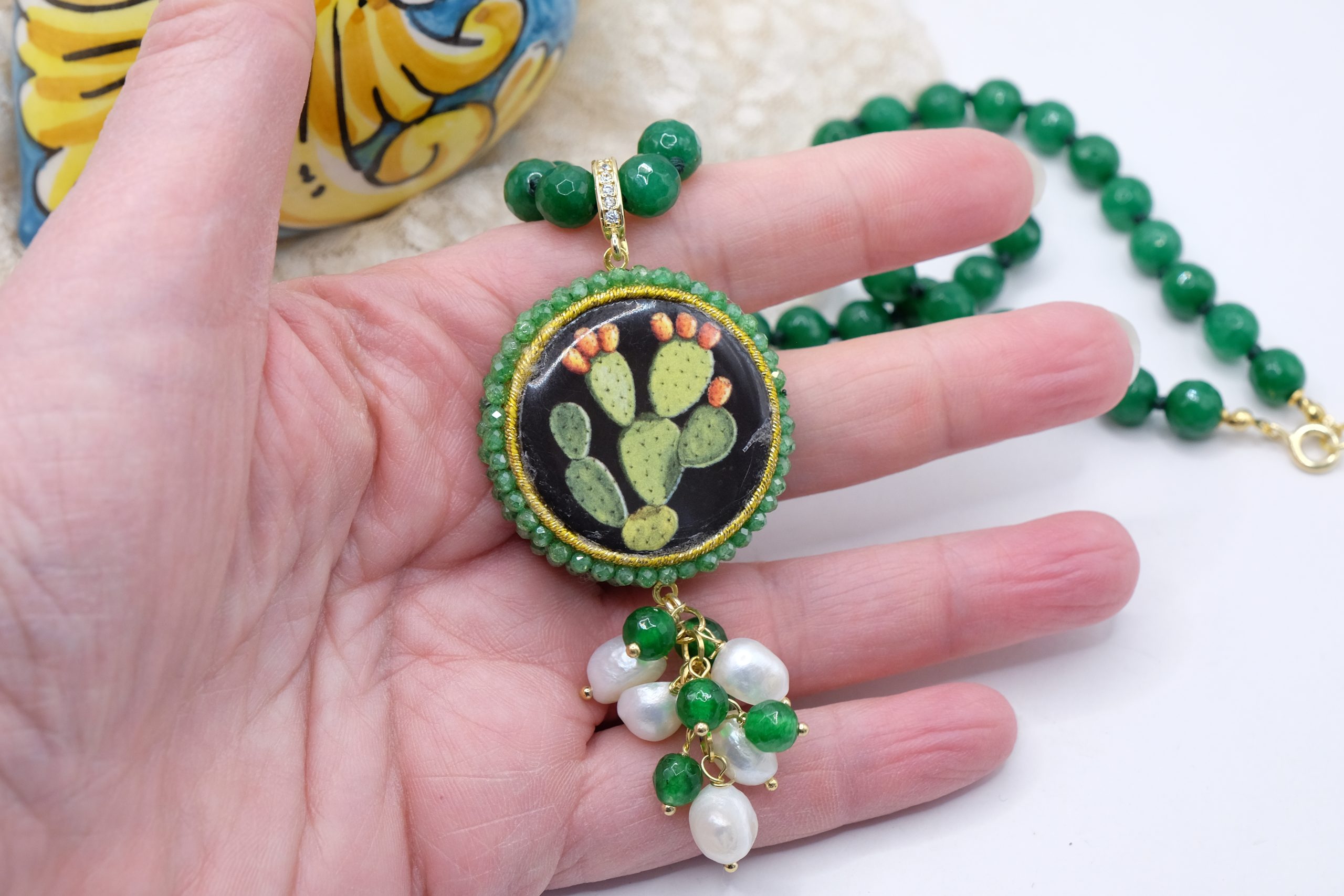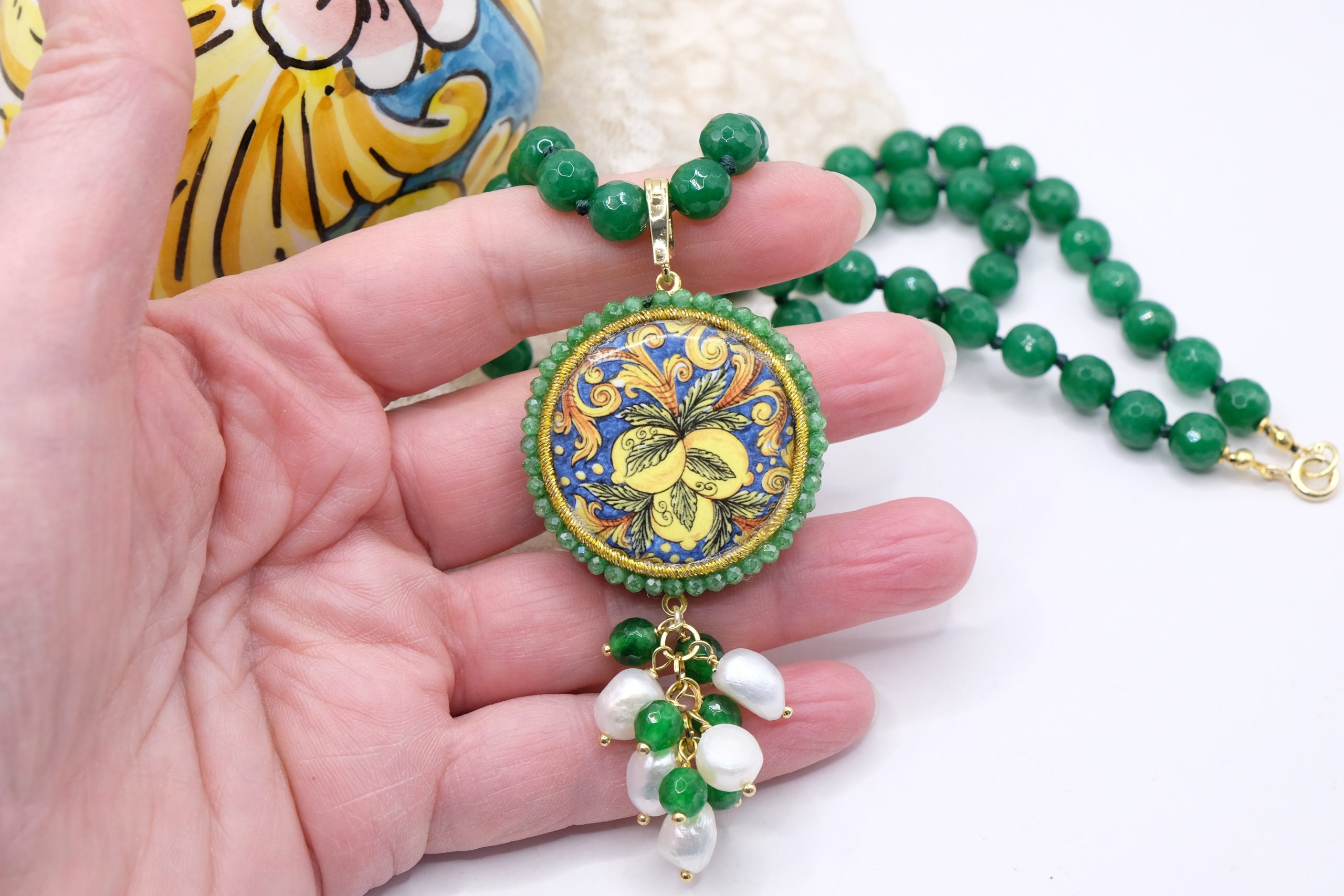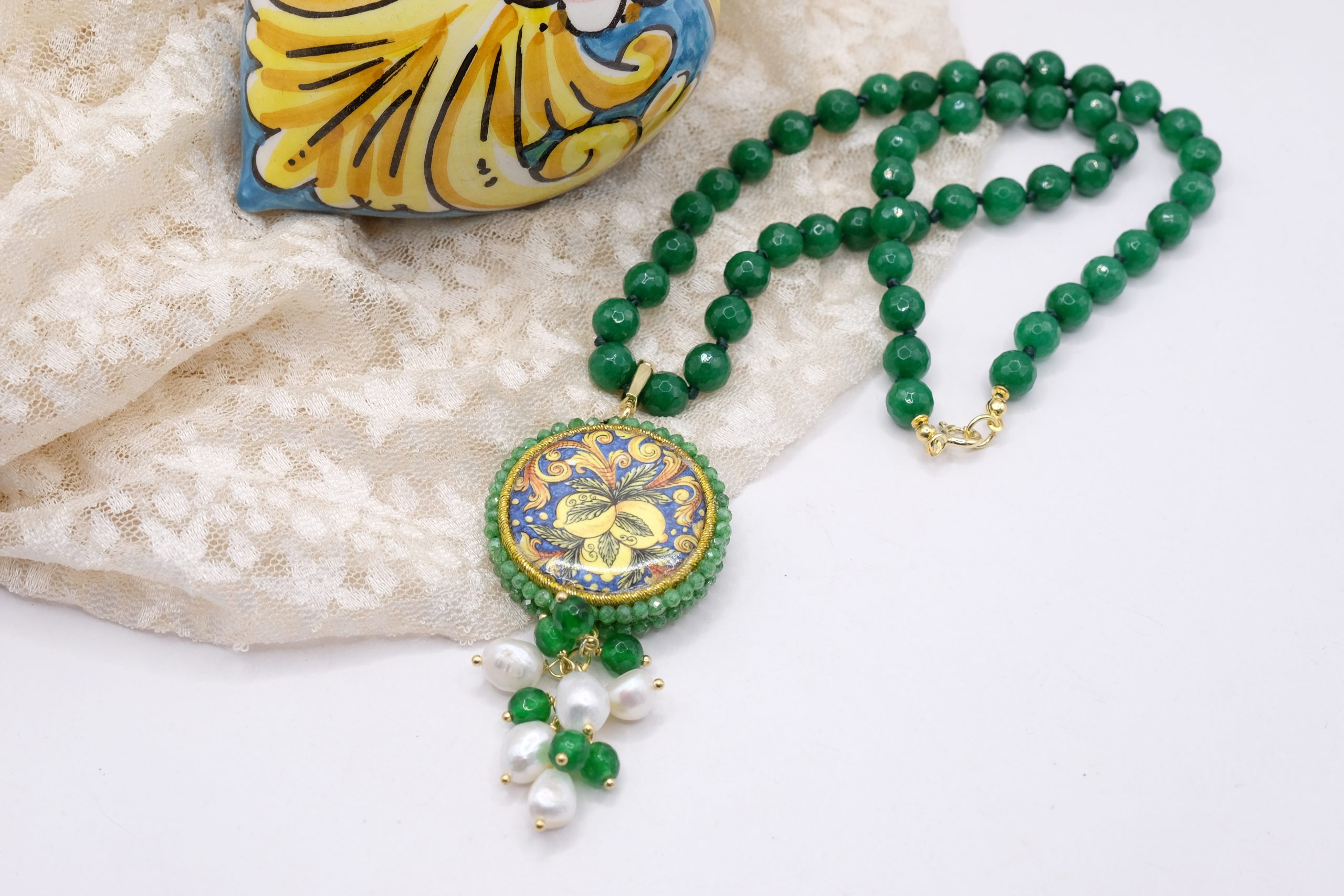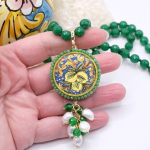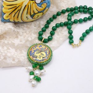 fatta interamente a mano, con pendente in doppia mattonella a lavorazione sautache con passamaneria e micropietre, staccabile, in ceramica di Caltagirone, finemente decorata a mano da entrambi i lati e collana in giada Verde