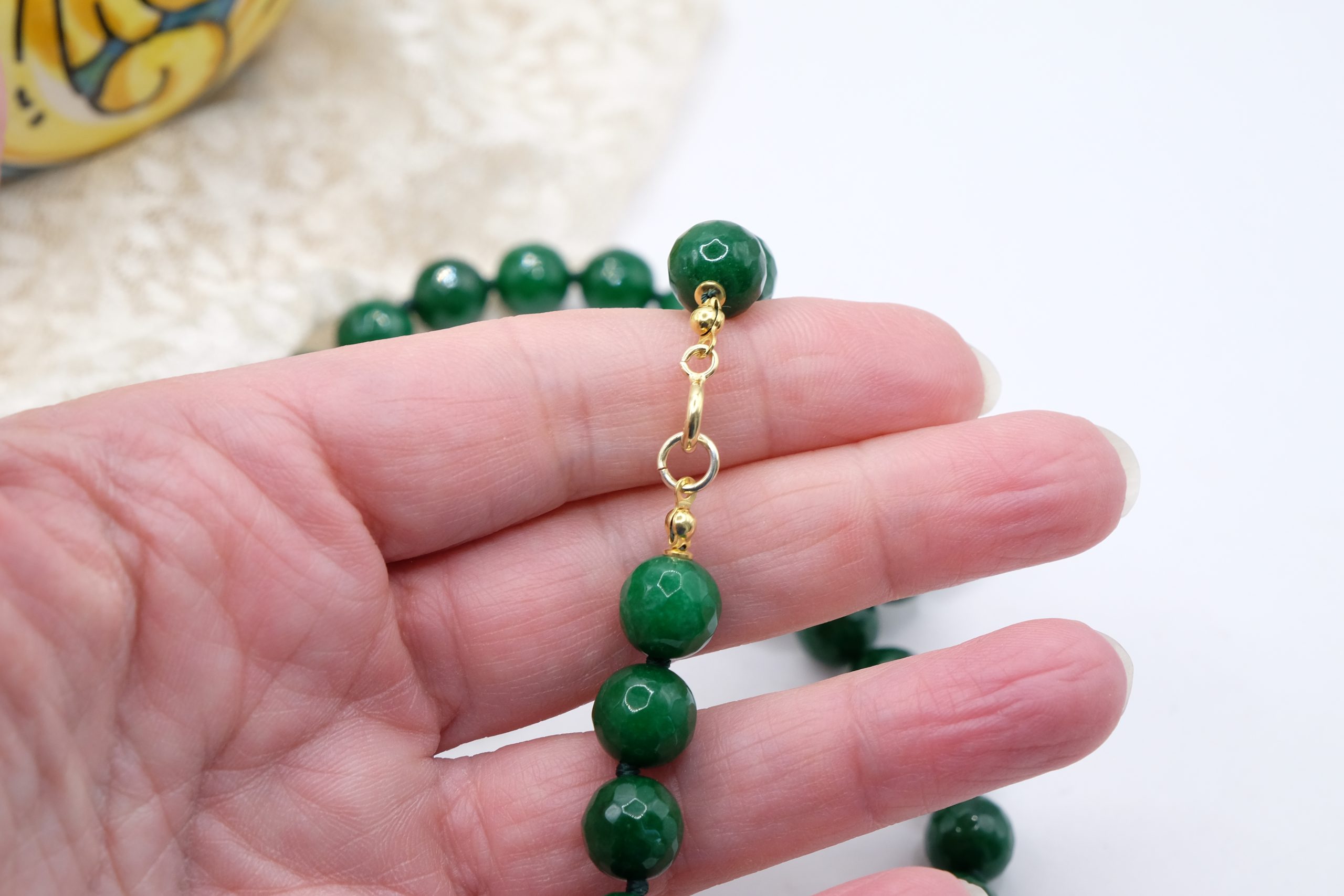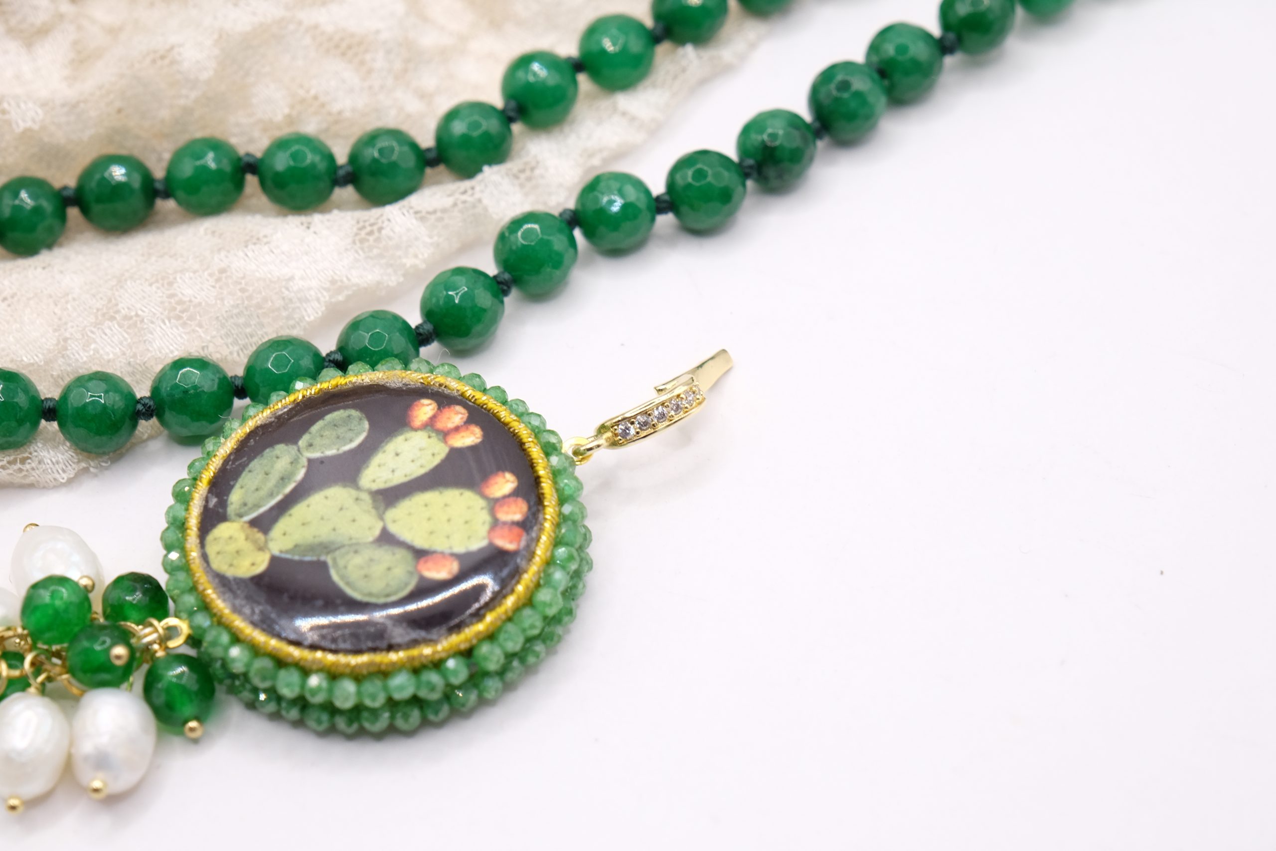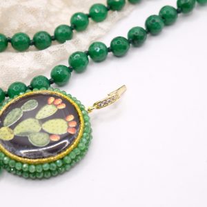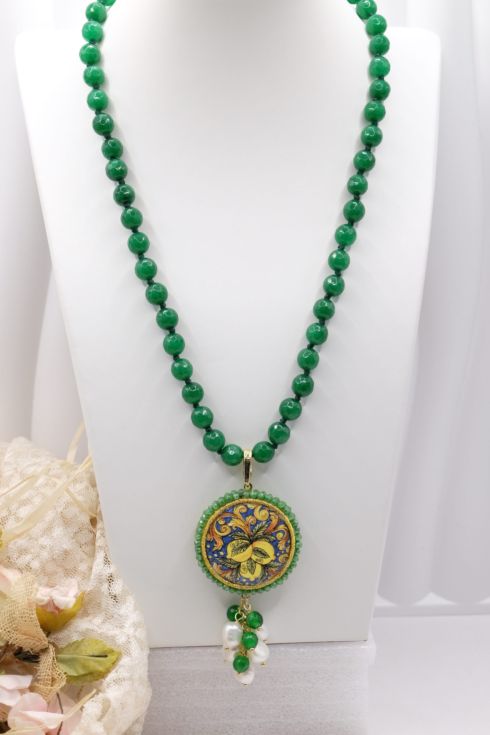 fatta interamente a mano, con pendente in doppia mattonella a lavorazione sautache con passamaneria e micropietre, staccabile, in ceramica di Caltagirone, finemente decorata a mano da entrambi i lati e collana in giada Verde