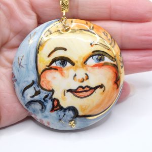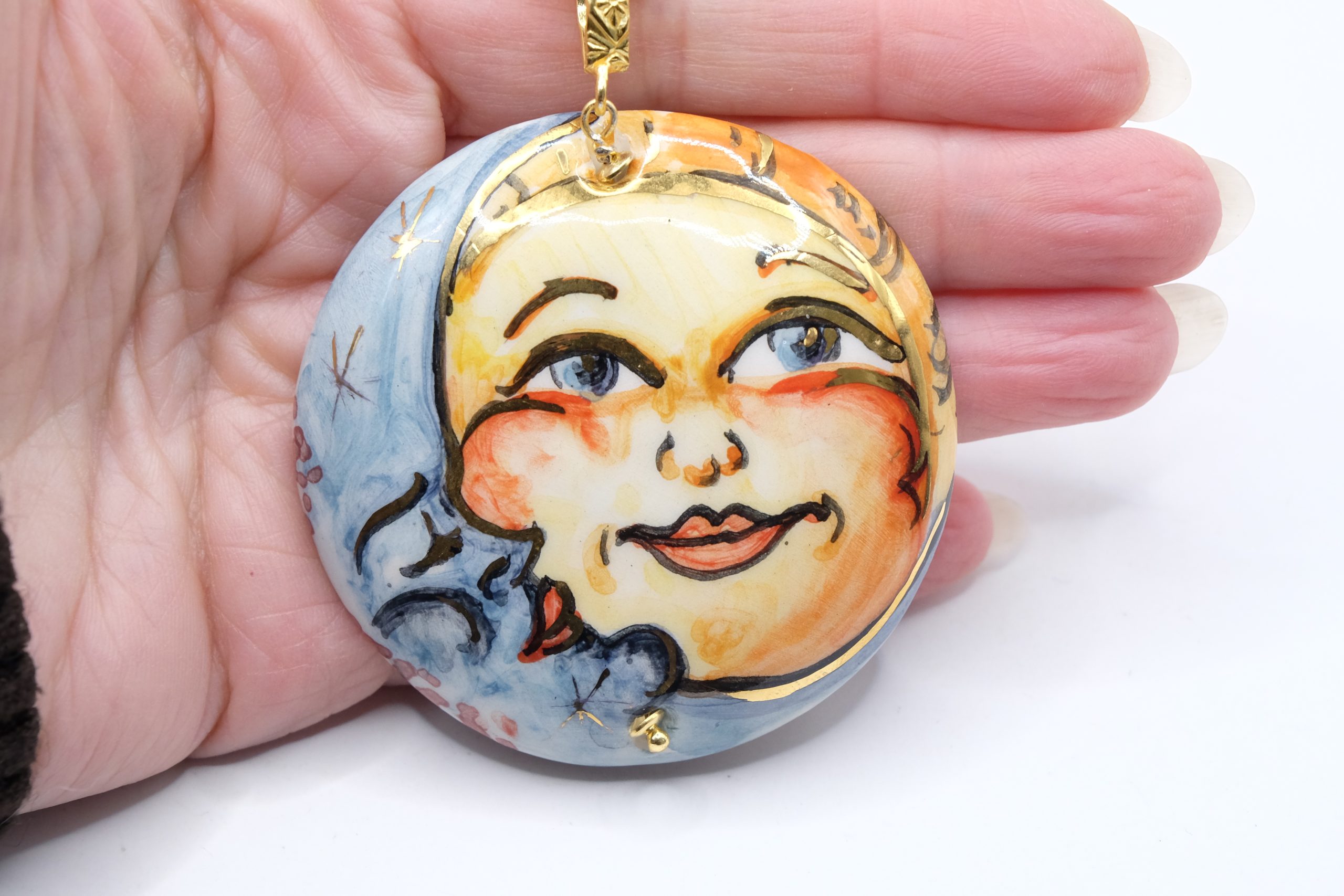 Il pendente in ceramica di Caltagirone, decorato a mano con sole e luna barocchi e dettagli in oro zecchino 🌙☀️, è staccabile e pensato per essere indossato anche con altre collane.