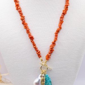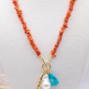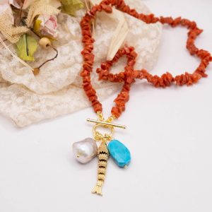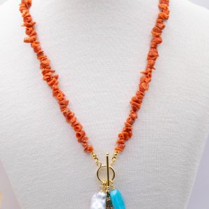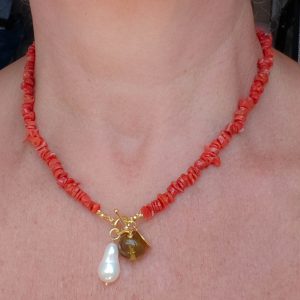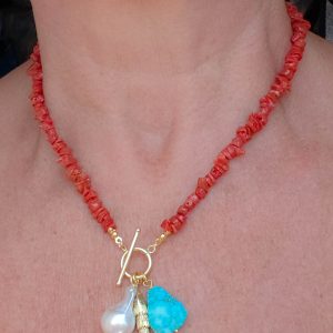 Collane artigianale con girocollo in corallo del mediterraneo e ciondoi vari: in turchese afgano, perla naturale barocca,pesce snodato o ambra