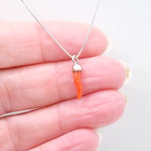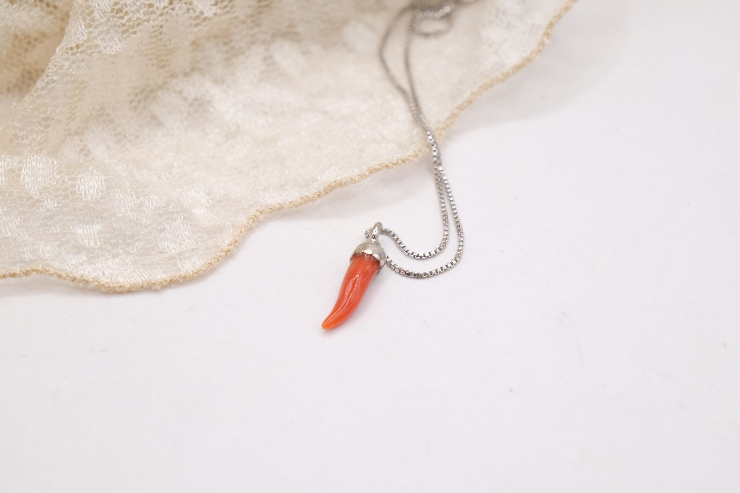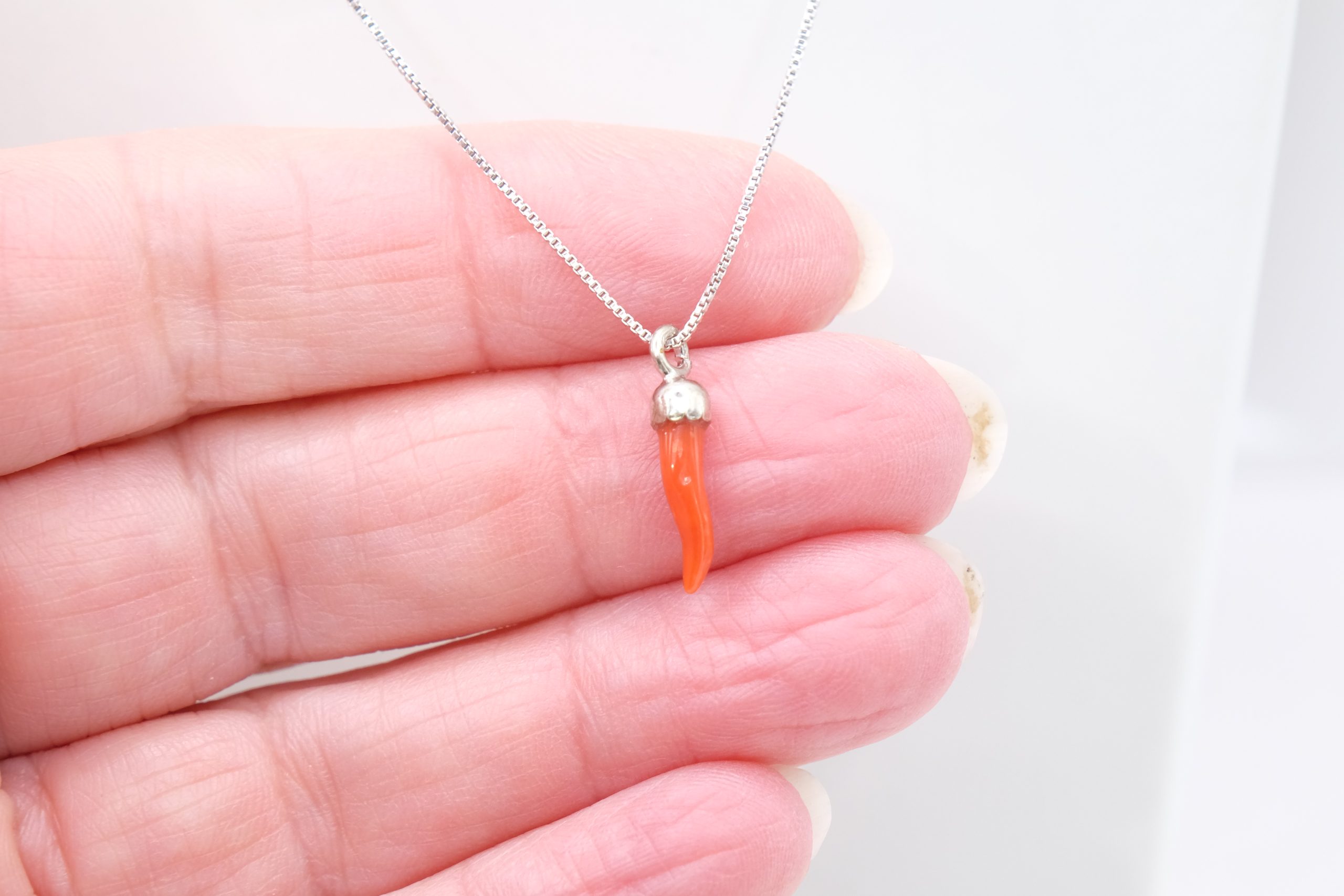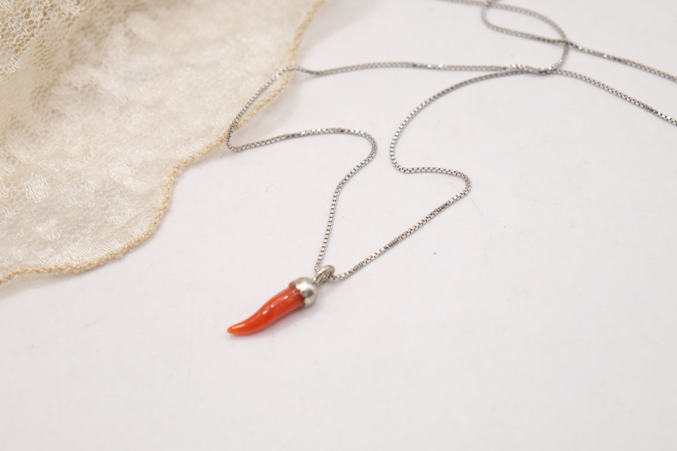 Collanina in argento 925 rodiato, con pendente portafortuna cornetto in corallo rosso del Mediterraneo.