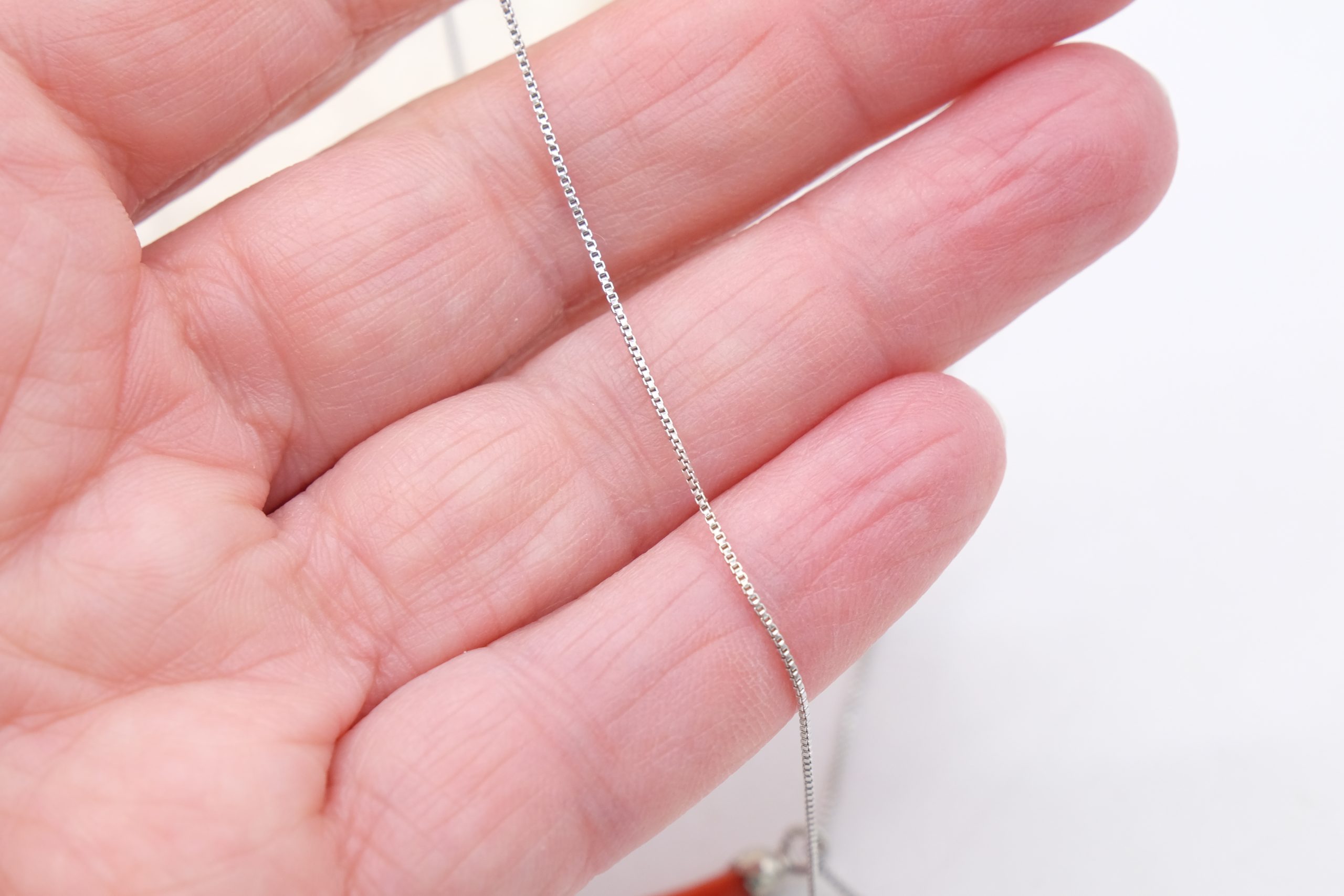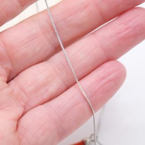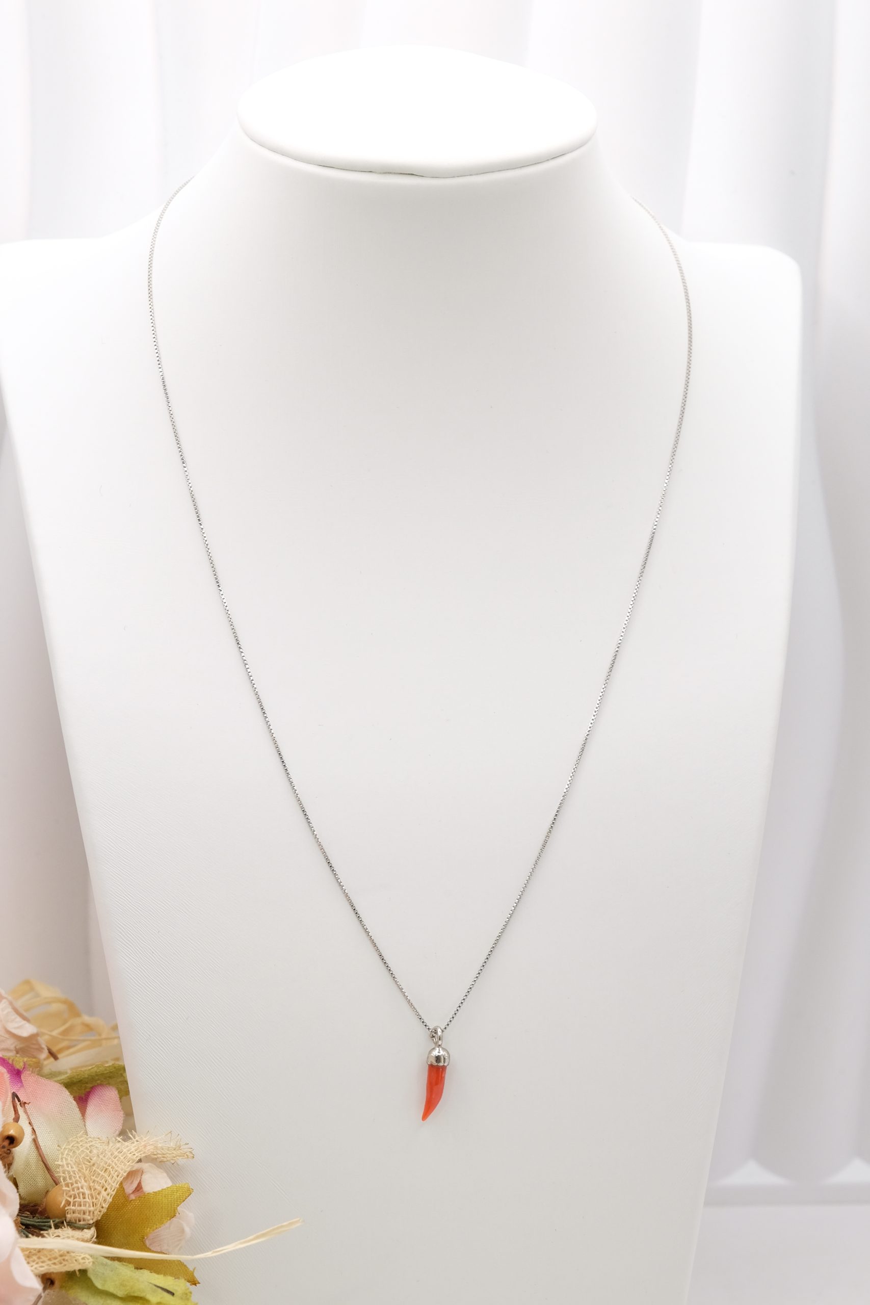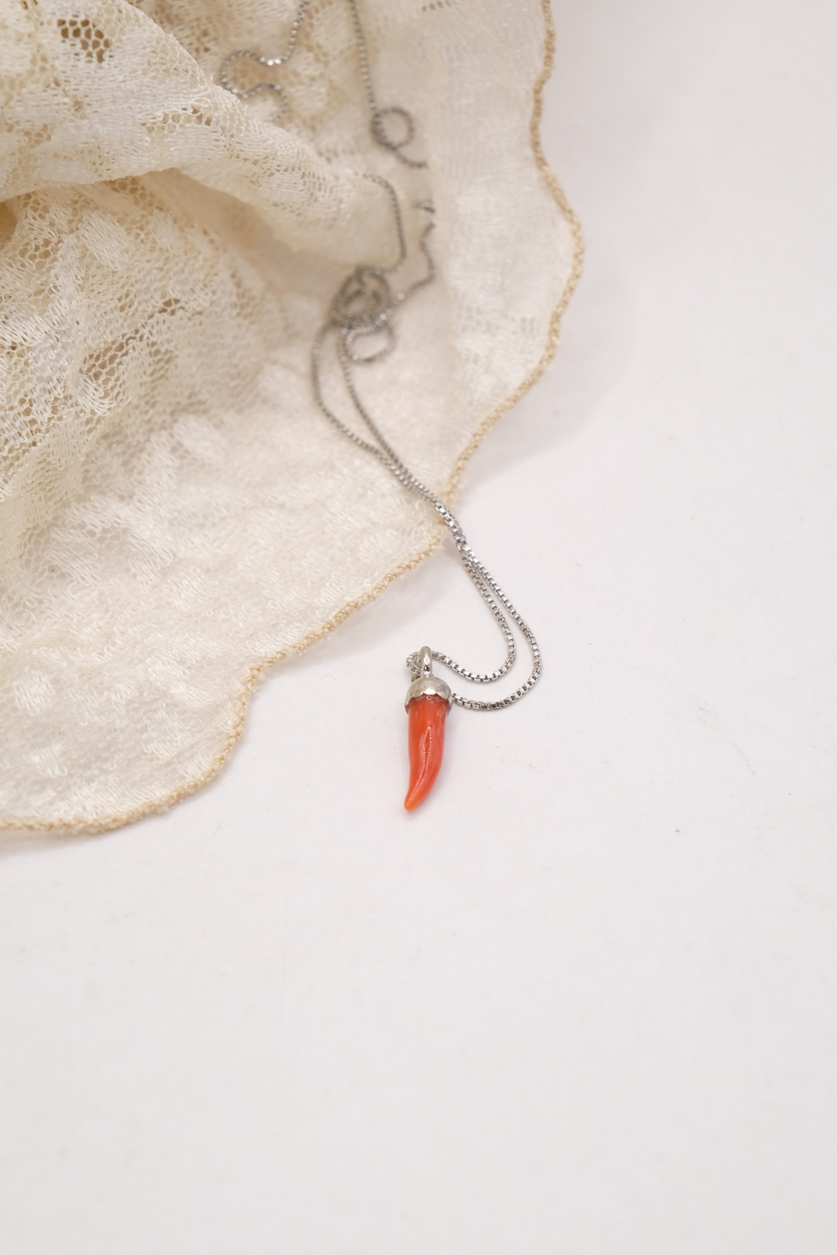 Collanina in argento 925 rodiato, con pendente portafortuna cornetto in corallo rosso del Mediterraneo.