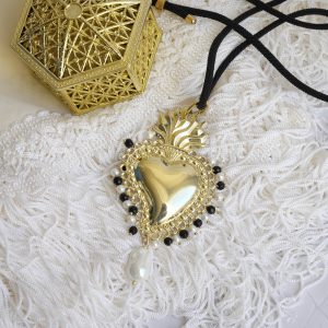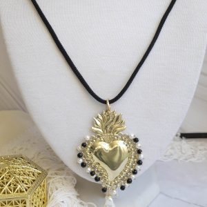 Collana Cuore Sacro Ex Voto Perle Bianche e Nere