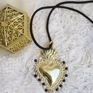 Collana con cordino di cotone e pendente staccabile, Sacro Cuore, Ex Voto, in ottone con perle di maiorca nere e bianche.