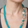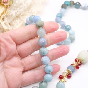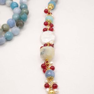 Collana in amazzonite da 12 mm, arricchita da un elemento laterale con sasso grezzo sfaccettato in quarzo e grappoli di perle e giada borgogna.