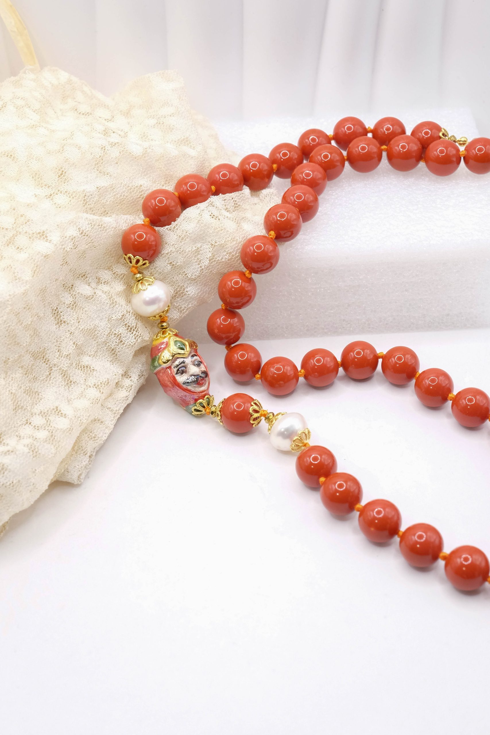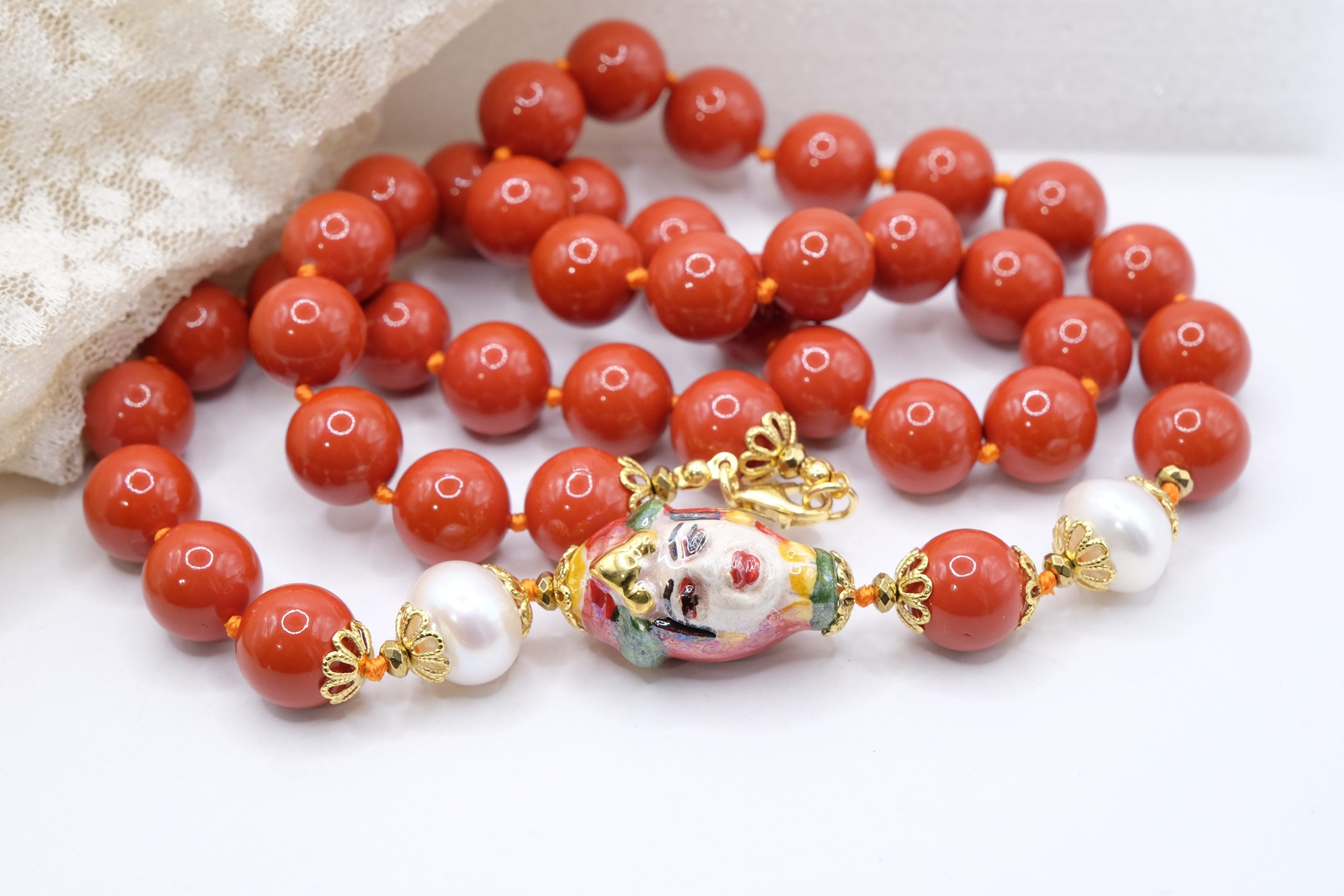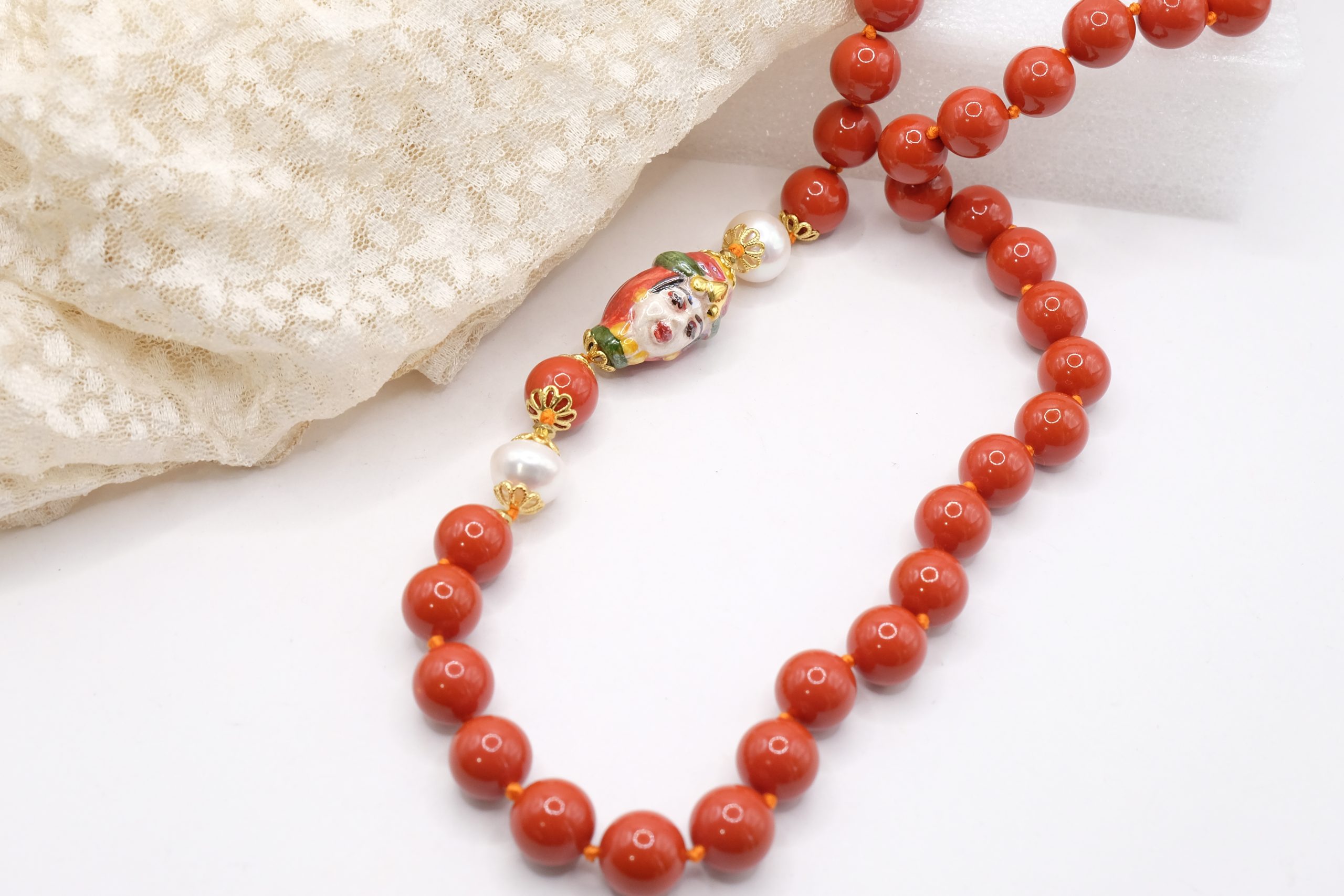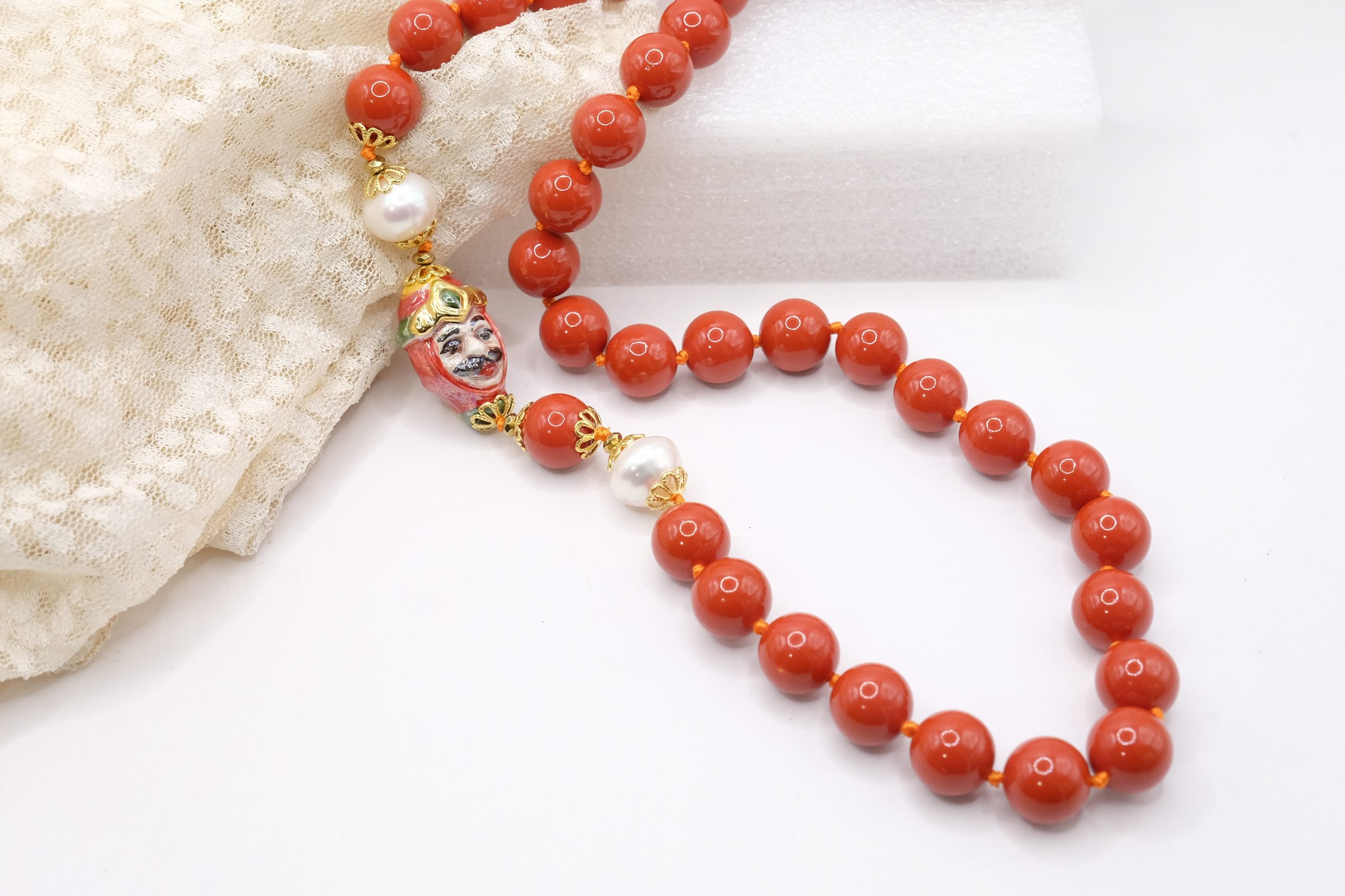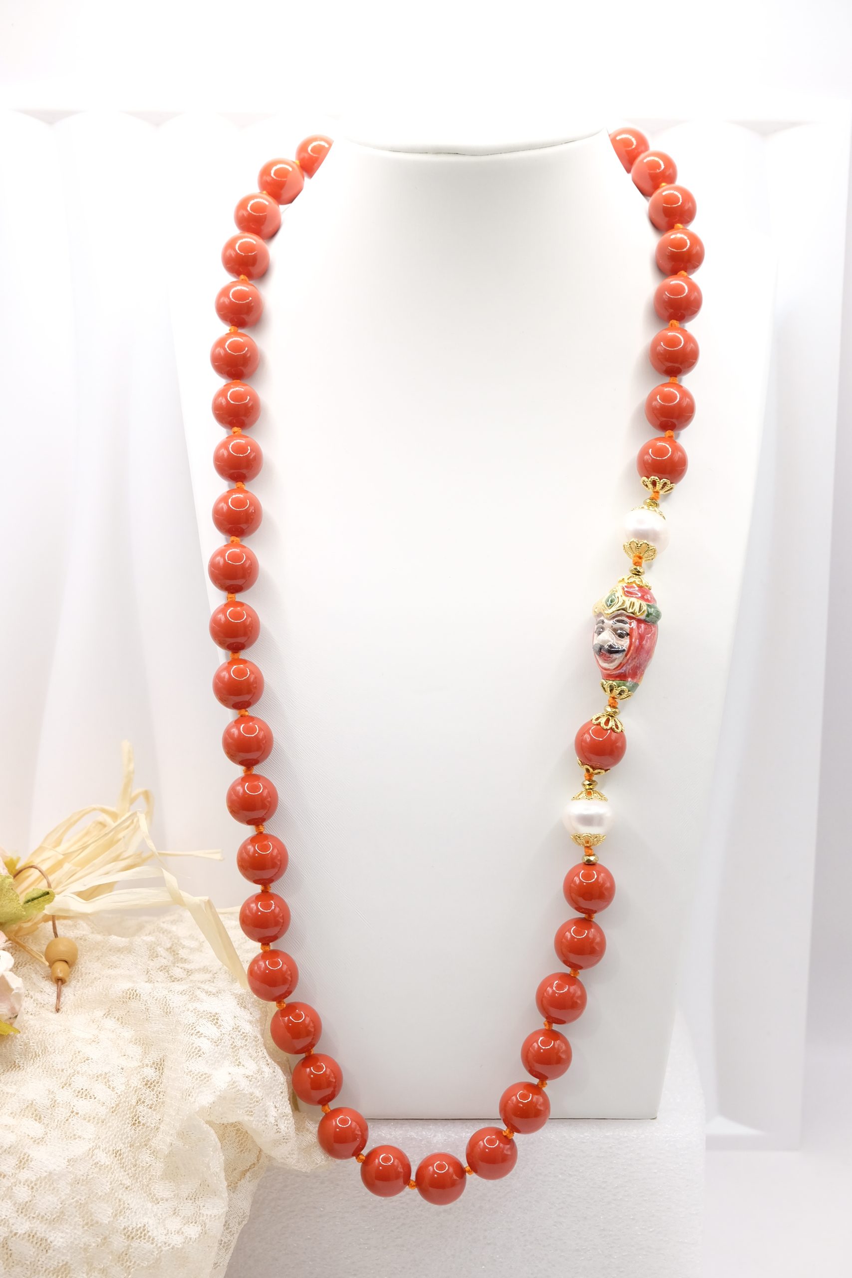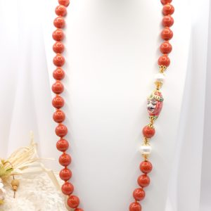 Collana in pasta di corallo da 12mm, bellissimo elemento, decorato da entrambi i lati con testa di moro, iomo e donna sullo stesso elemento in ceramica di Caltagirone realizzata e decorata a mano con oro zecchino, e arricchita da 2 perle naturali.