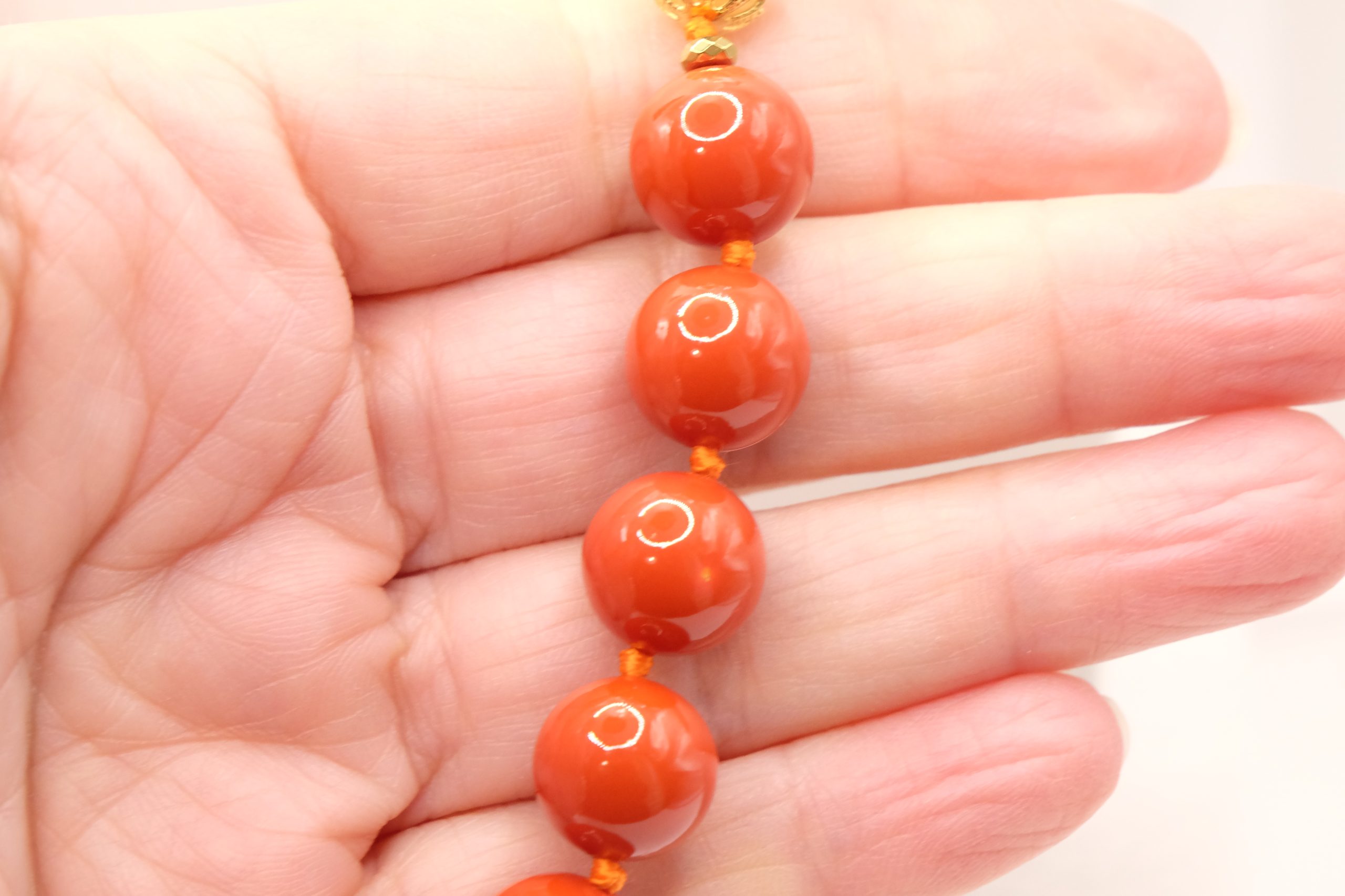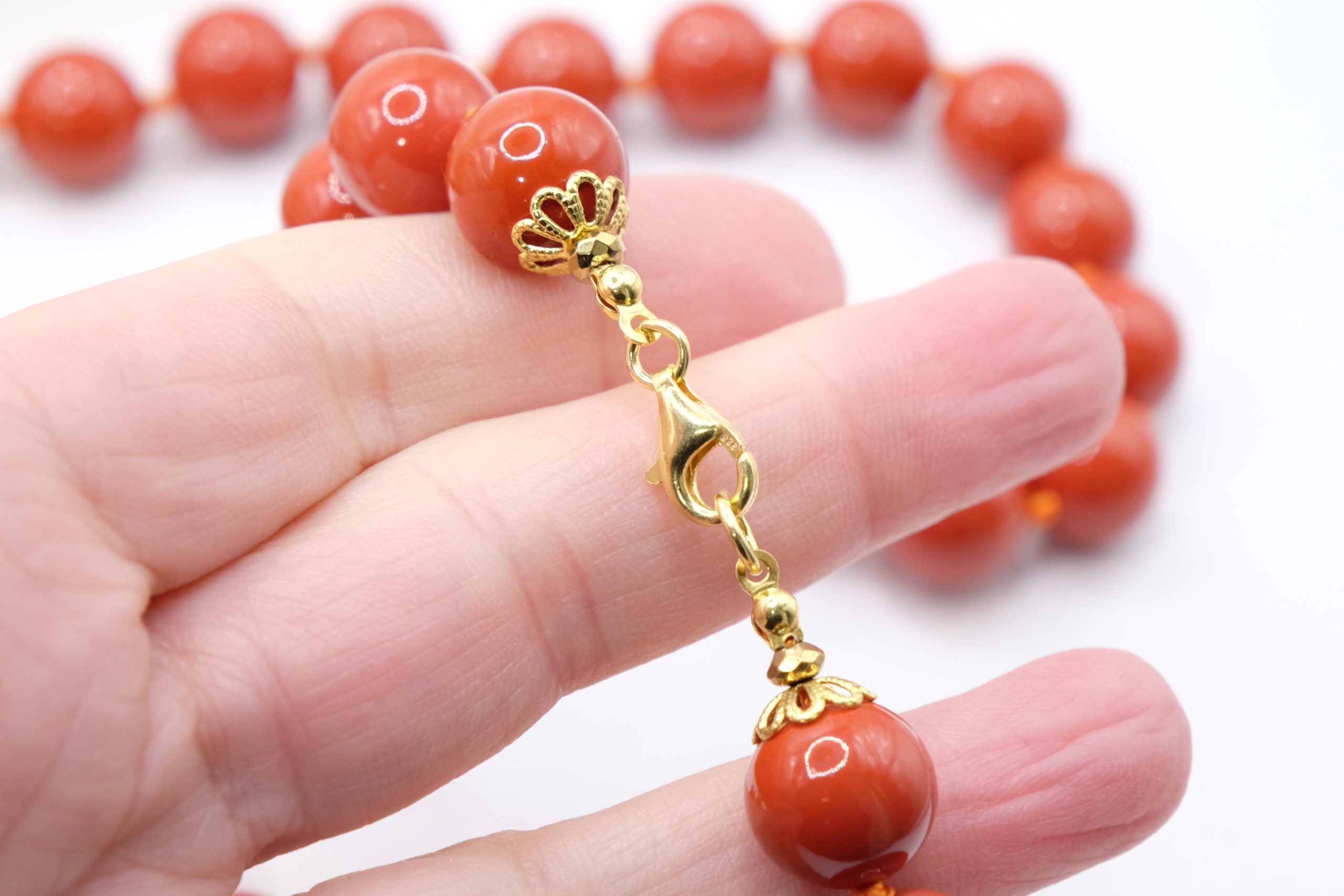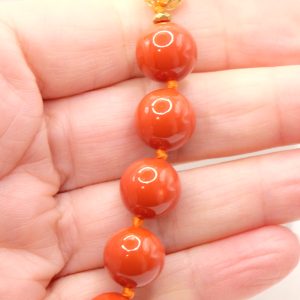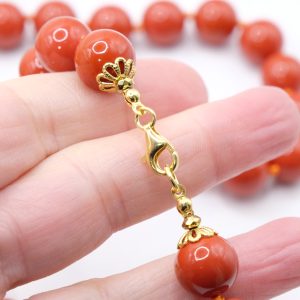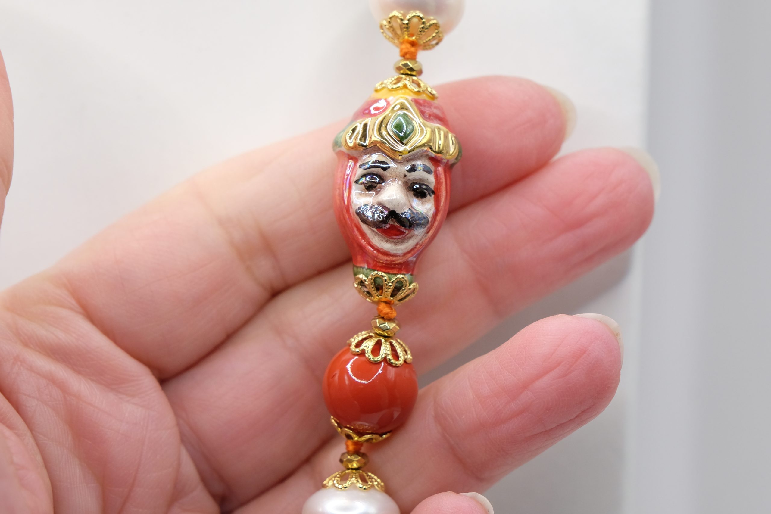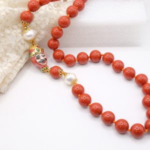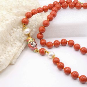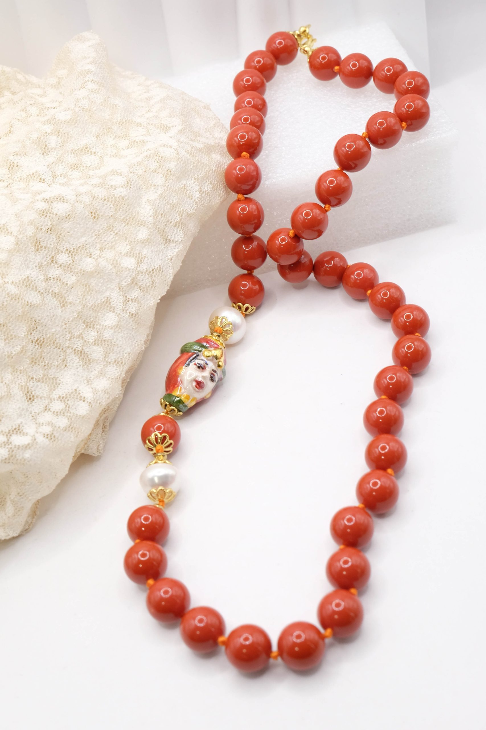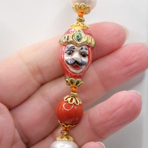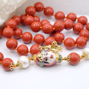 Collana in pasta di corallo da 12mm, bellissimo elemento, decorato da entrambi i lati con testa di moro, iomo e donna sullo stesso elemento in ceramica di Caltagirone realizzata e decorata a mano con oro zecchino, e arricchita da 2 perle naturali.