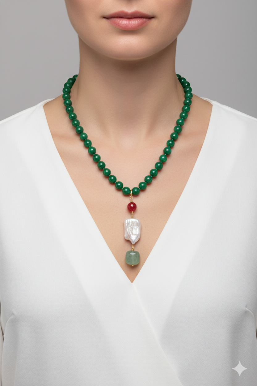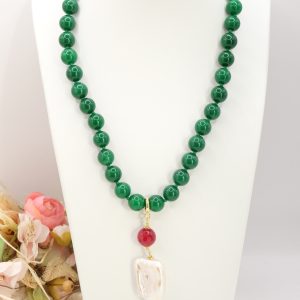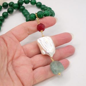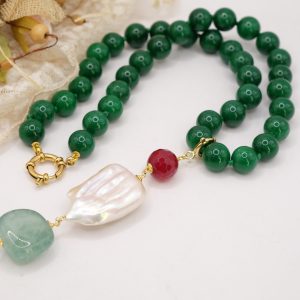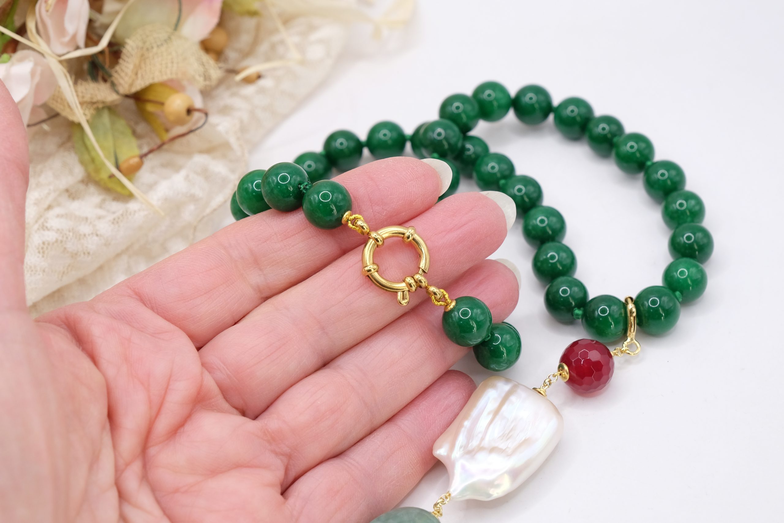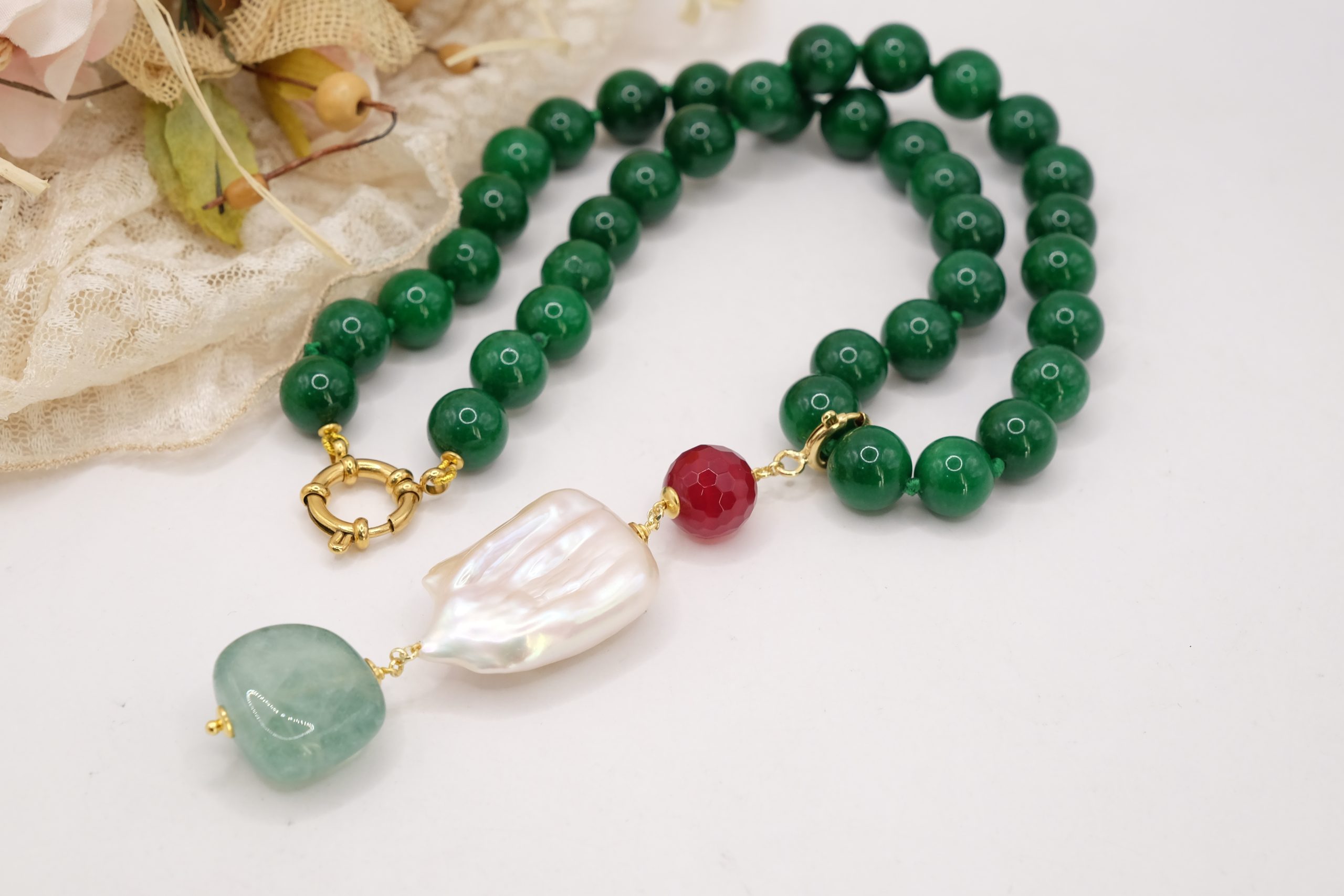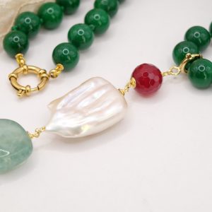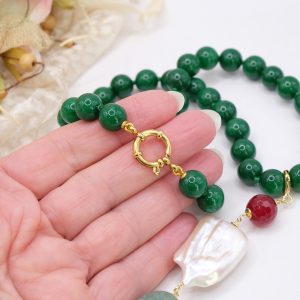 Materiale: Giada verde, Fluorite, Giada borgogna, perla, Argento 925 placcato oro, acciaio
