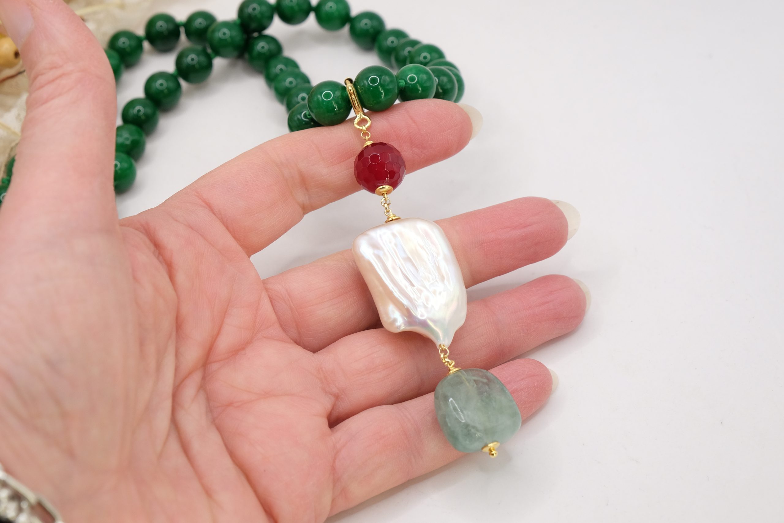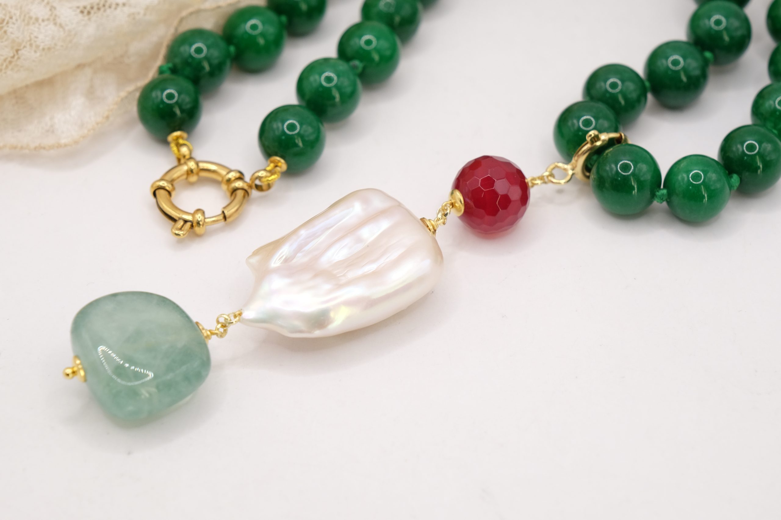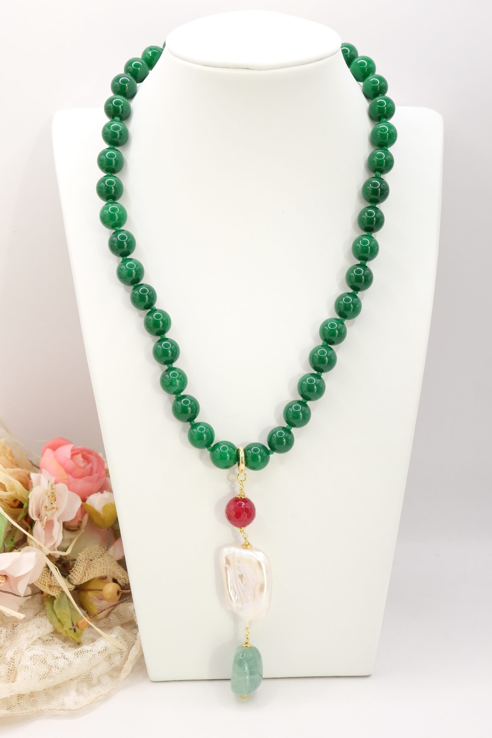 Collana lussuosa ma sportiva in giada verde da 10mm e ciondolo staccabile con fluorite, grande perla naturale e giada borgogna