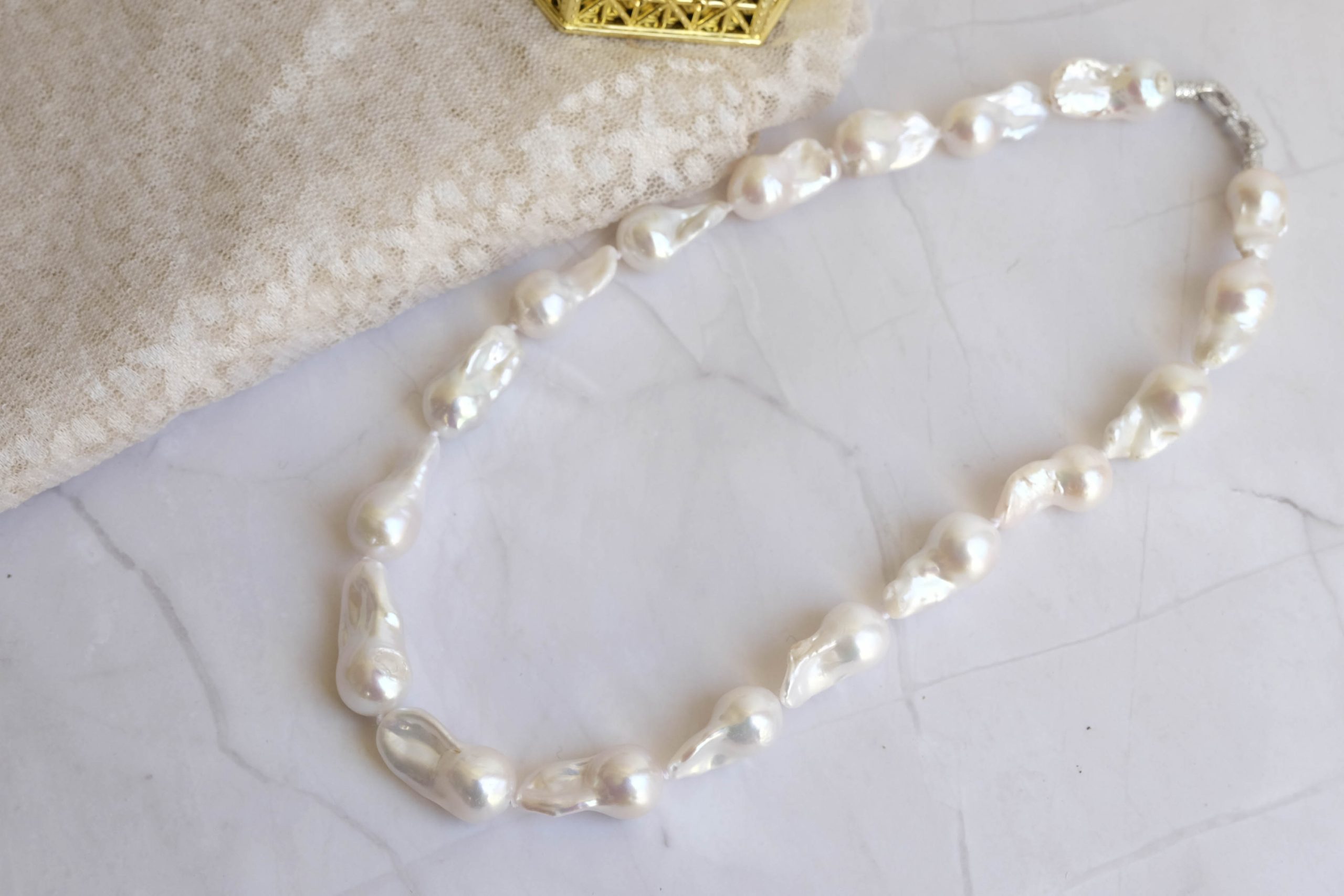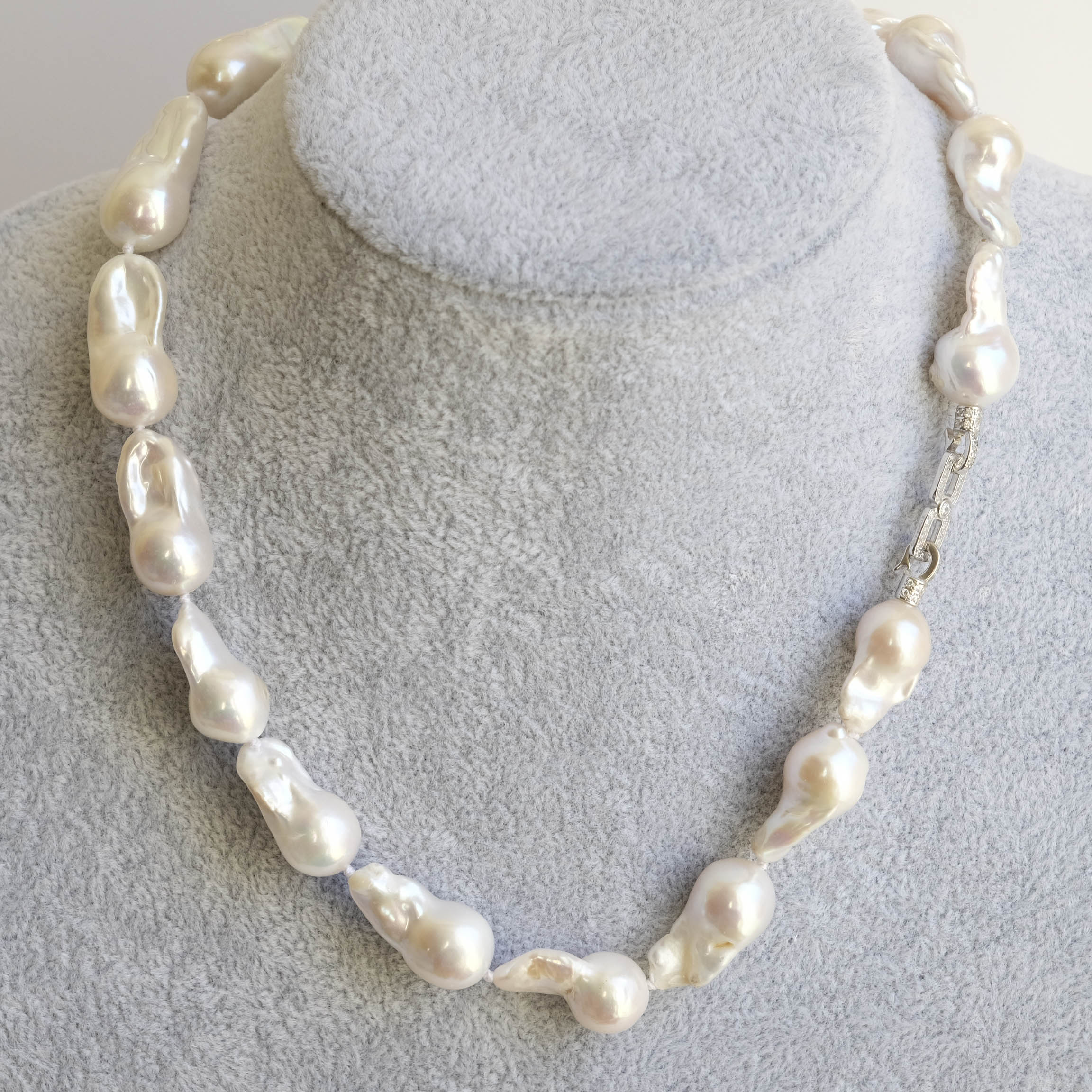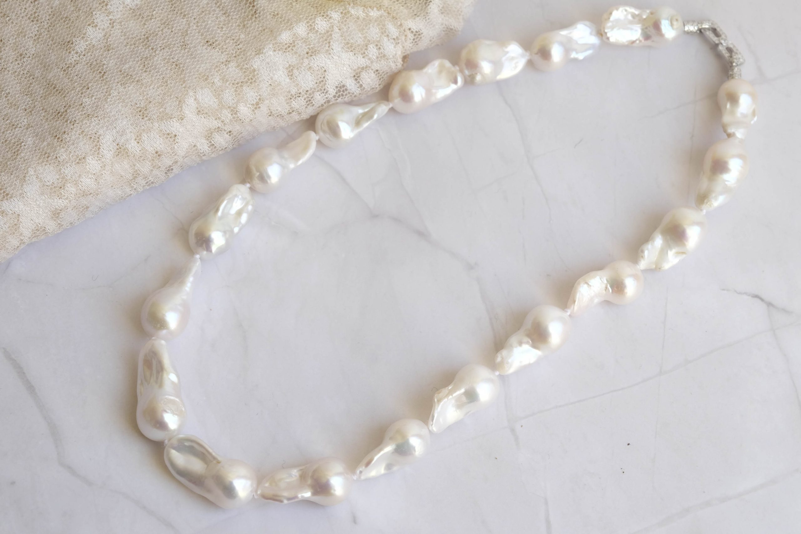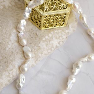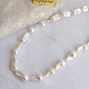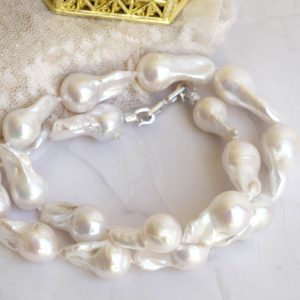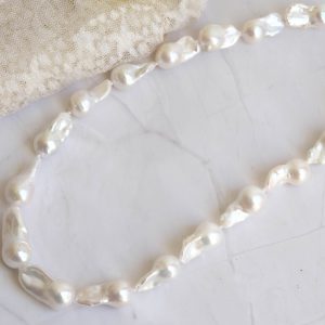 Collana di grandi perle naturali barocche (da 20 x 10 mm circa) bianche e luminose.