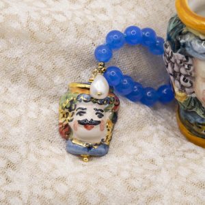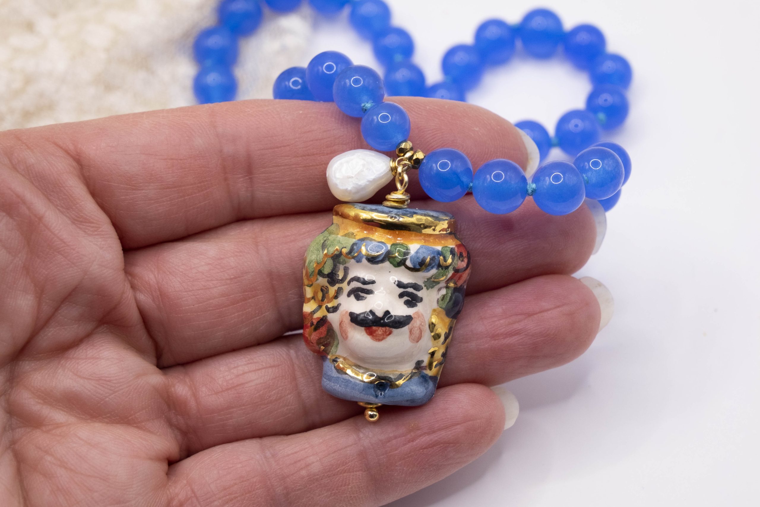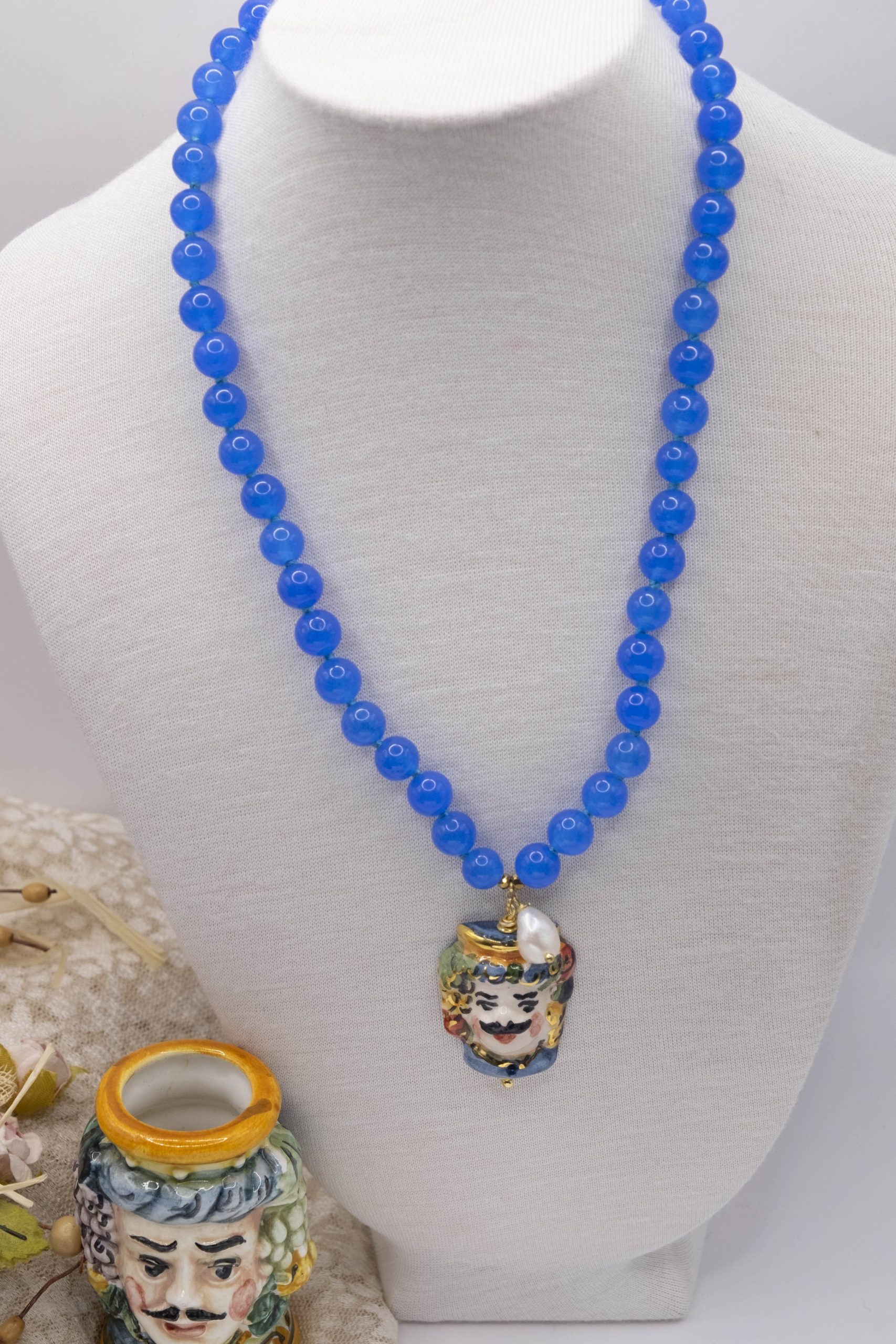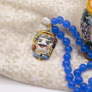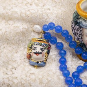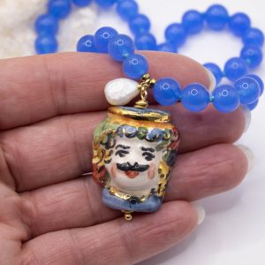 Collana fatta interamente a mano, con girocollo in giada naturale blu da 8 mm e Testa di Moro pendente in ceramica di Caltagirone decorata a mano con oro zecchino, arricchita da una perla naturale luminosa