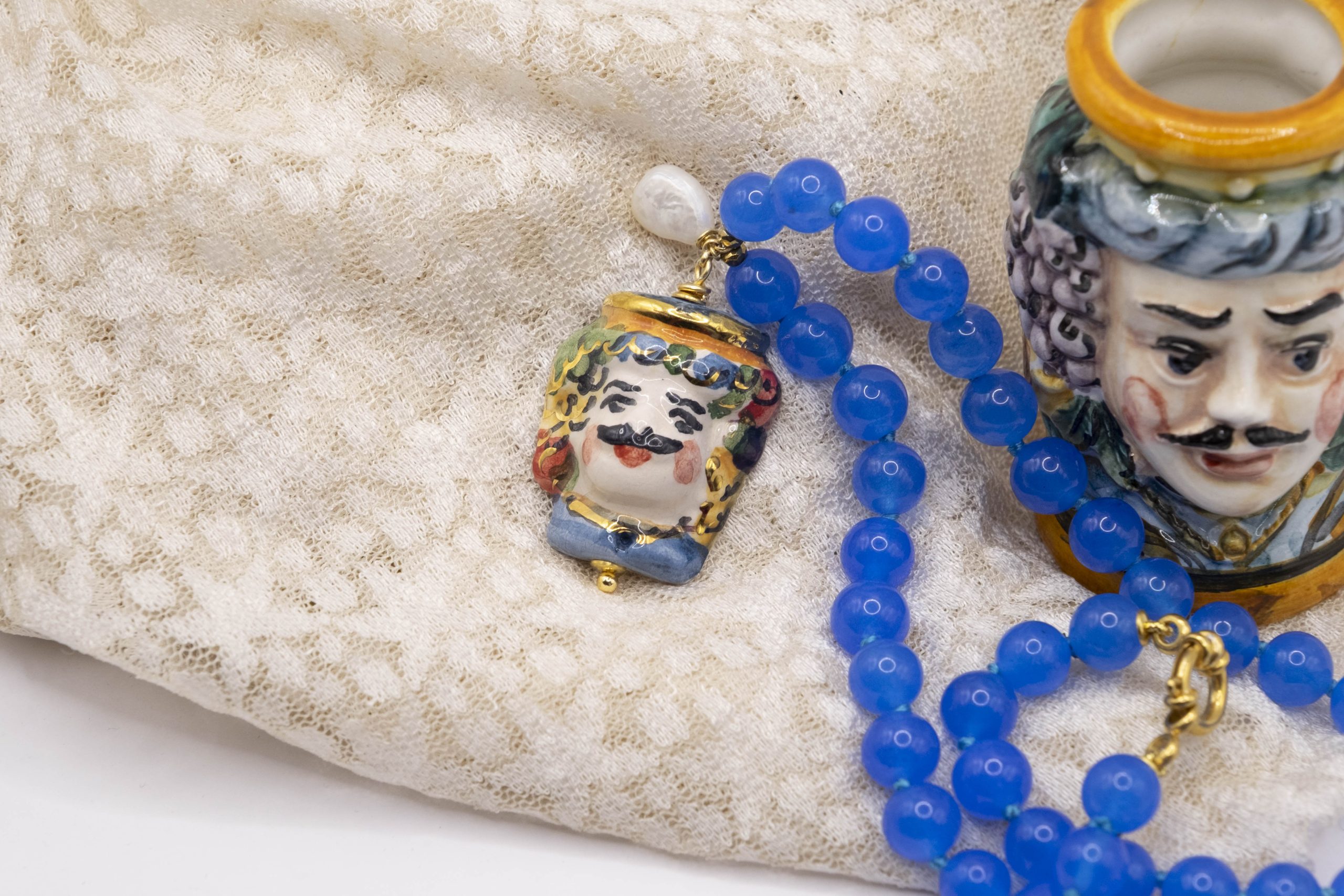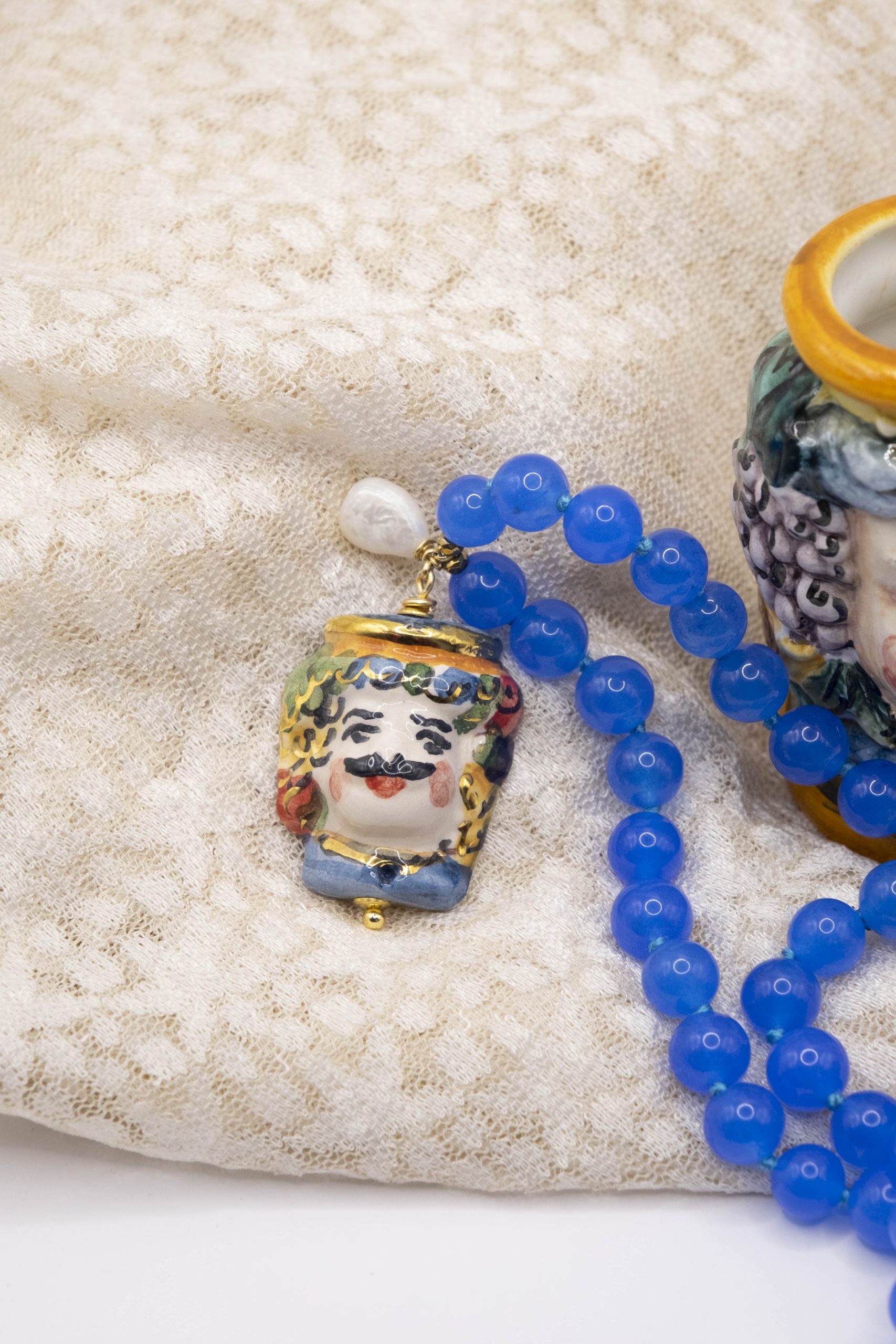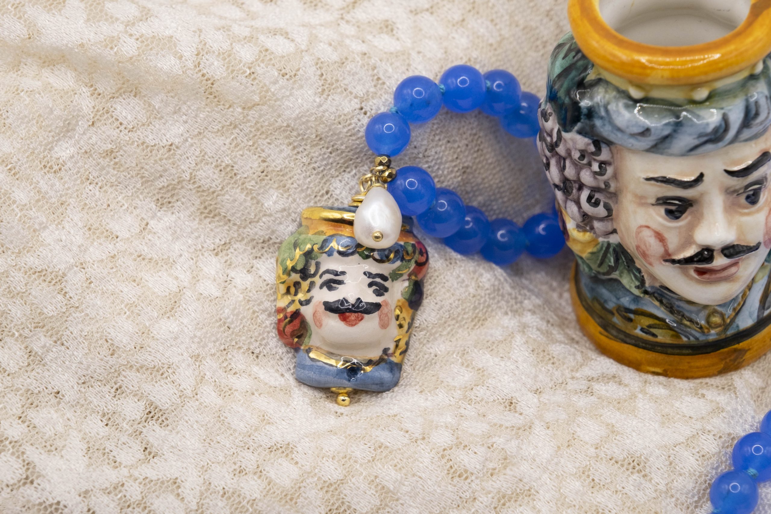 Collana fatta interamente a mano, con girocollo in giada naturale blu da 8 mm e Testa di Moro pendente in ceramica di Caltagirone decorata a mano con oro zecchino, arricchita da una perla naturale luminosa