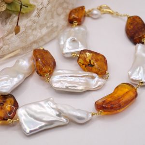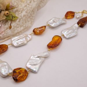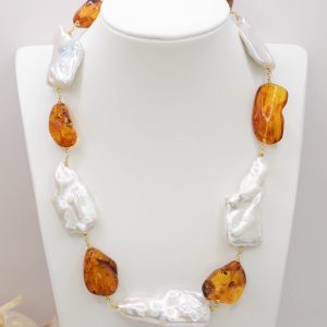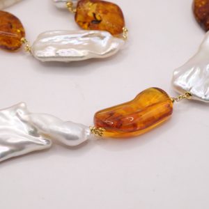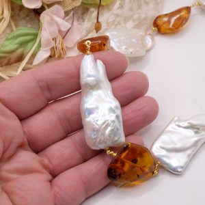 Collana lussuosa dal fascino strabiliante in luminose e grandissime perle bianche barocche e sassi in superlativa ambra del baltico. Le finiture sono in argento 925 placcato oro