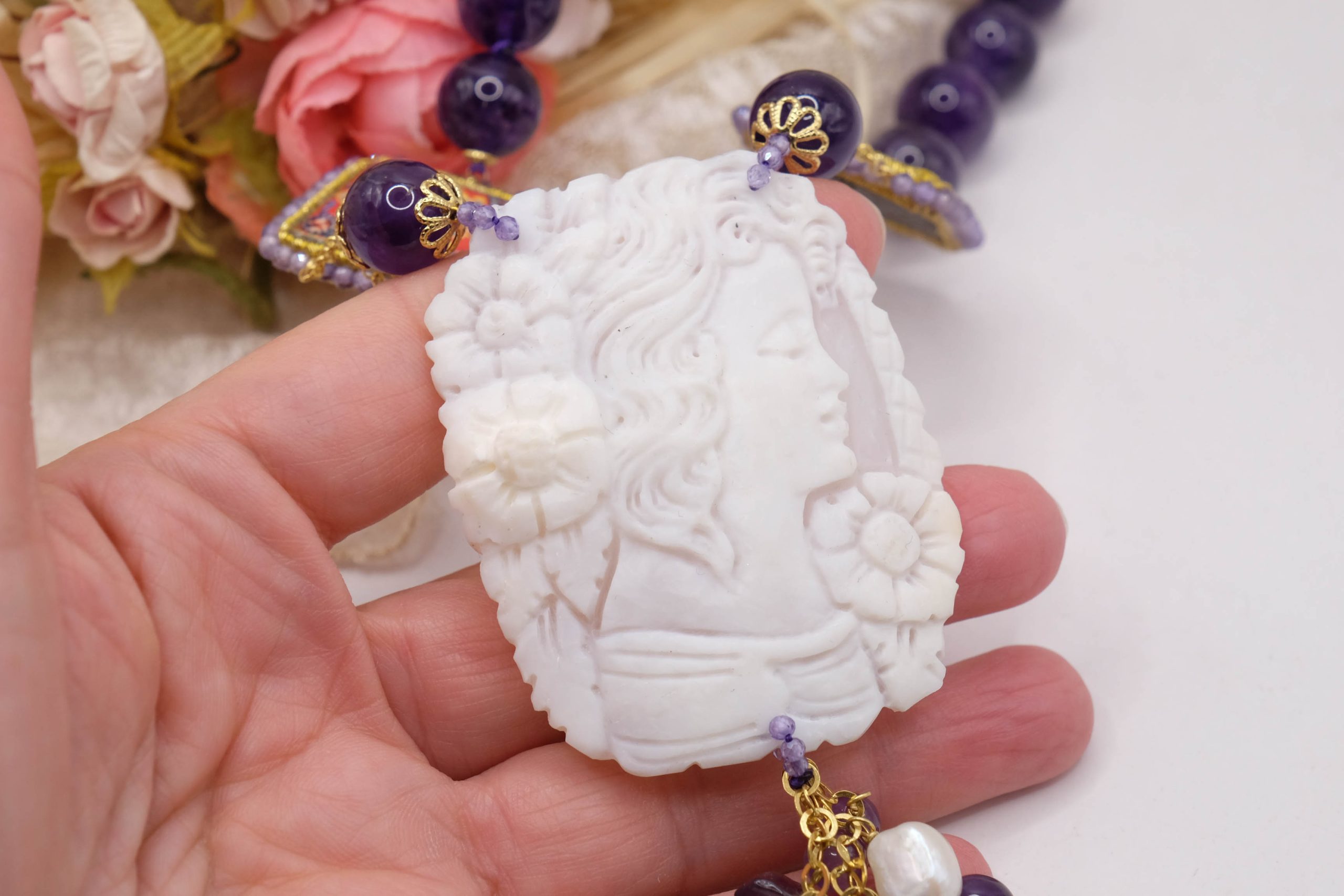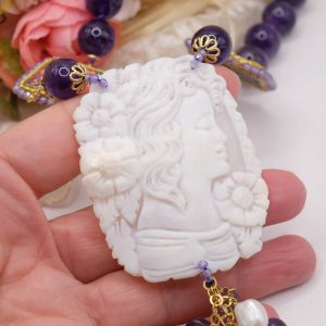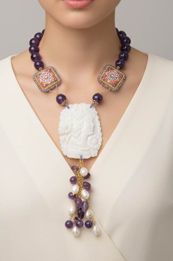 Preziosa collana in ametista naturale, mattonelle in ceramica di Caltagirone e cammeo conchiglia sardonica (misura 6,2 x 4,8 cm) realizzato a mano dai maestri incisori di Torre del Greco. Quando 2 culture si incontrano, quella campana e quella siciliana