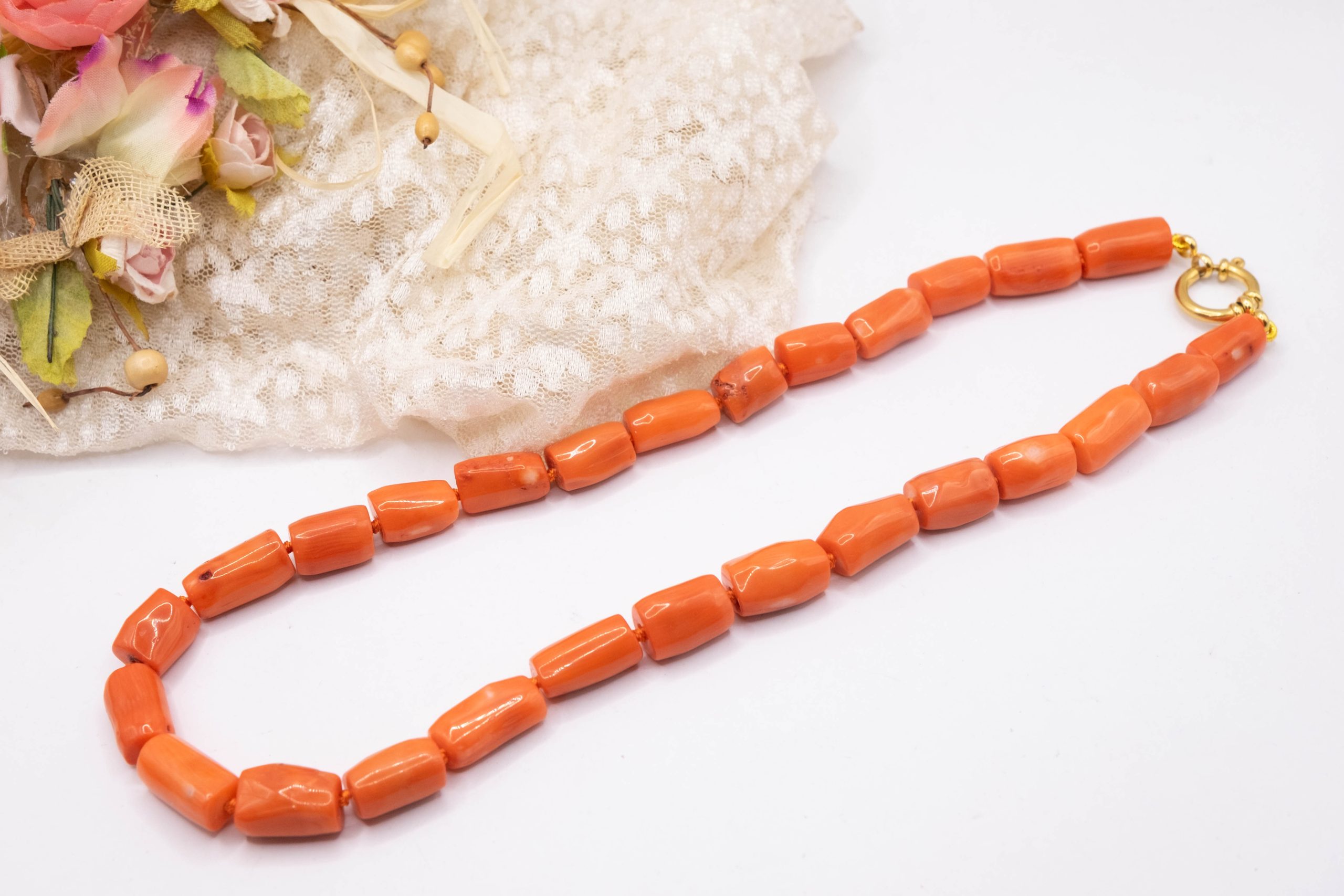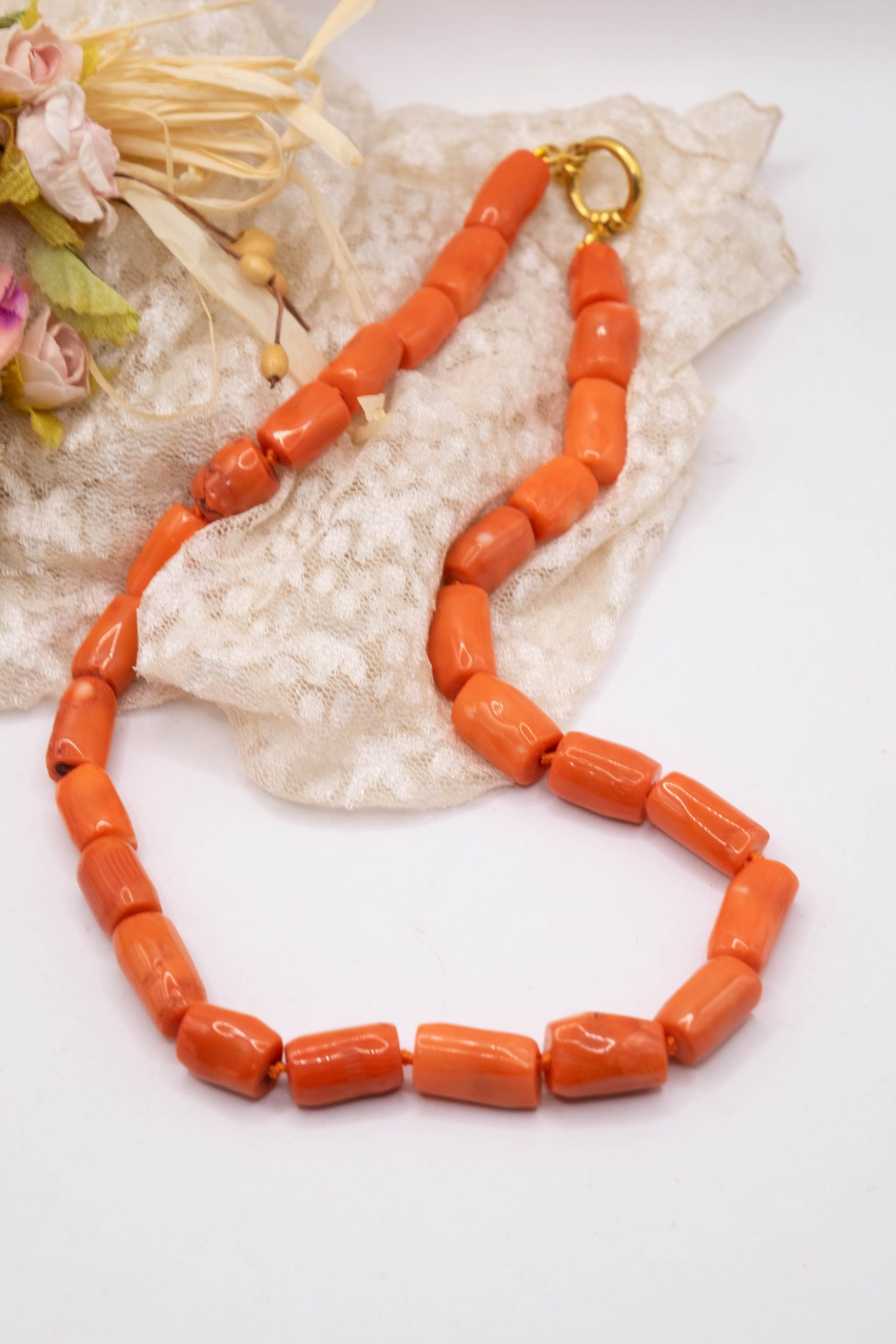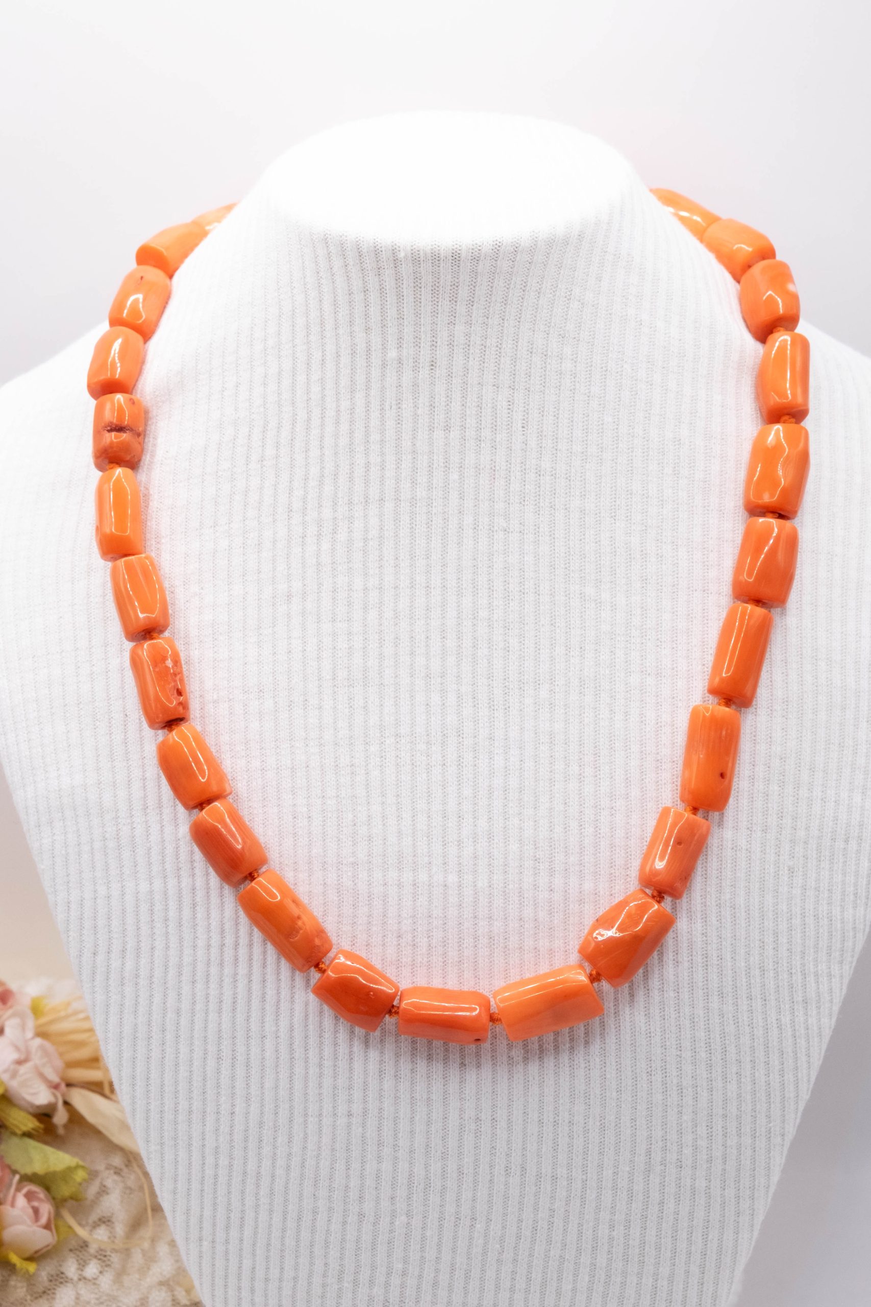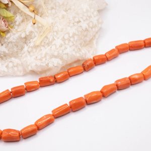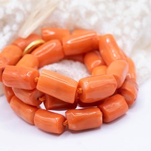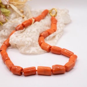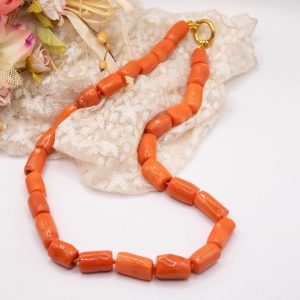 Strepitosa collana in corallo bamboo aranciato a barilotti da 15 x 10 mm