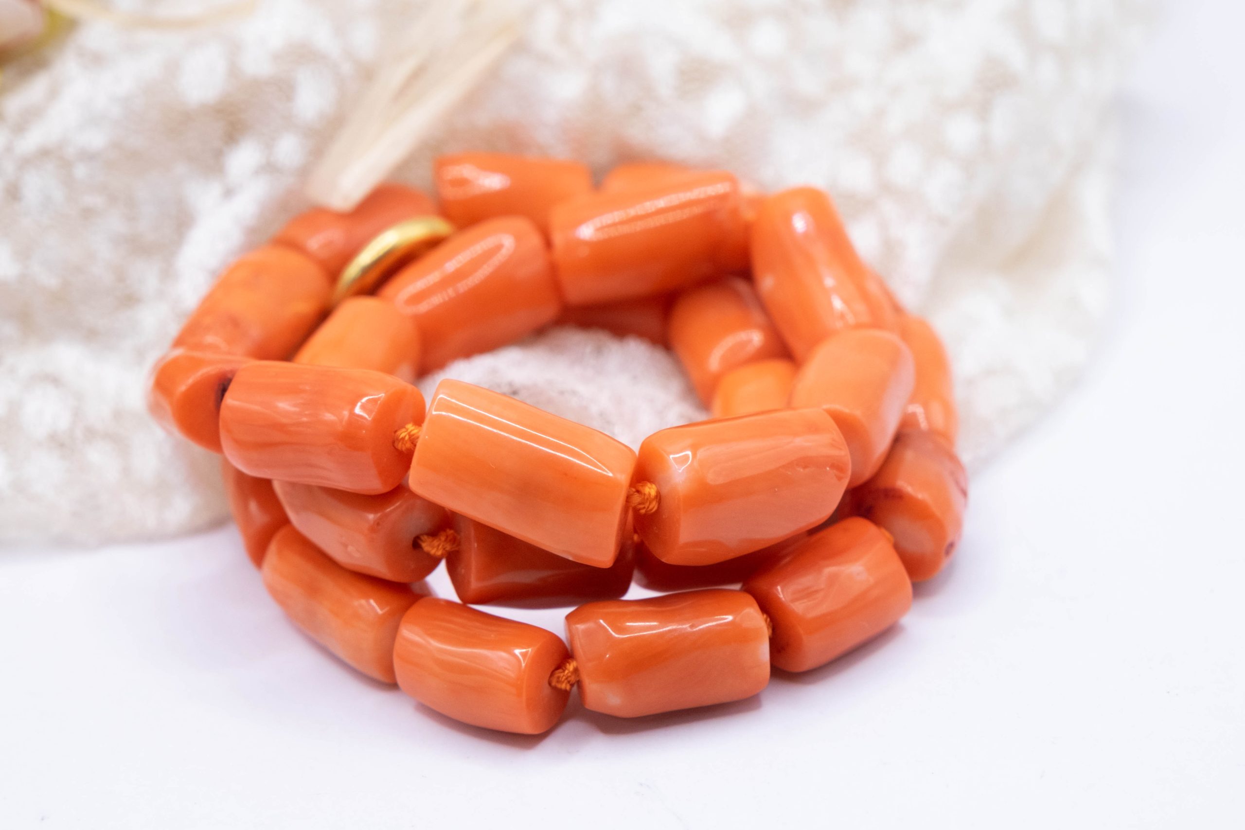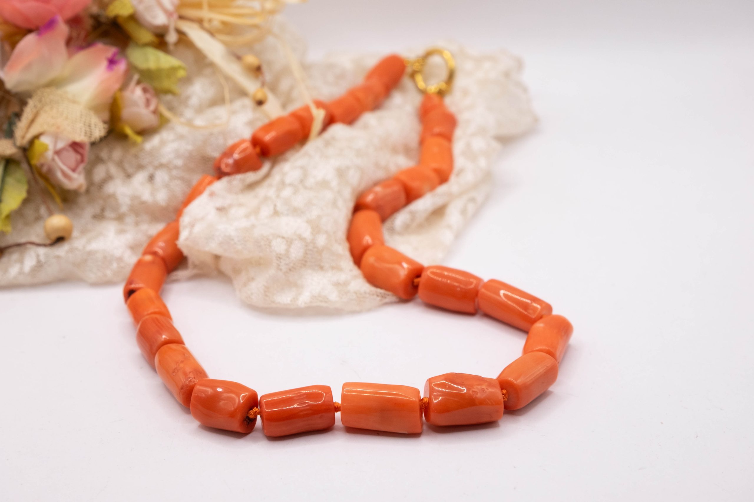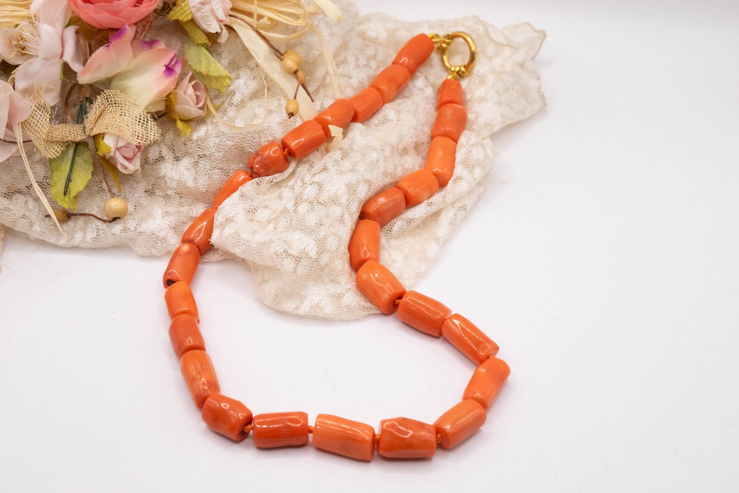 Strepitosa collana in corallo bamboo aranciato a barilotti da 15 x 10 mm