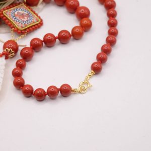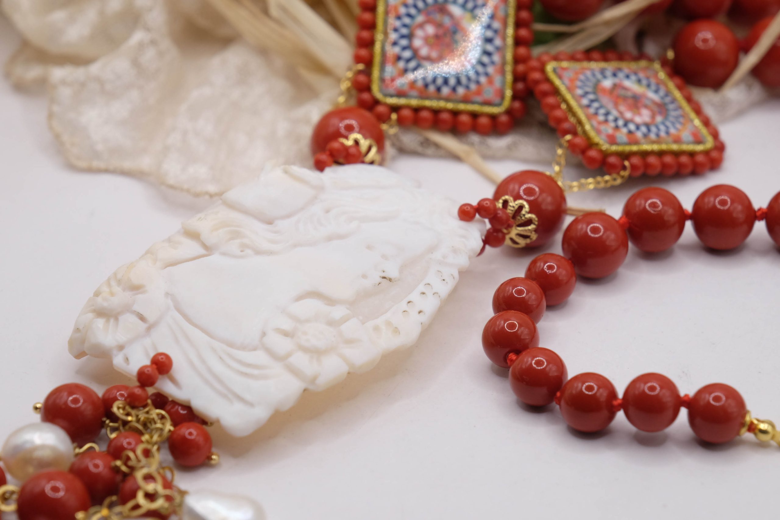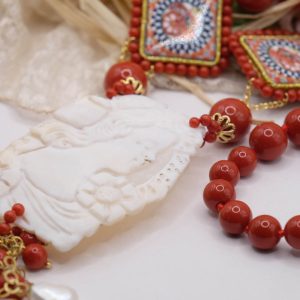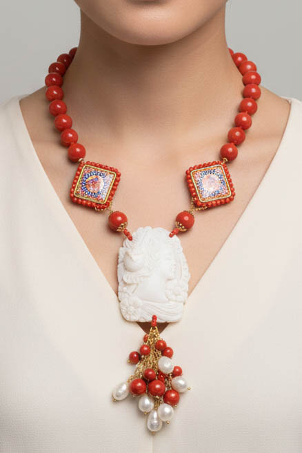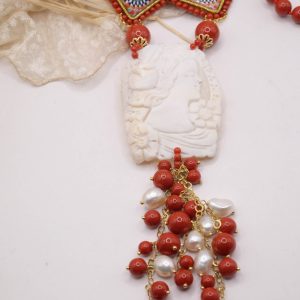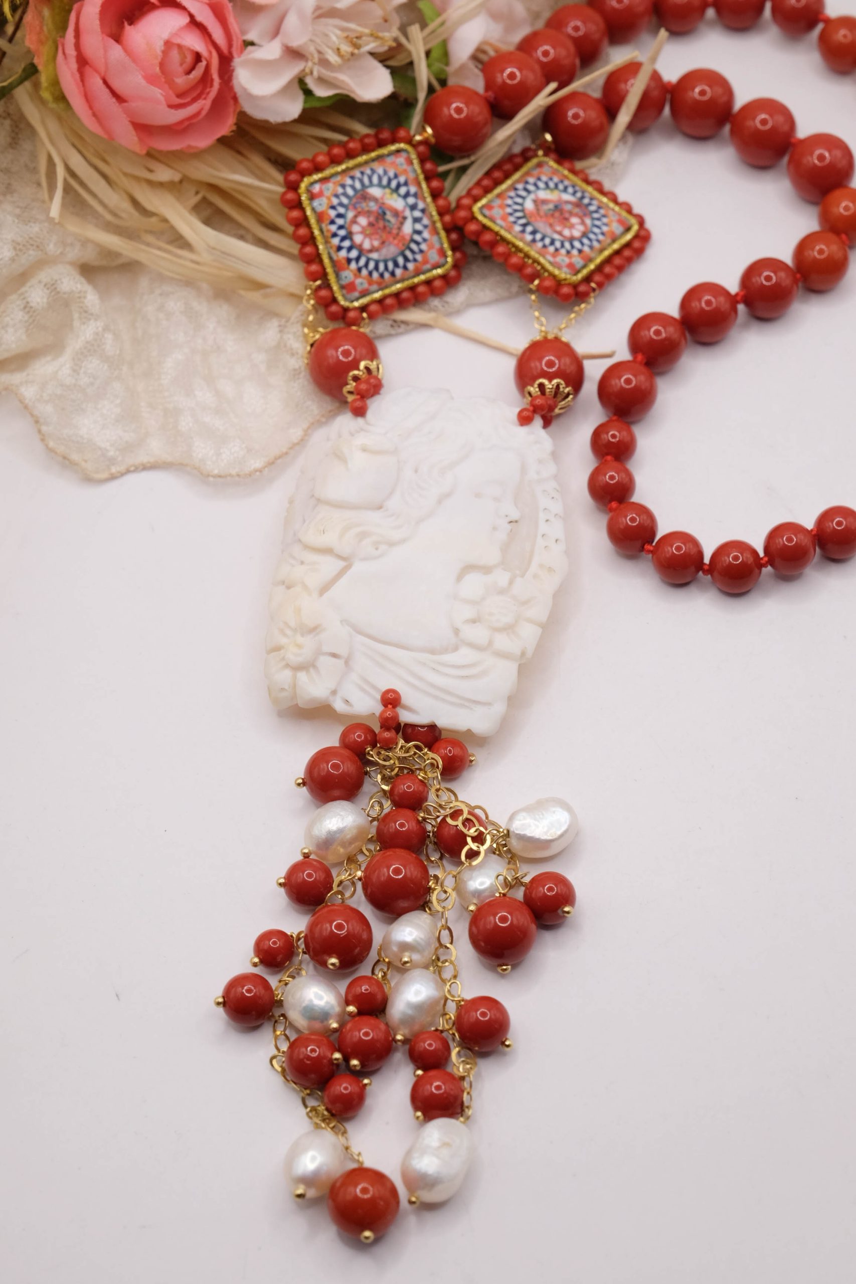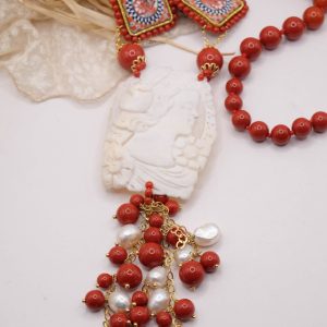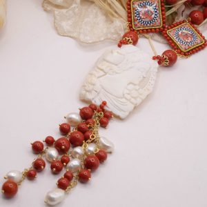 Collana in Pasta di Corallo Ceramica di Caltagirone e cammeo di Torre del Greco
