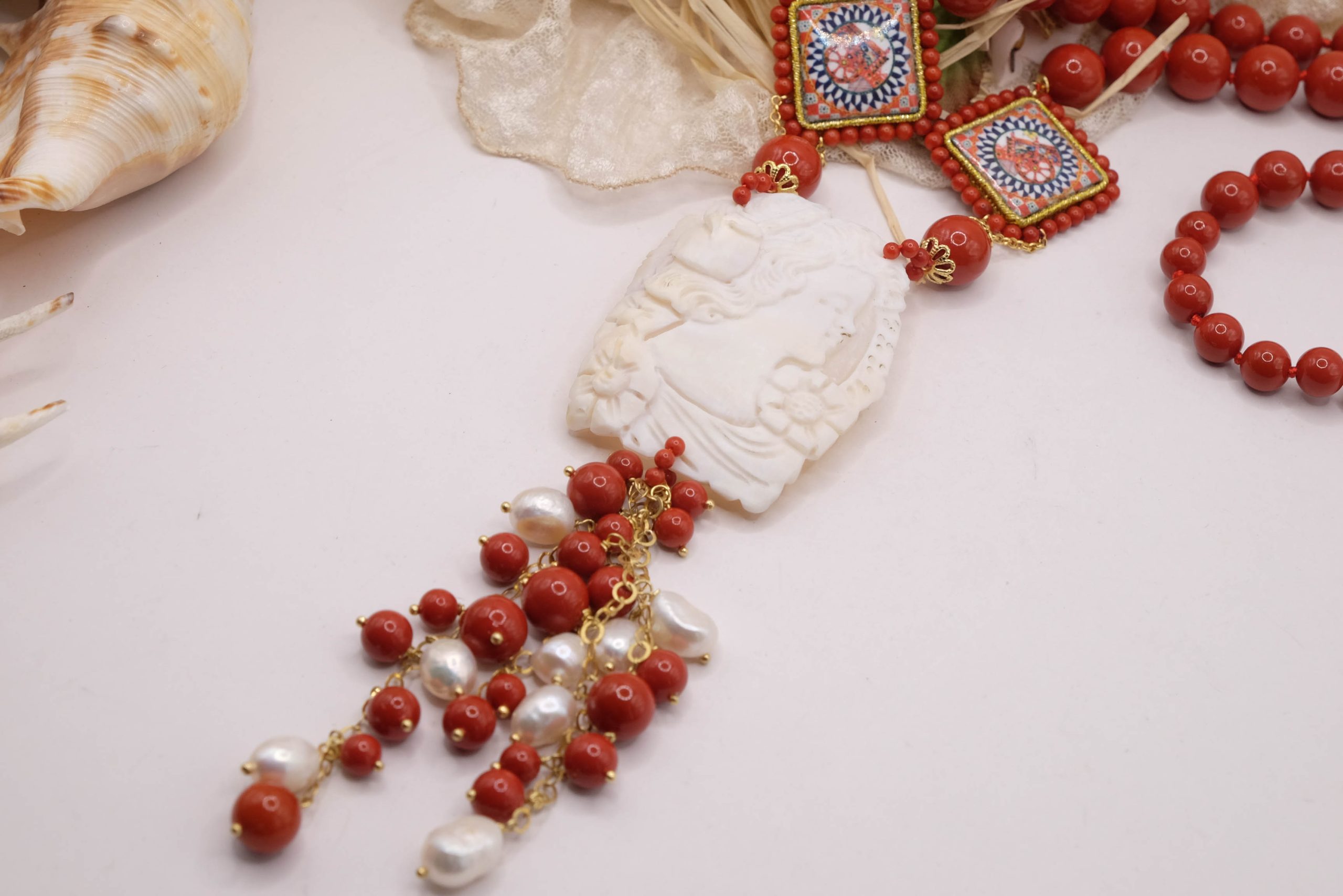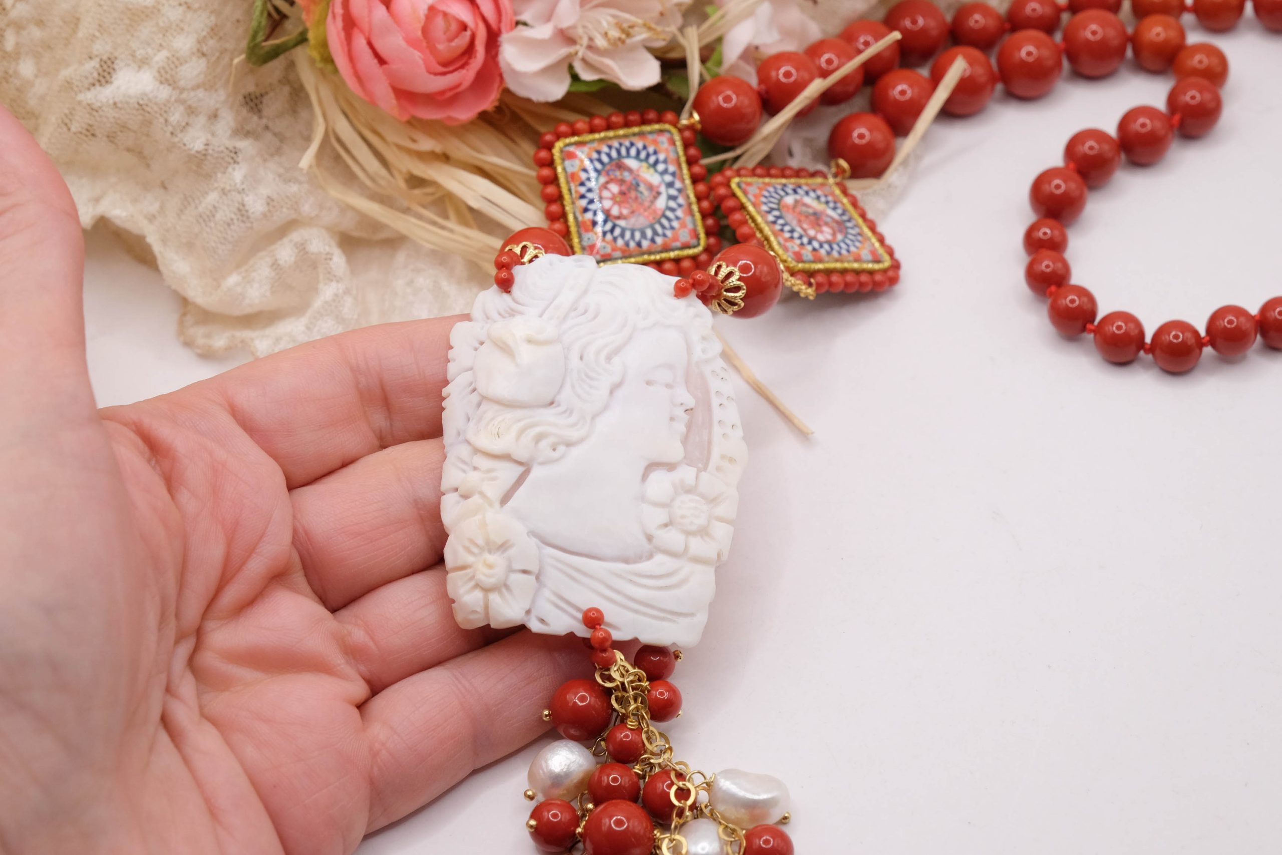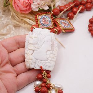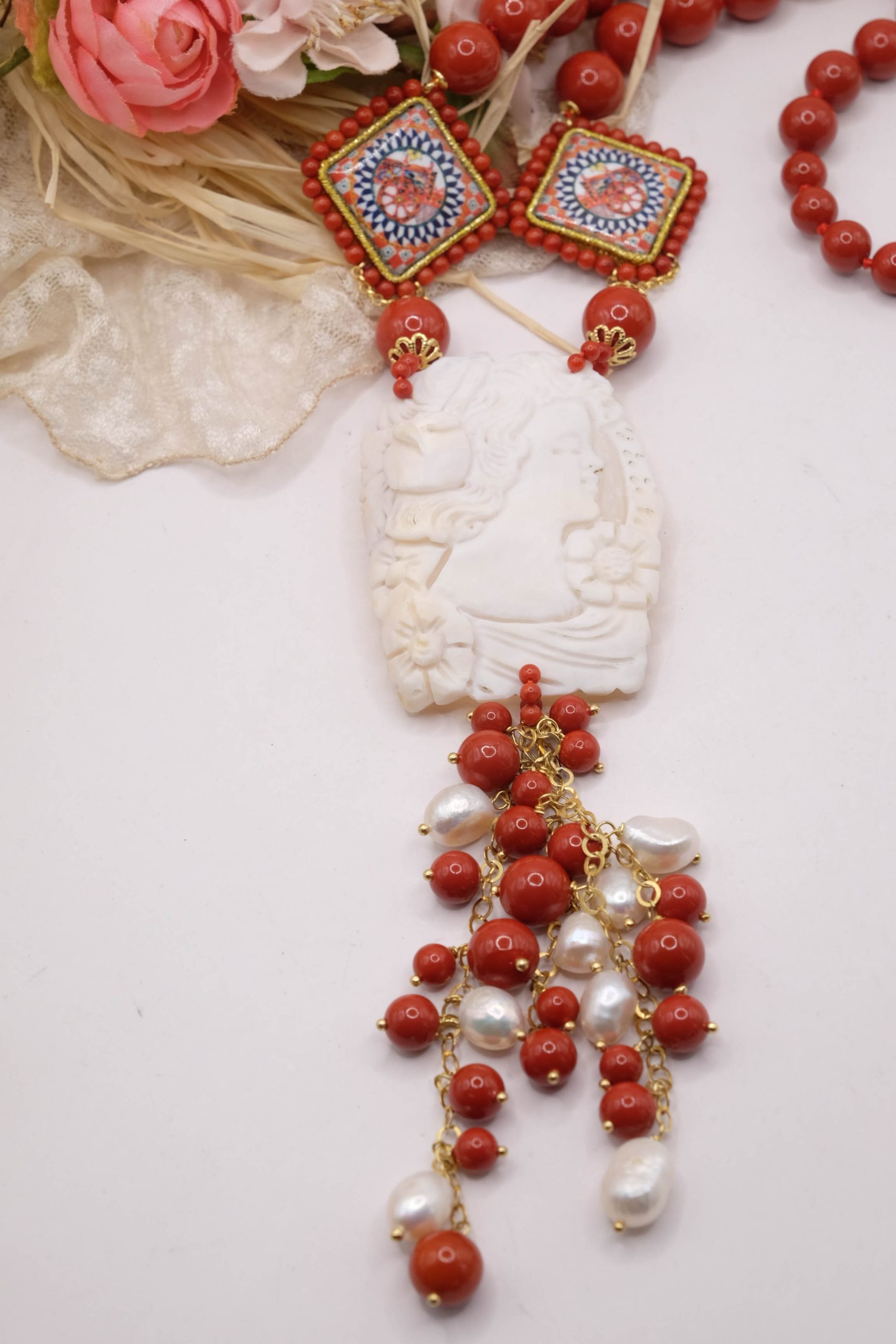 Preziosa collana in Pasta di corallo, mattonelle in ceramica di Caltagirone e cammeo conchiglia sardonica (misura 6,5 x 4,5 cm) realizzato a mano dai maestri incisori di Torre del Greco. Quando 2 culture si incontrano, quella campana e quella siciliana