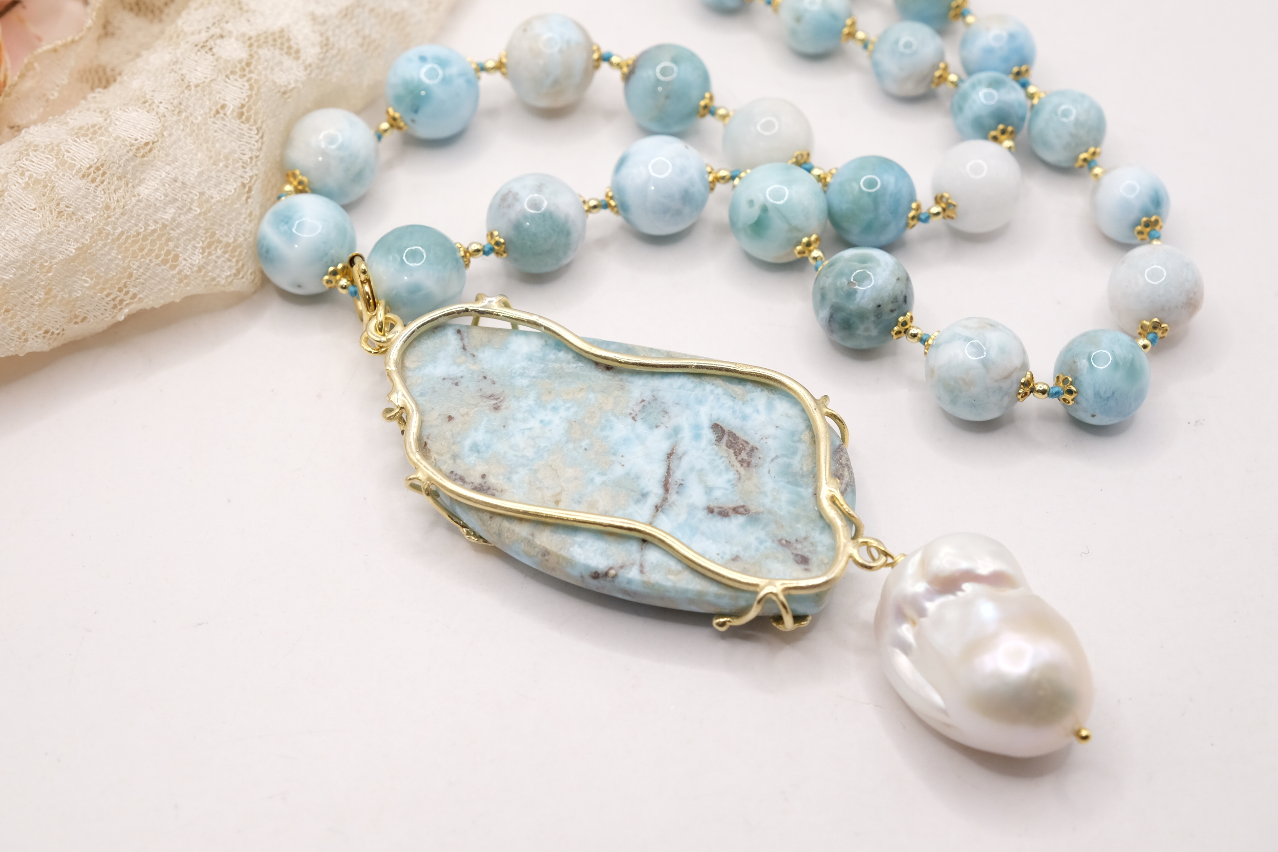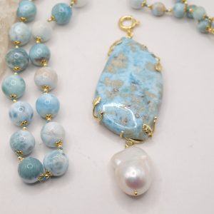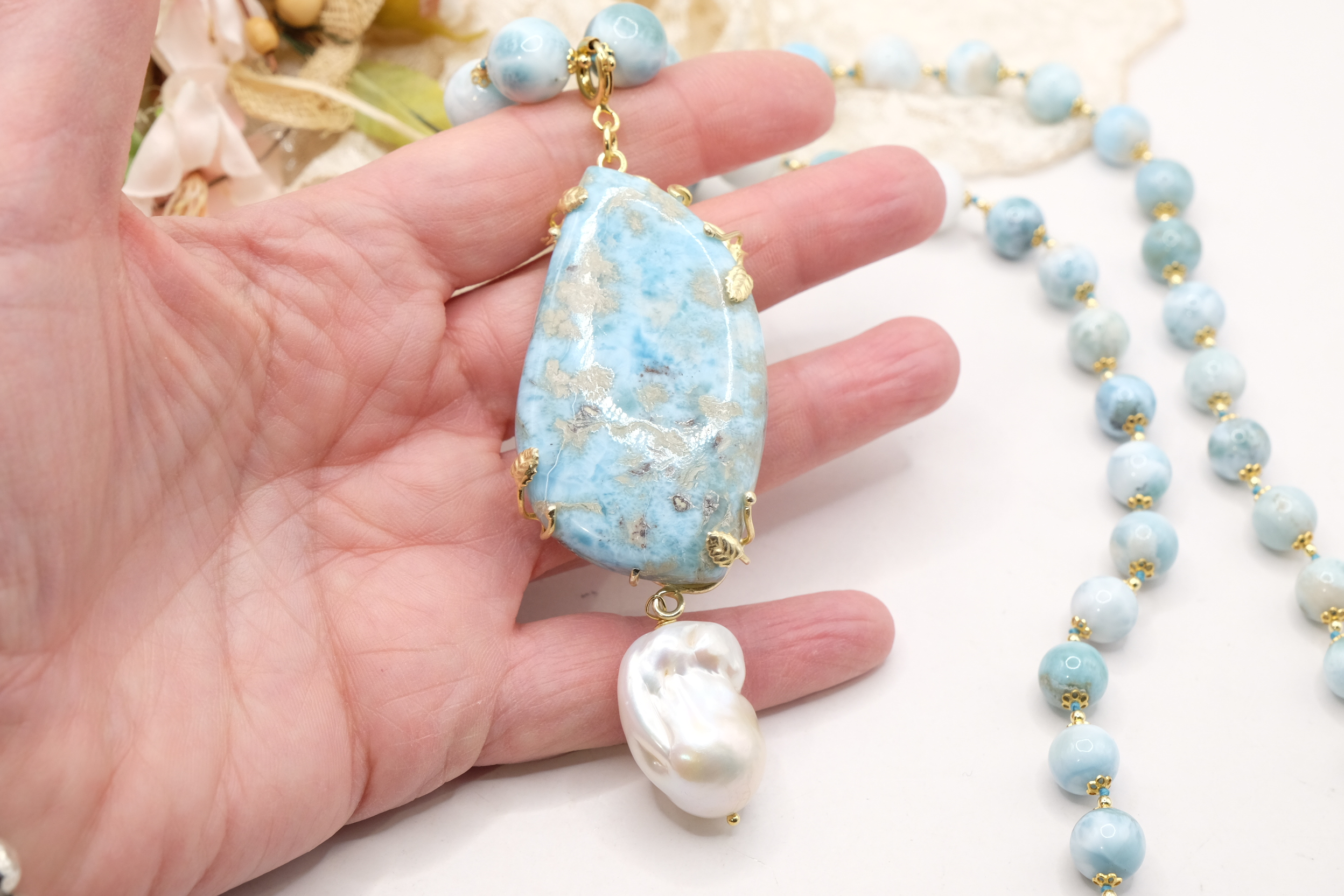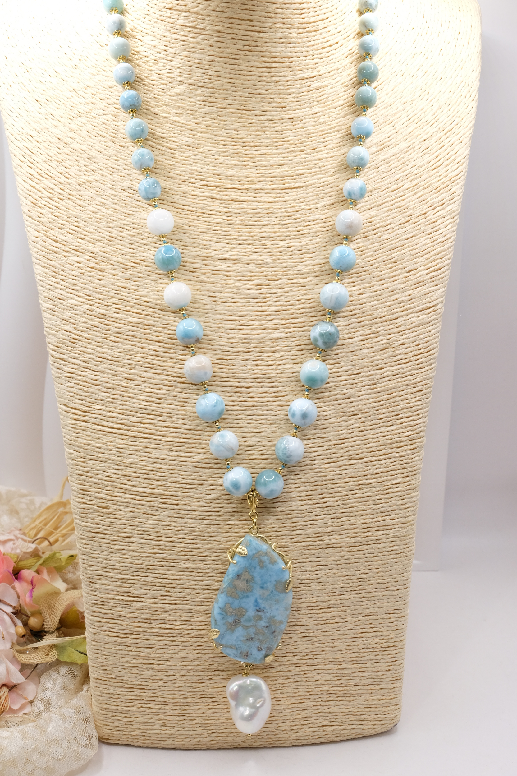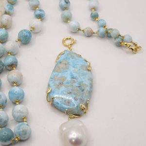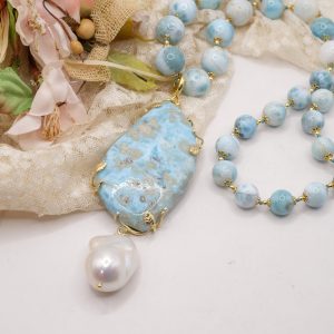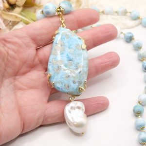 “Luce dei Caraibi: Collana in Larimar, Pietra d’Acqua Grezza e Perla Barocca”