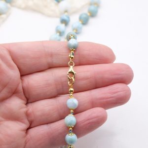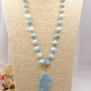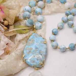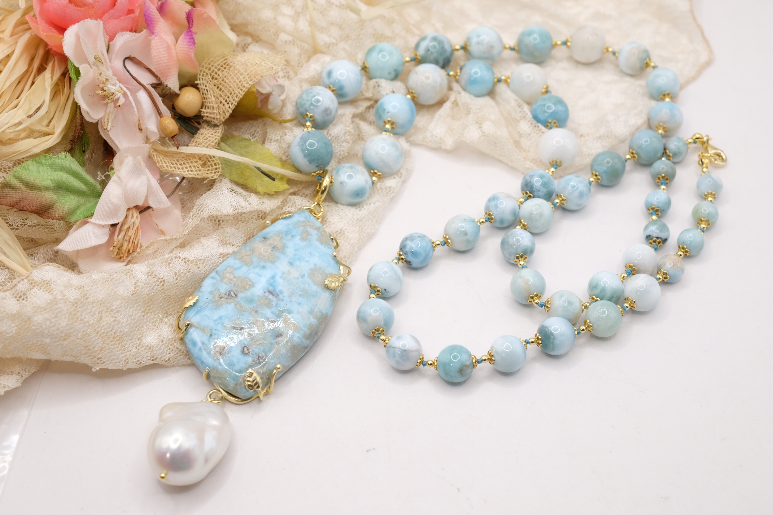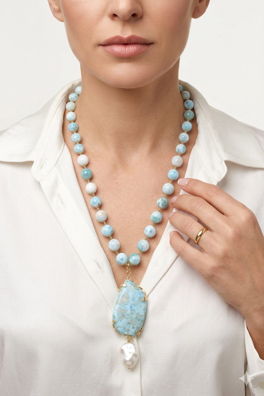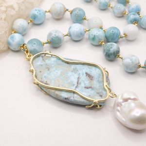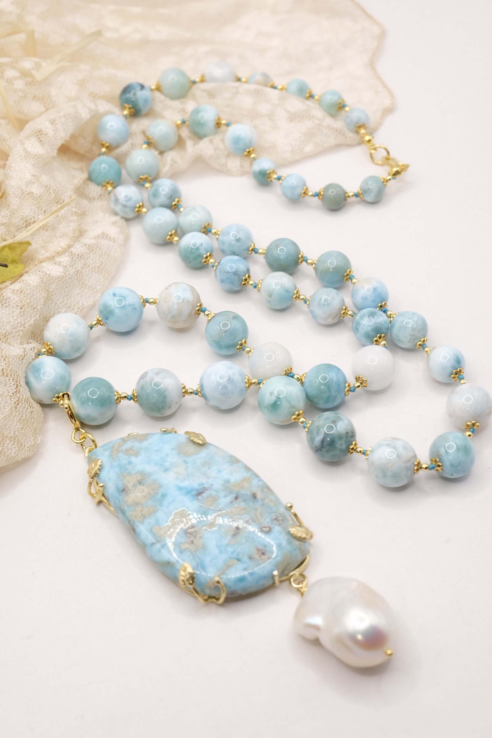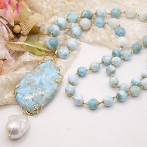 “Luce dei Caraibi: Collana in Larimar, Pietra d’Acqua Grezza e Perla Barocca”