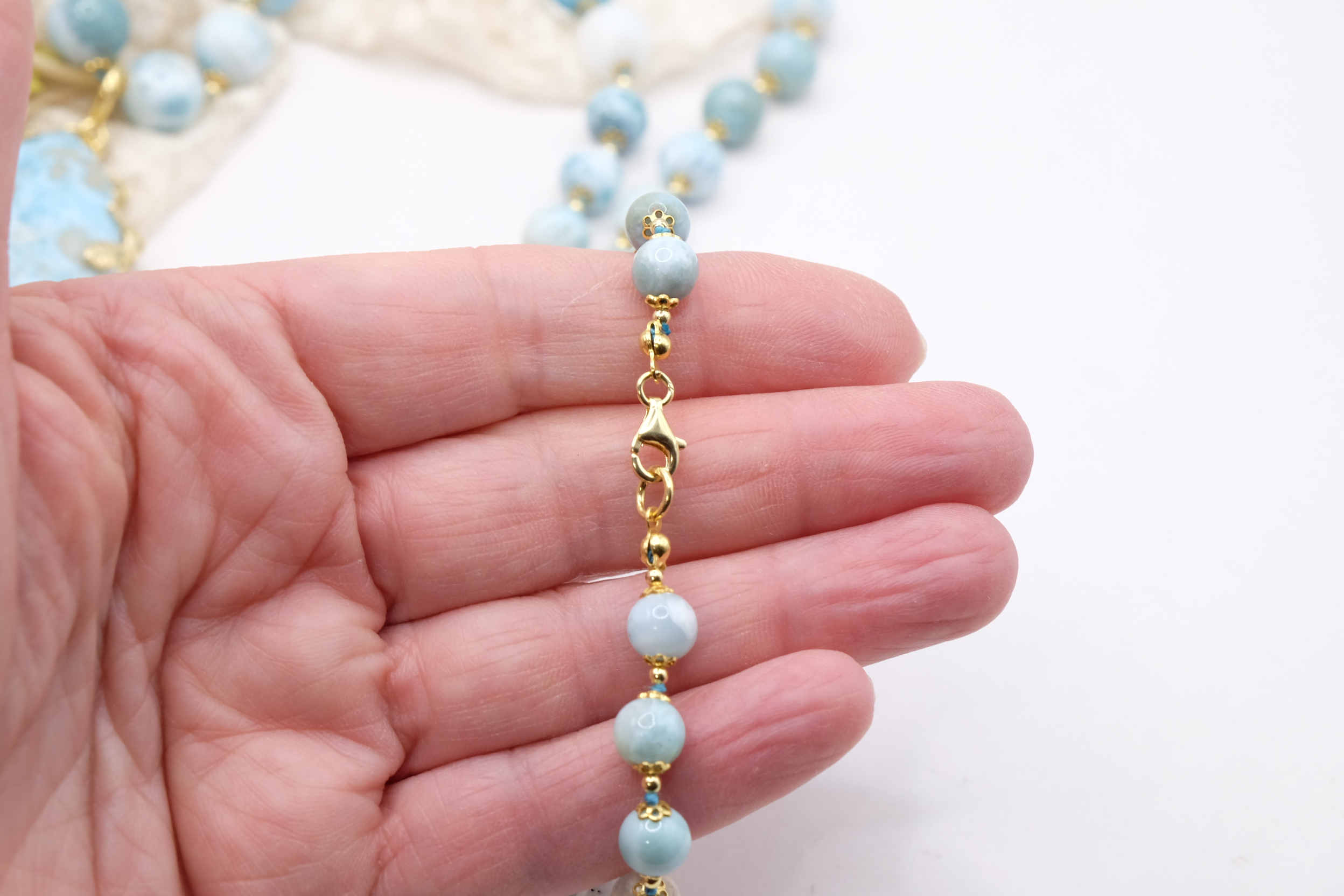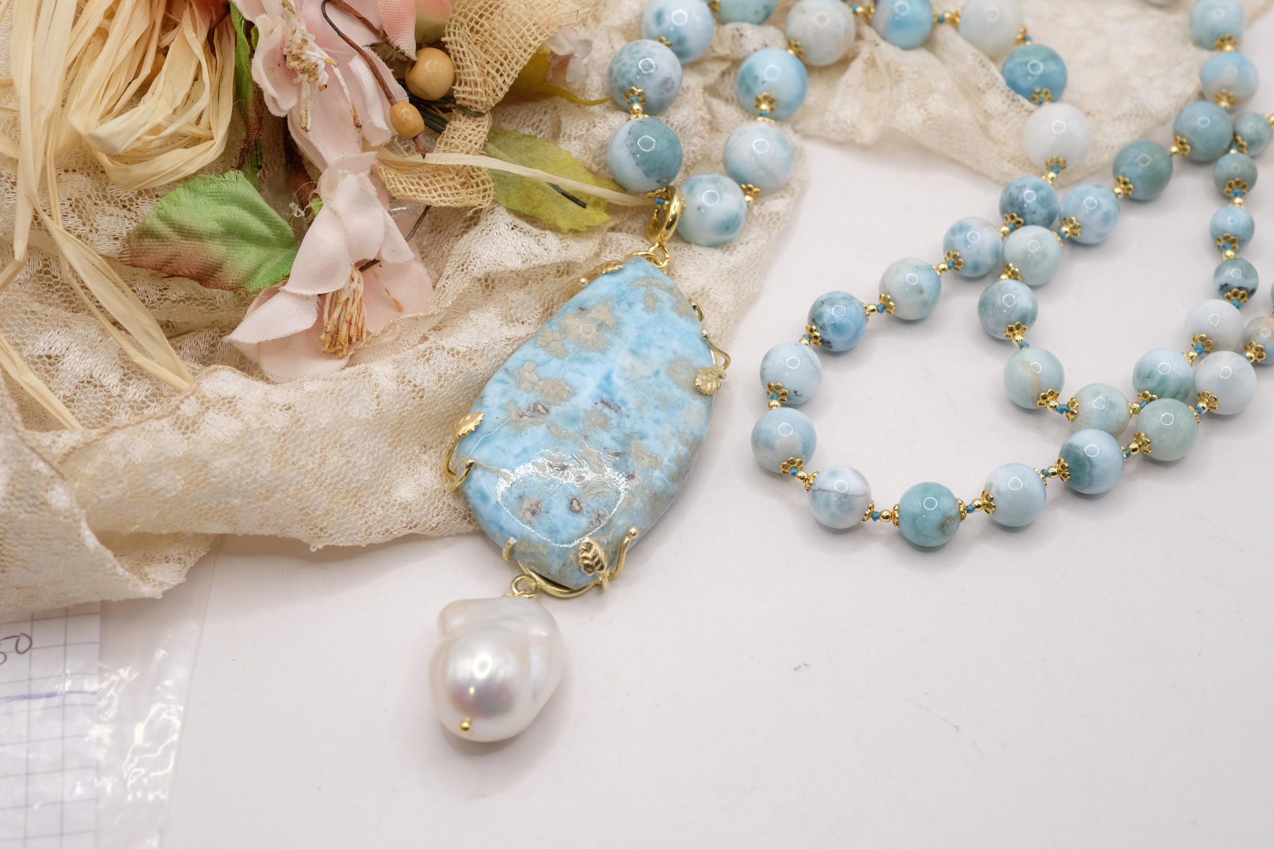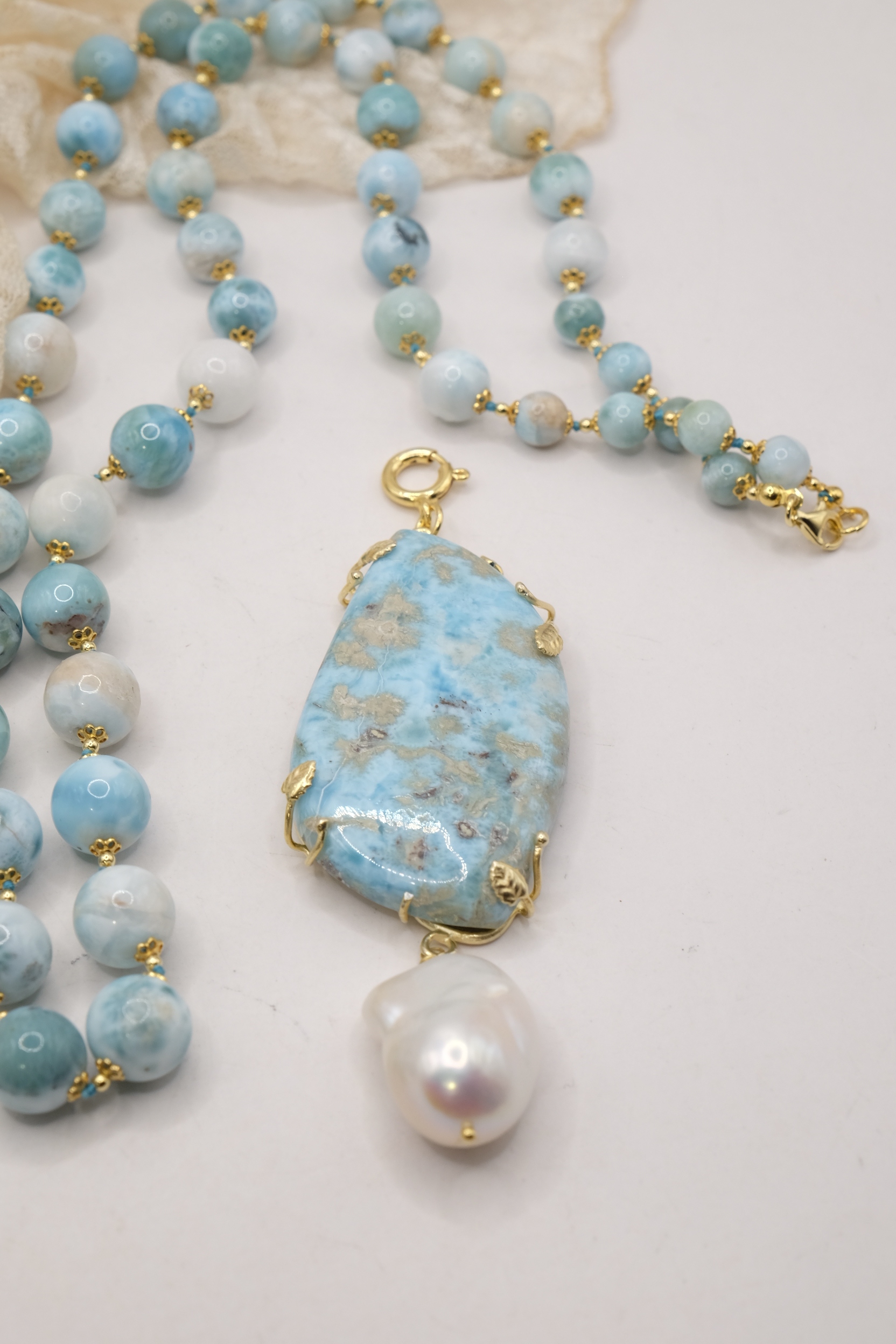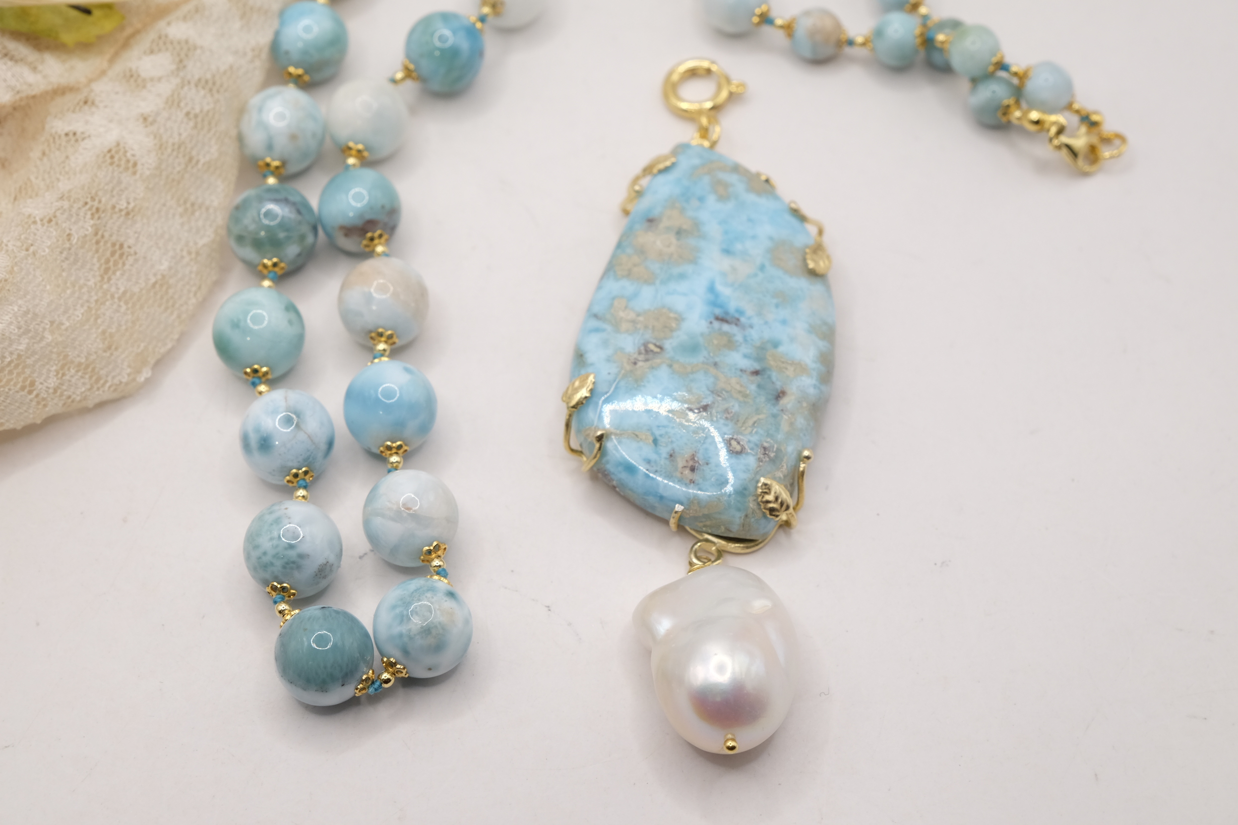 Questa collana artigianale unisce la delicatezza del larimar azzurro alla purezza della perla naturale, creando un equilibrio raffinato e ricercato.