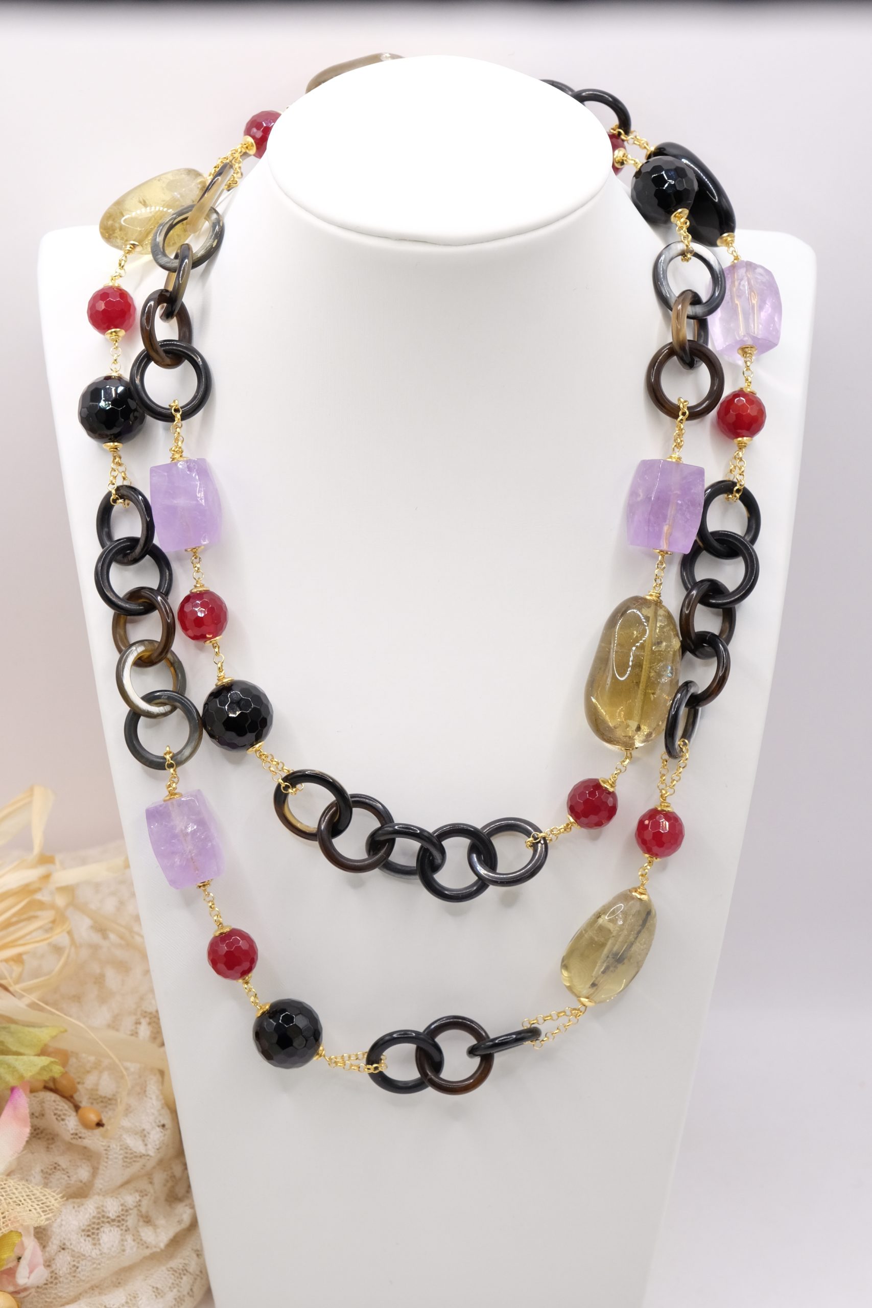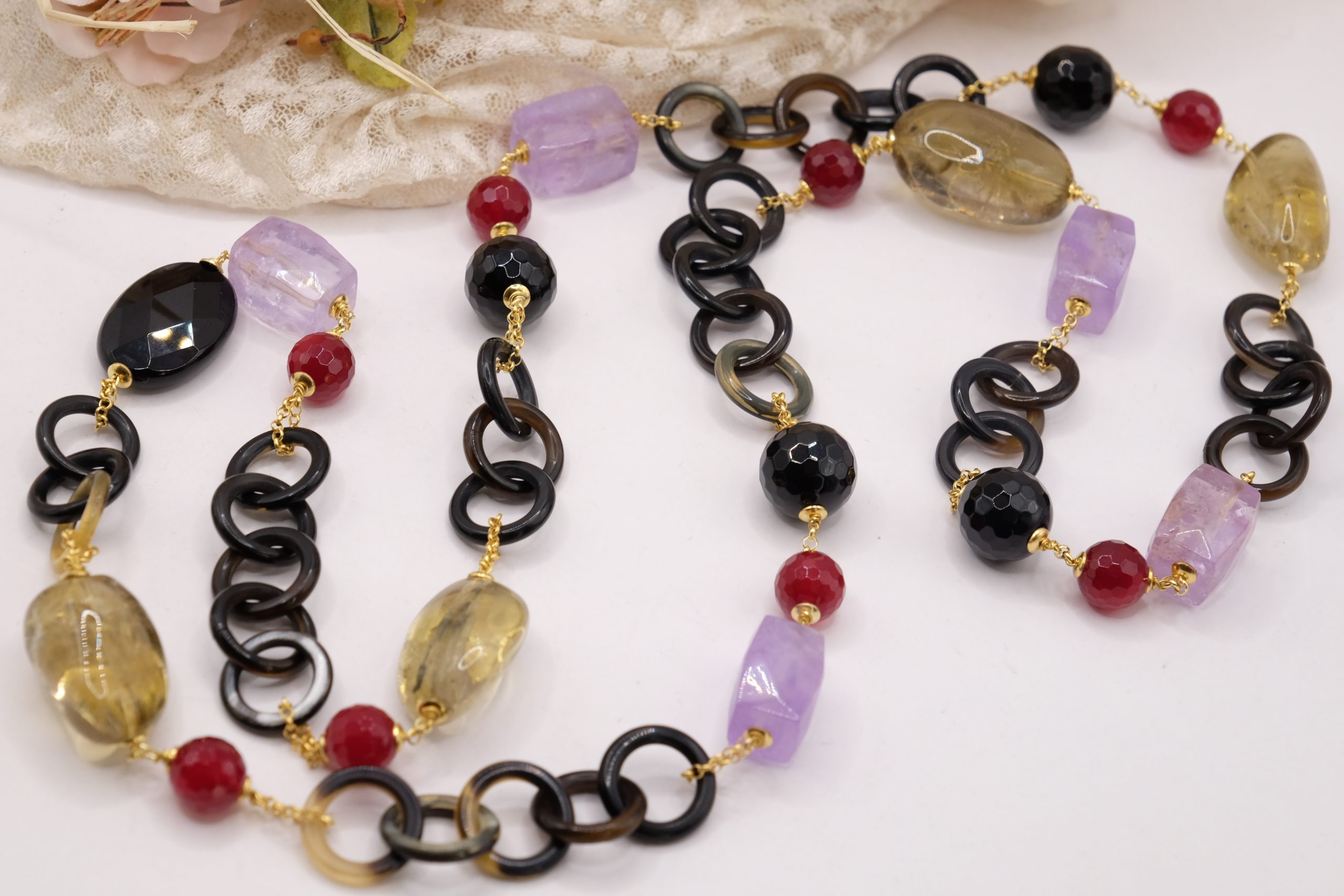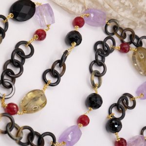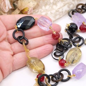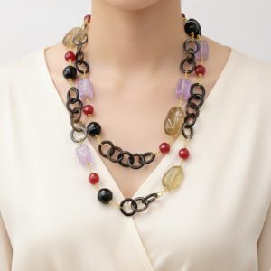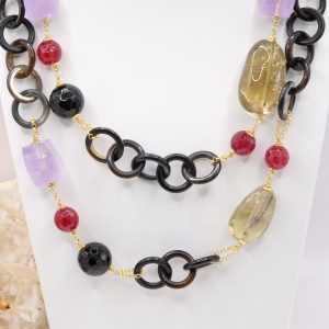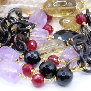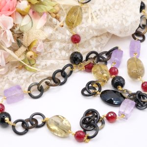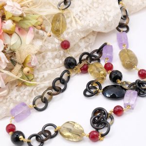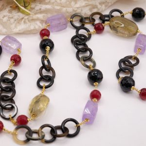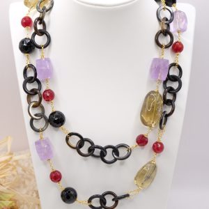 Aggiungi un tocco di eleganza e fascino al tuo look con questa elegante collana lunga con luminose pietre top quality: Onice, Ametista, Quarzo Citrino, Giada Borgogna, alternate ad anelli di corno nero e catenine in argento 925 placcato oro