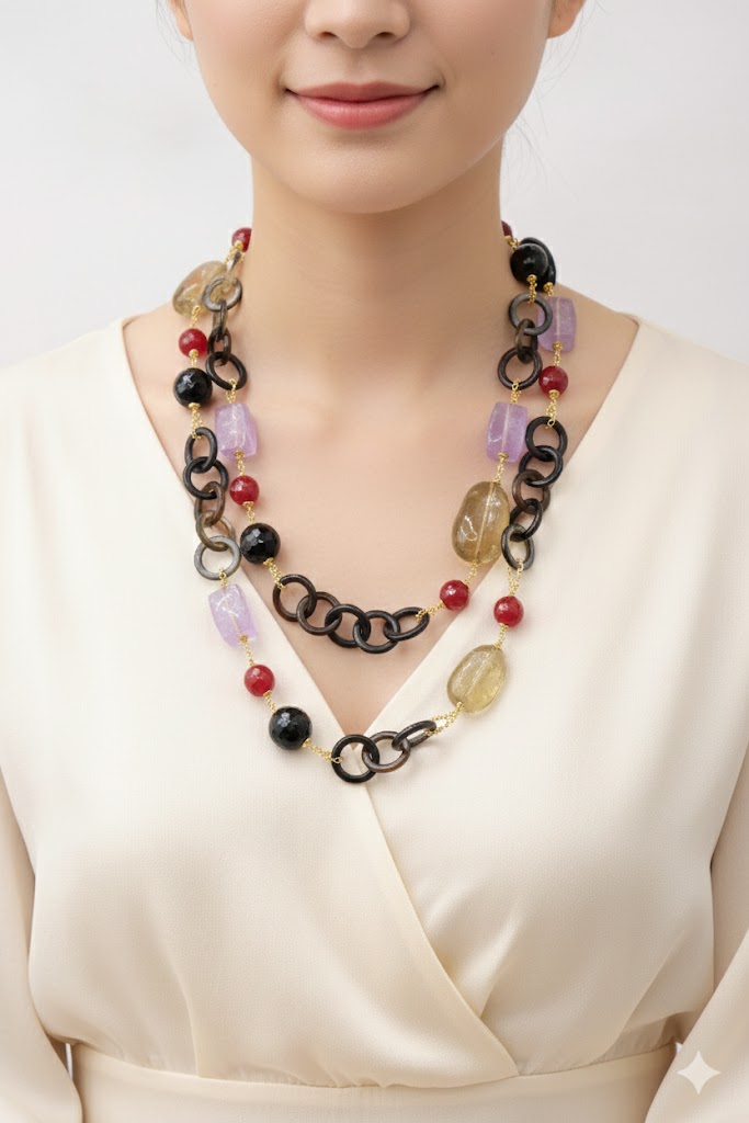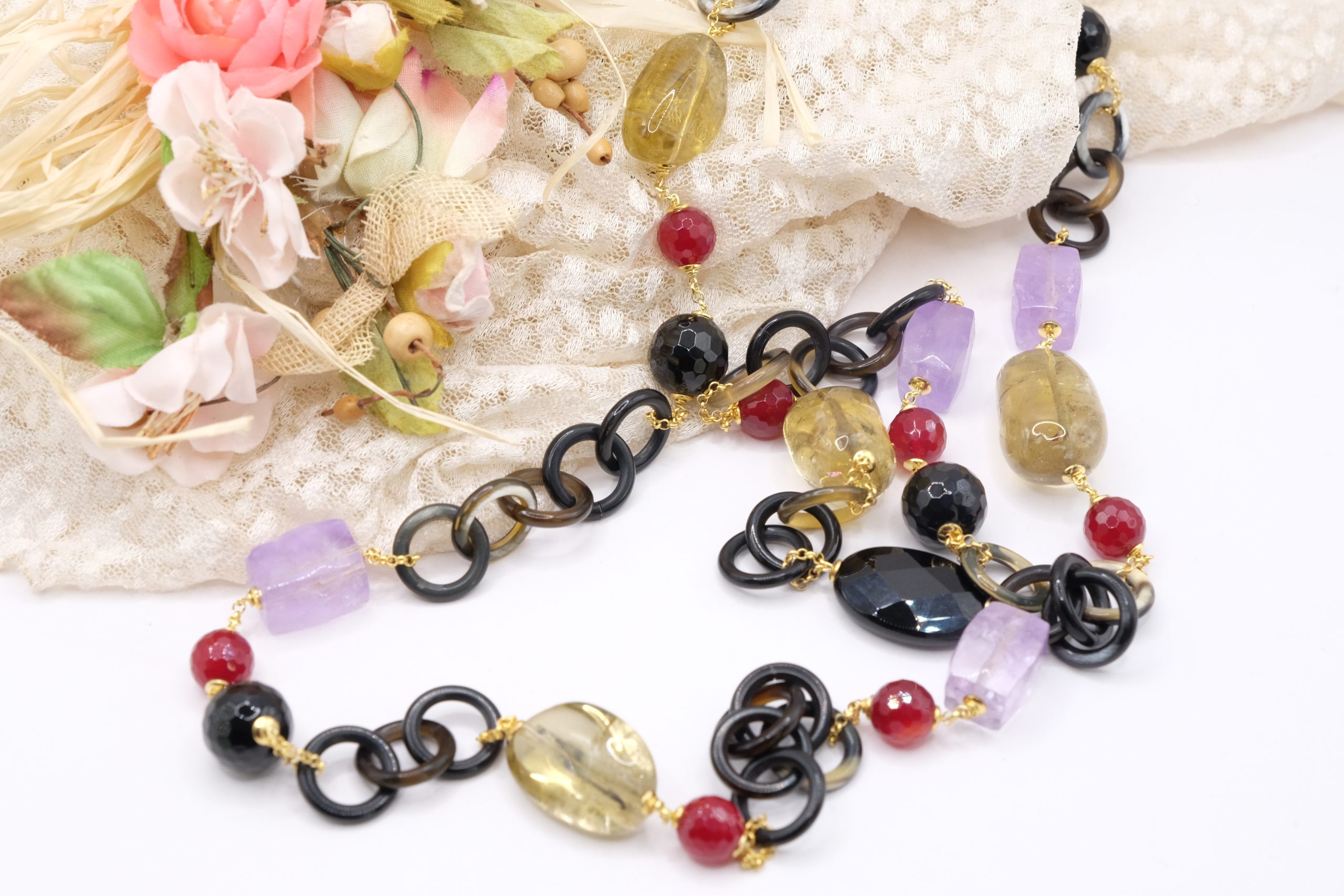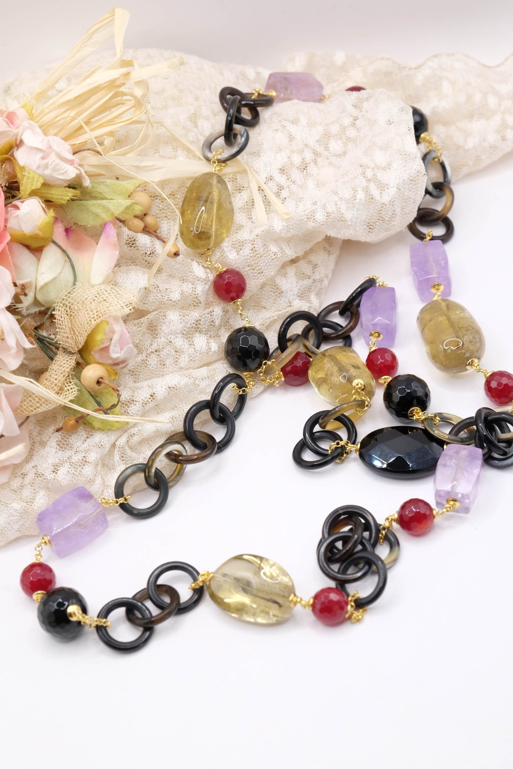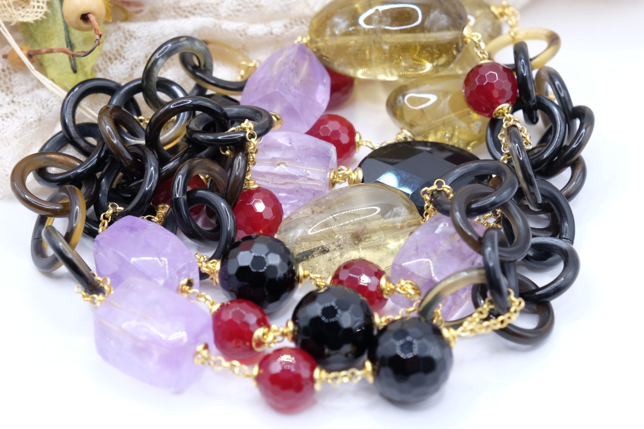 Aggiungi un tocco di eleganza e fascino al tuo look con questa elegante collana lunga con luminose pietre top quality: Onice, Ametista, Quarzo Citrino, Giada Borgogna, alternate ad anelli di corno nero e catenine in argento 925 placcato oro