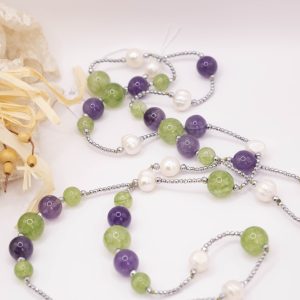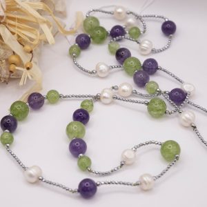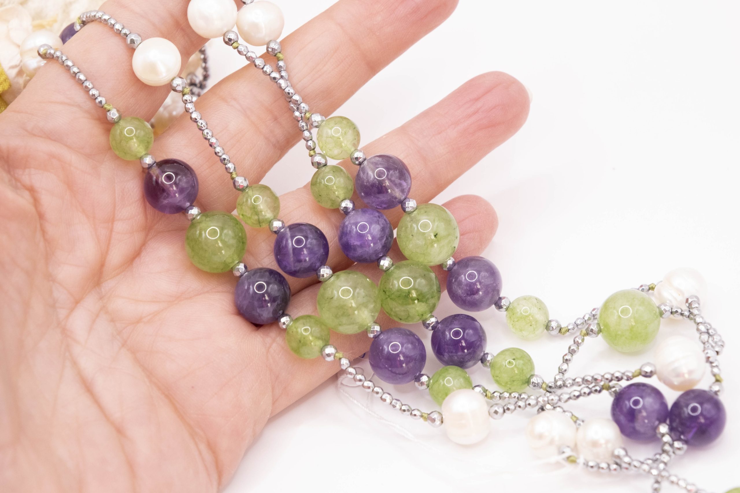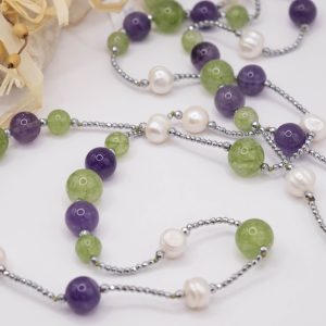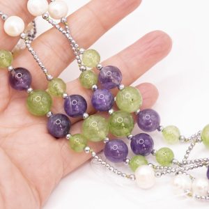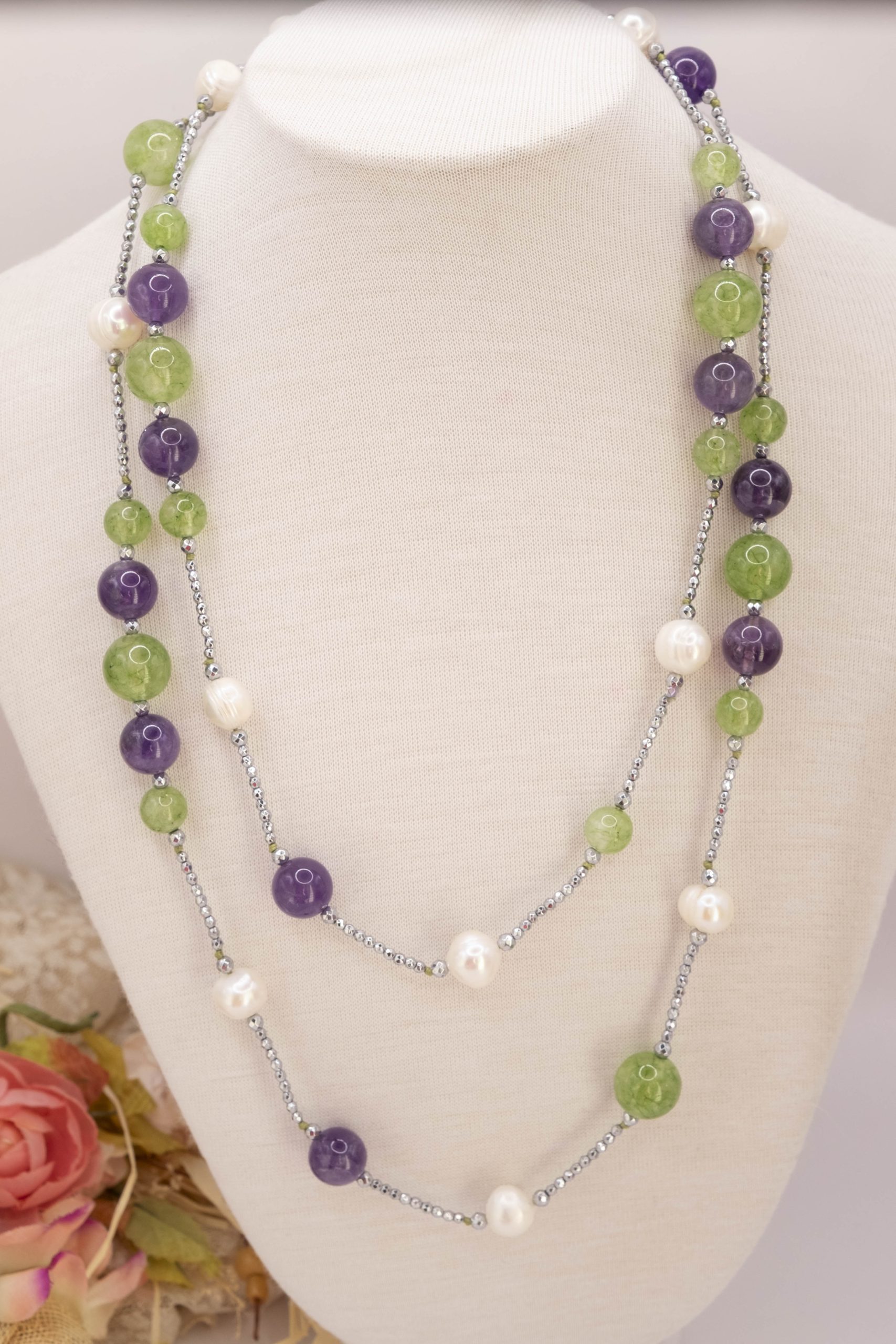 Collana di giada verde, ametista naturale, ematite silver brillante e perle naturali luminose.