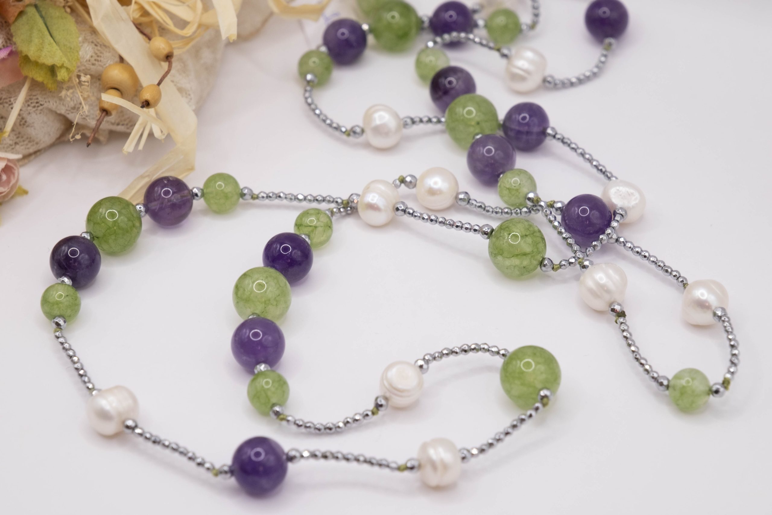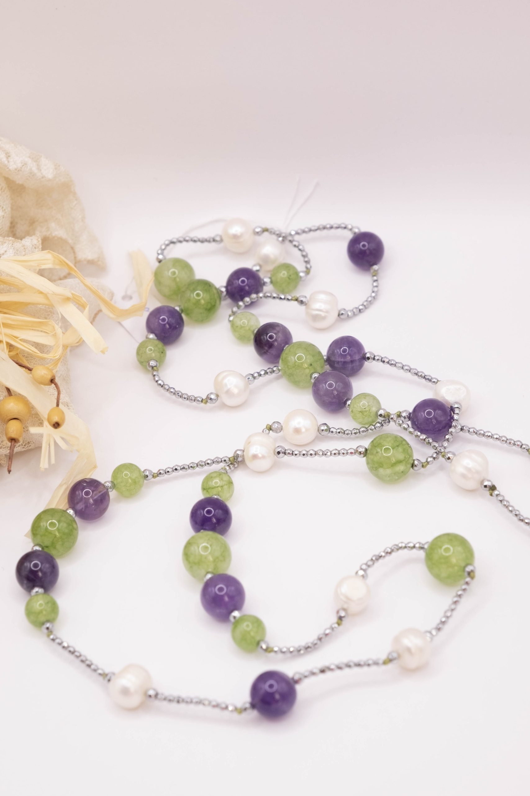 Collana Lunga Giada Verde Ametista Perle Naturali Ematite