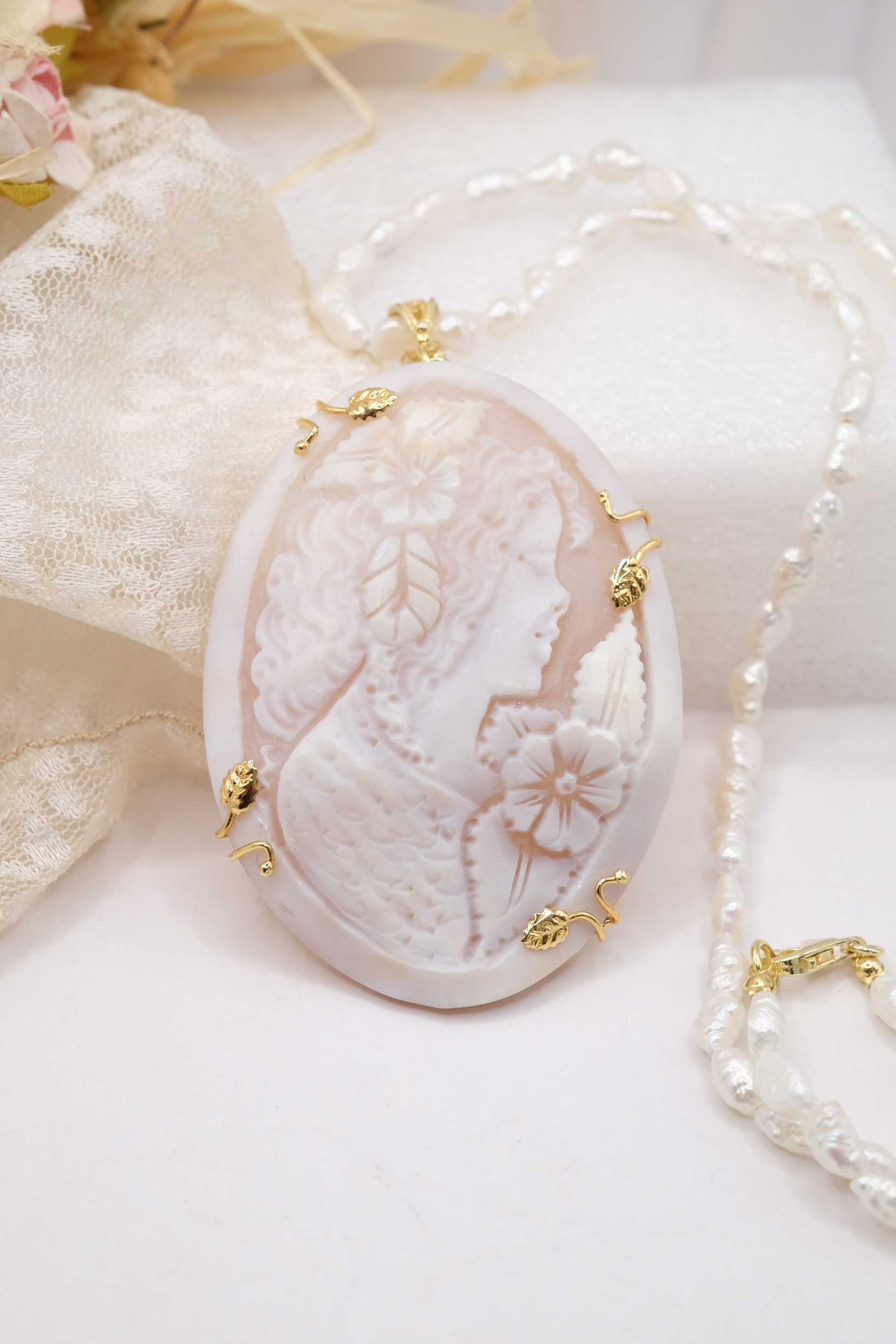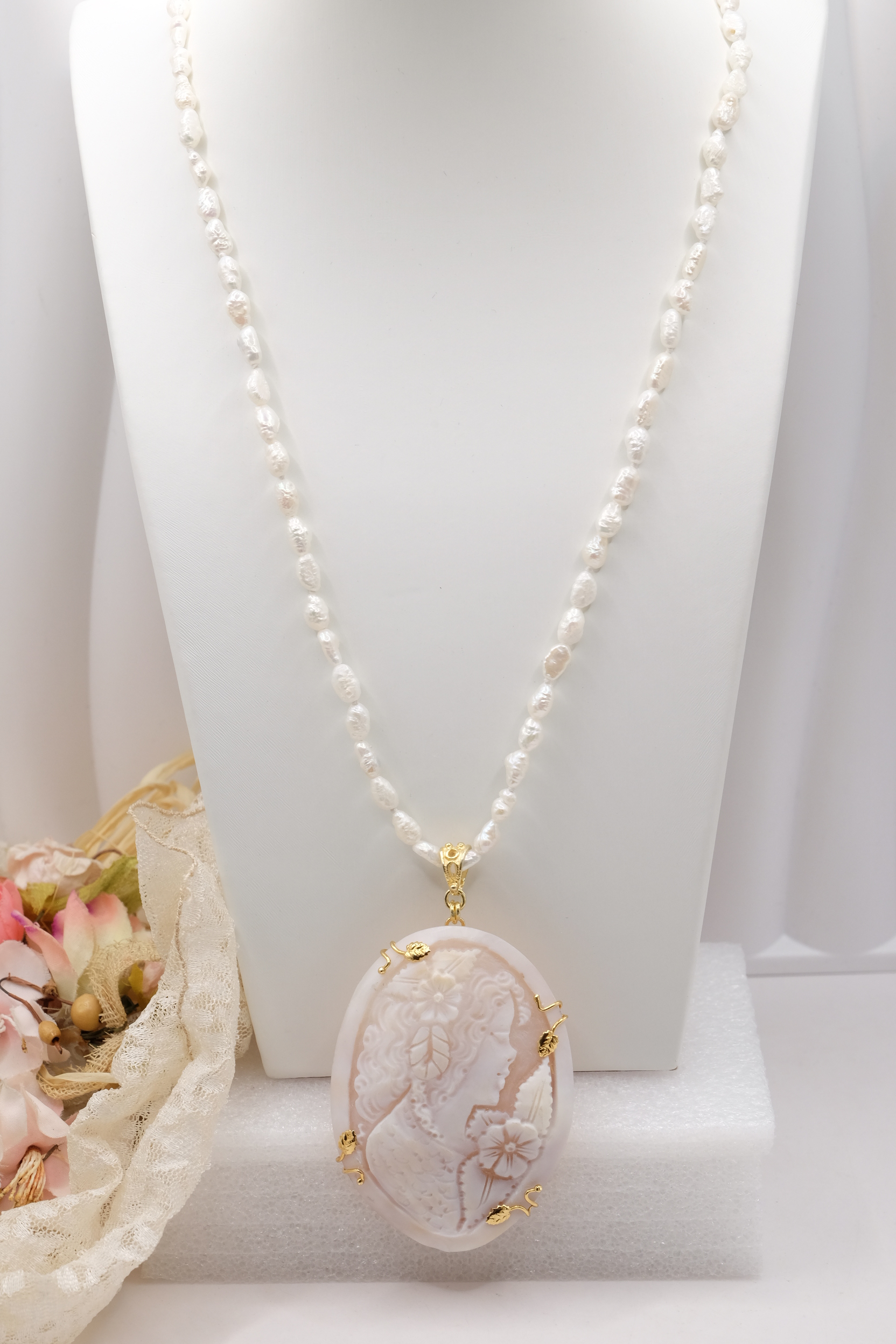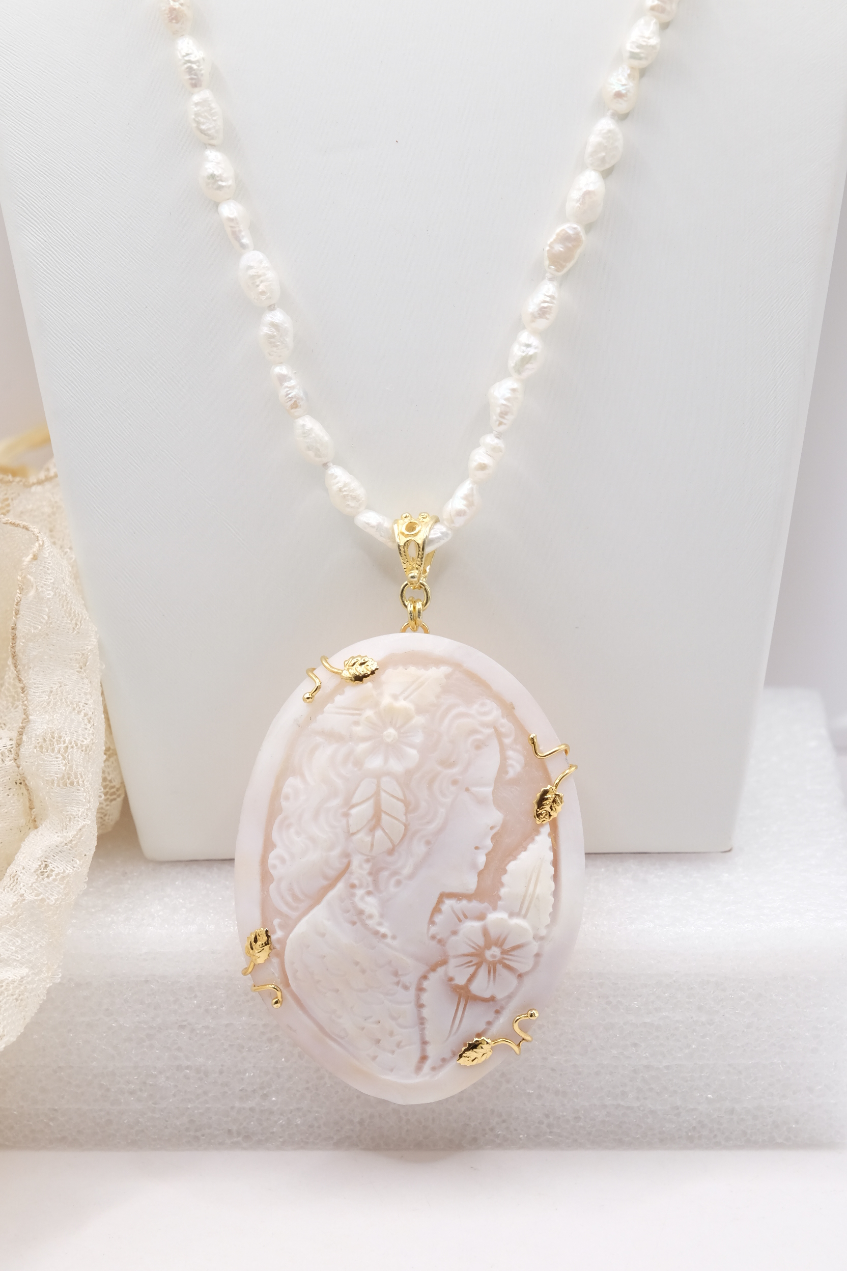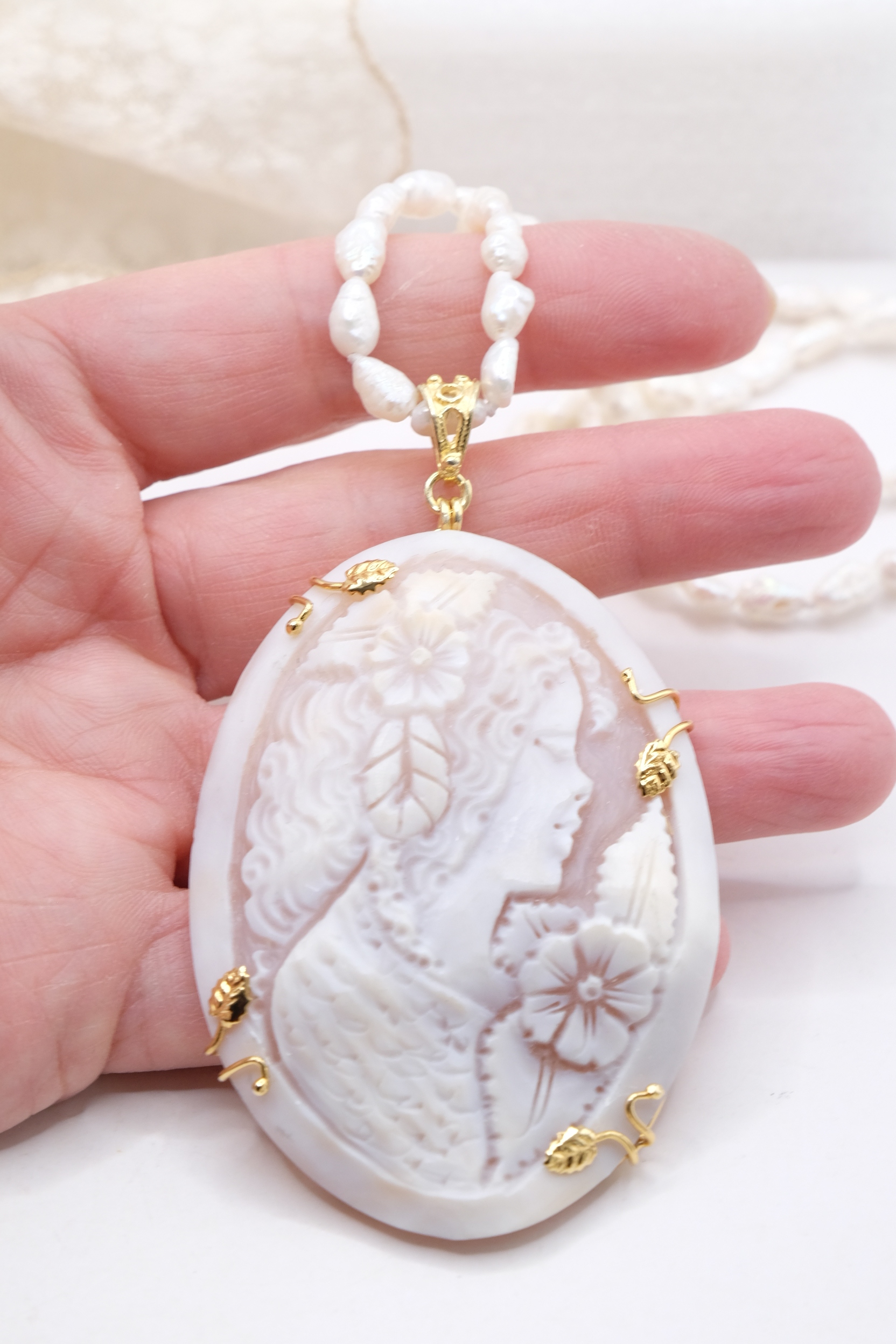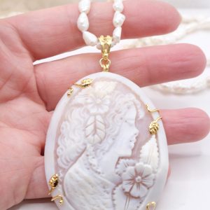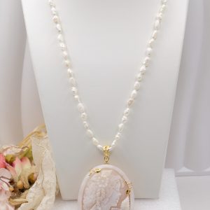 Collana di luminose micro perle naturali barocche, con un bellissimo cammeo, inciso a mano dai maestri incisori di Torre del Greco in cornice di argento 925 placcato oro, misura 8,5 x 5 cm.