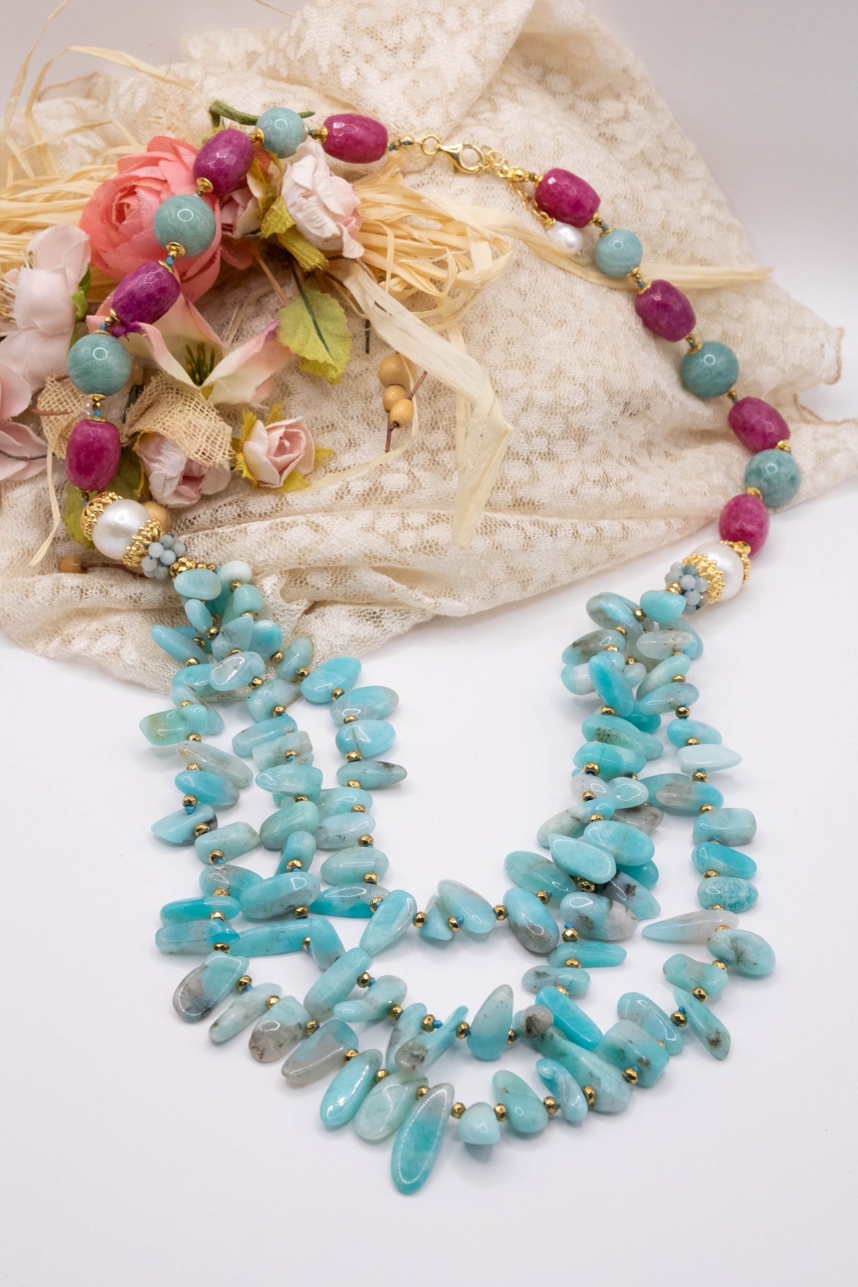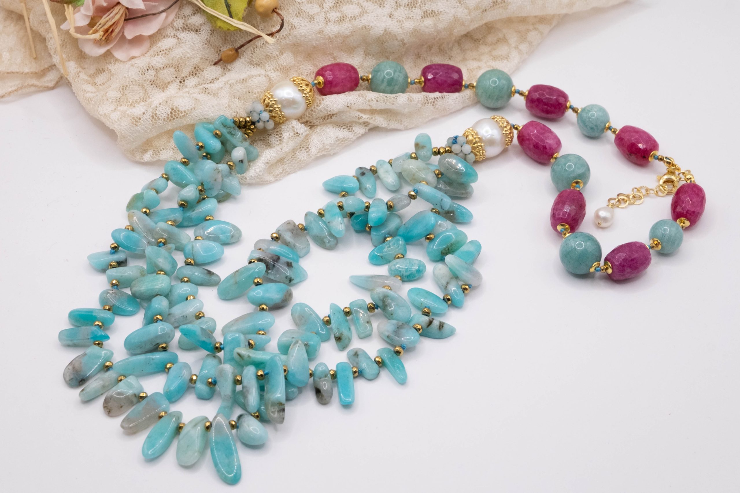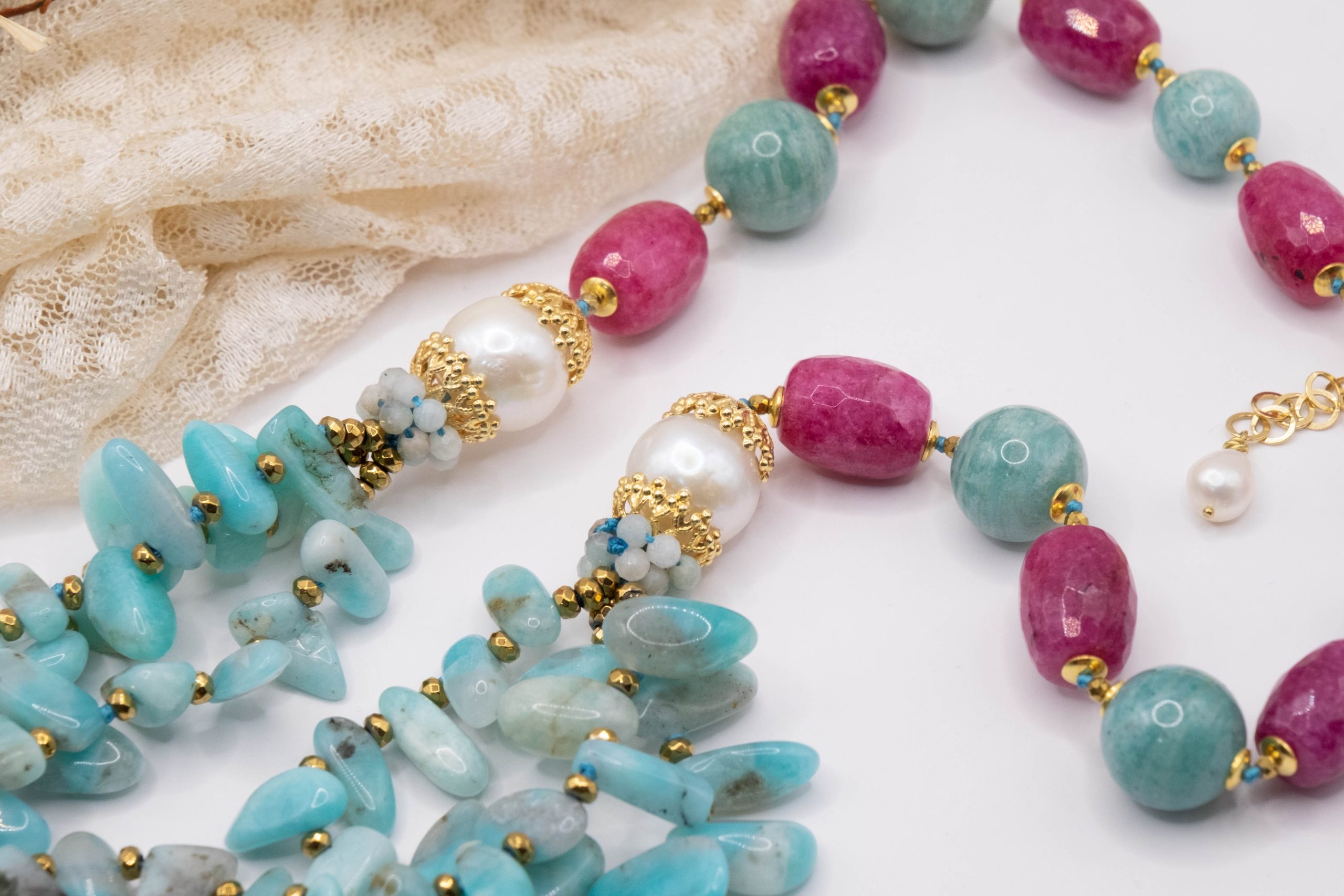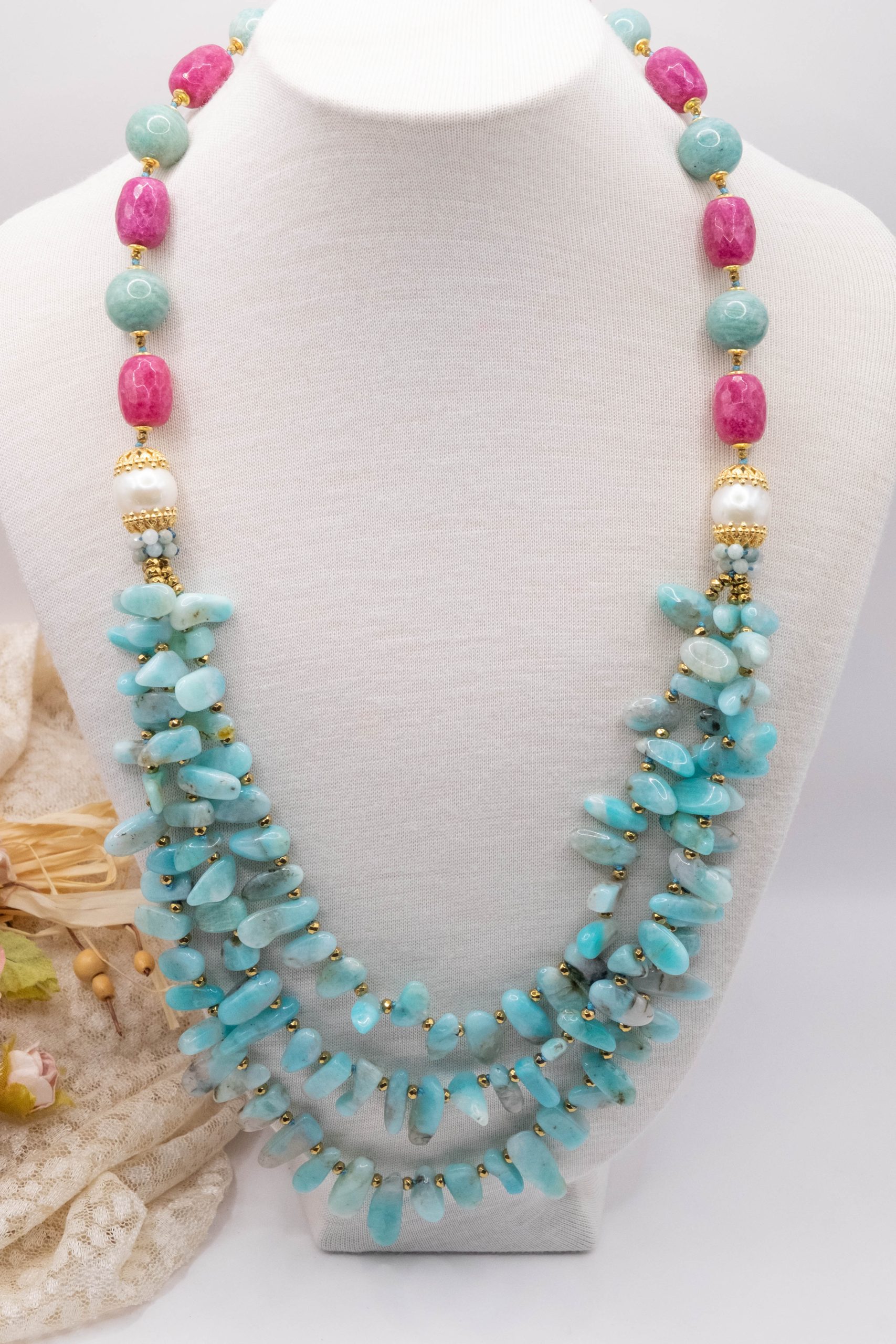 Collana Multifilo Amazzonite Giada Fucsia Perle e Argento