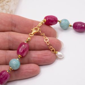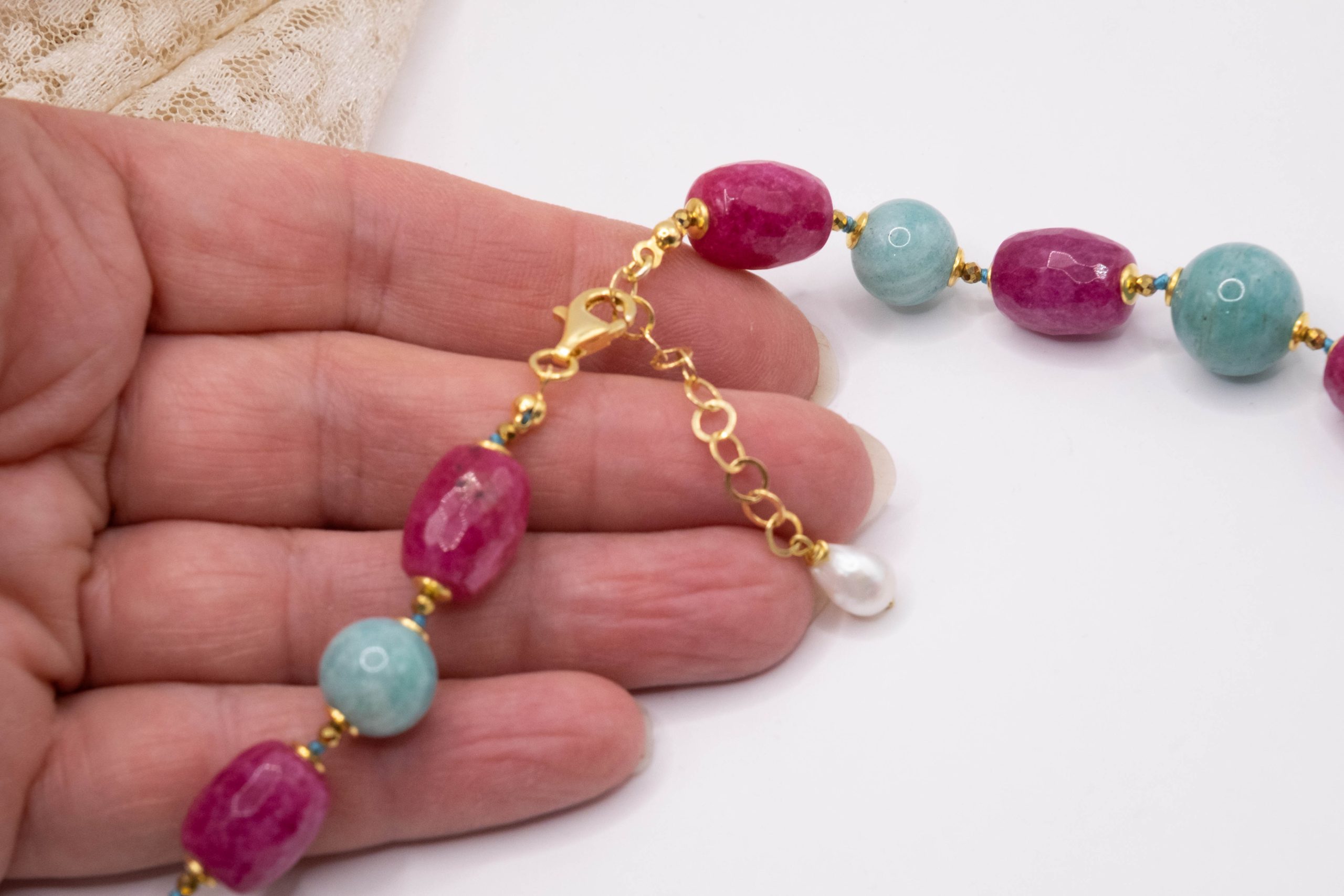 La parte superiore unisce sfere di amazzonite, giada fucsia e perle naturali dal diametro di 13 mm.