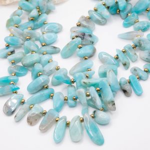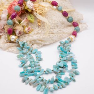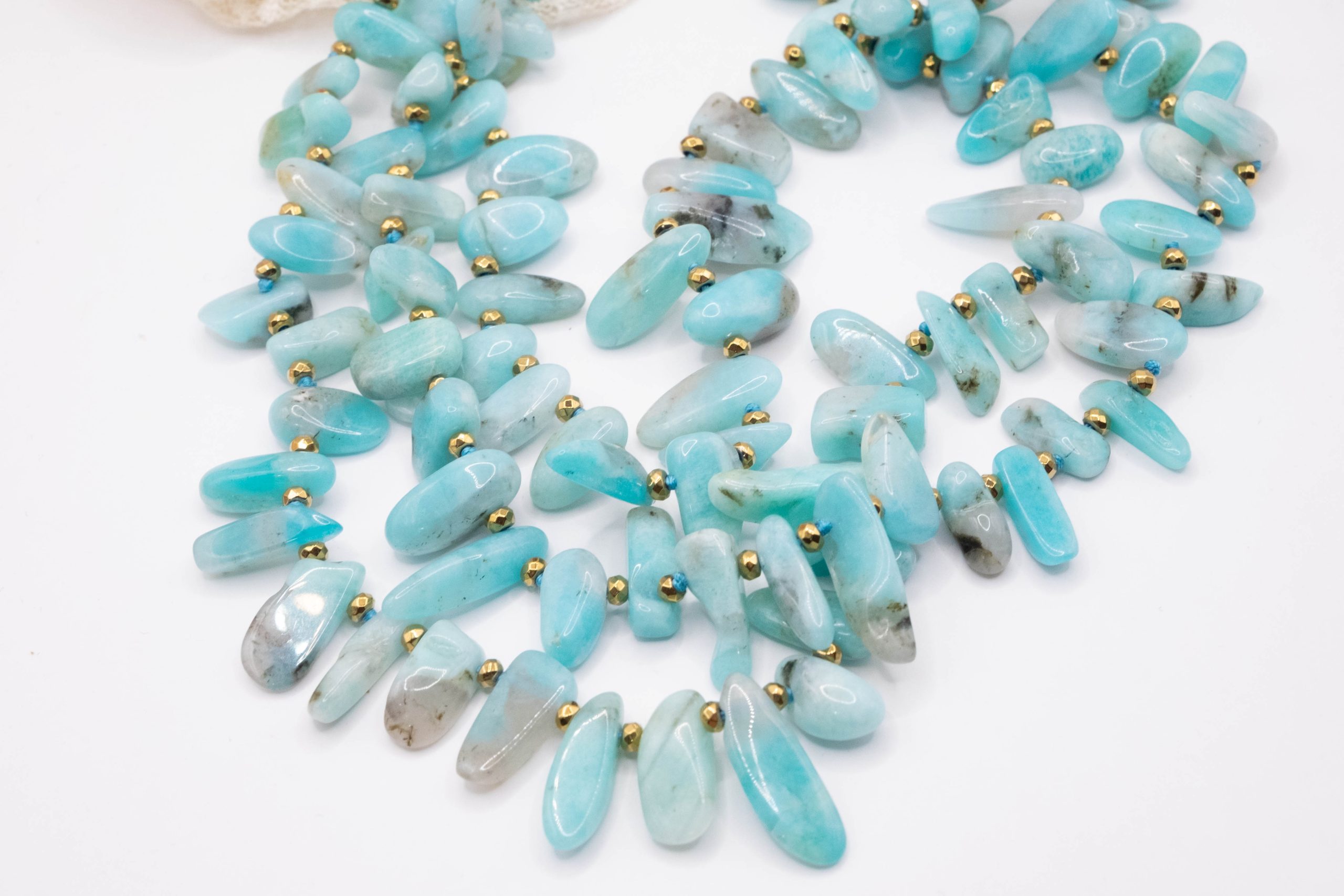 Il finale si apre in tre fili morbidi di scagliette in amazzonite naturale. L’intera collana è intervallata da punti luce in ematite gold, per uno scintillio delicato e raffinato.