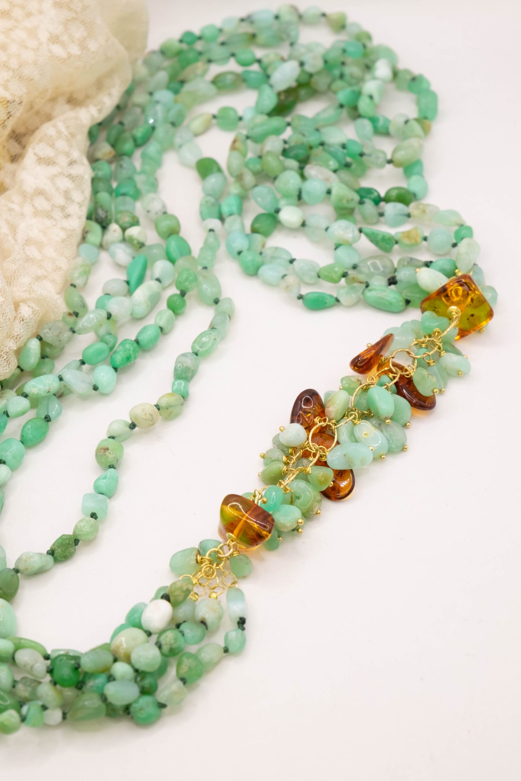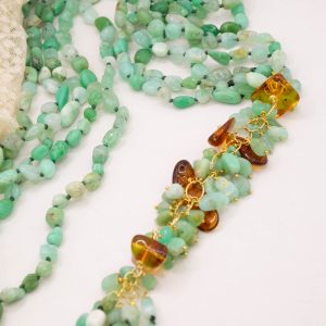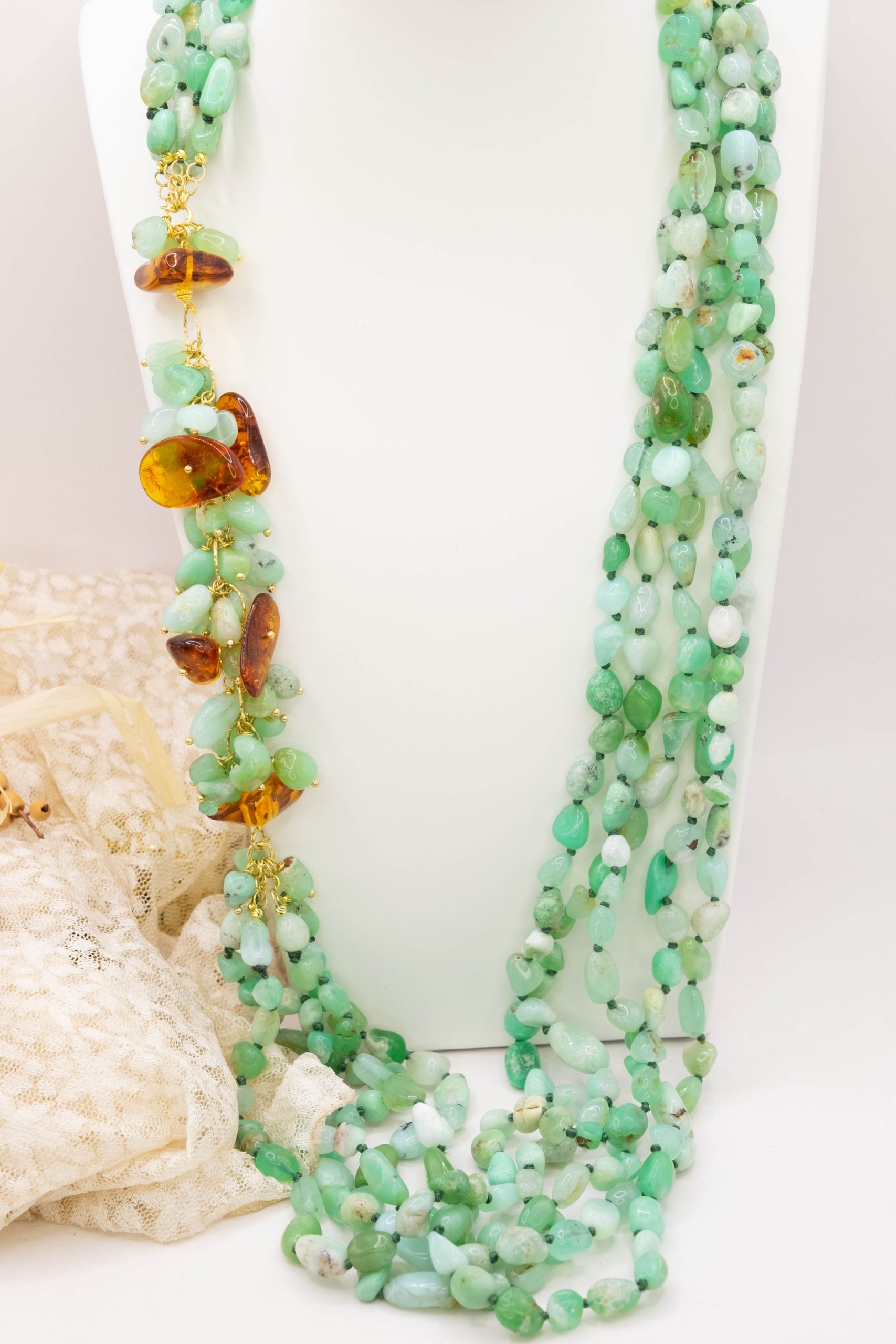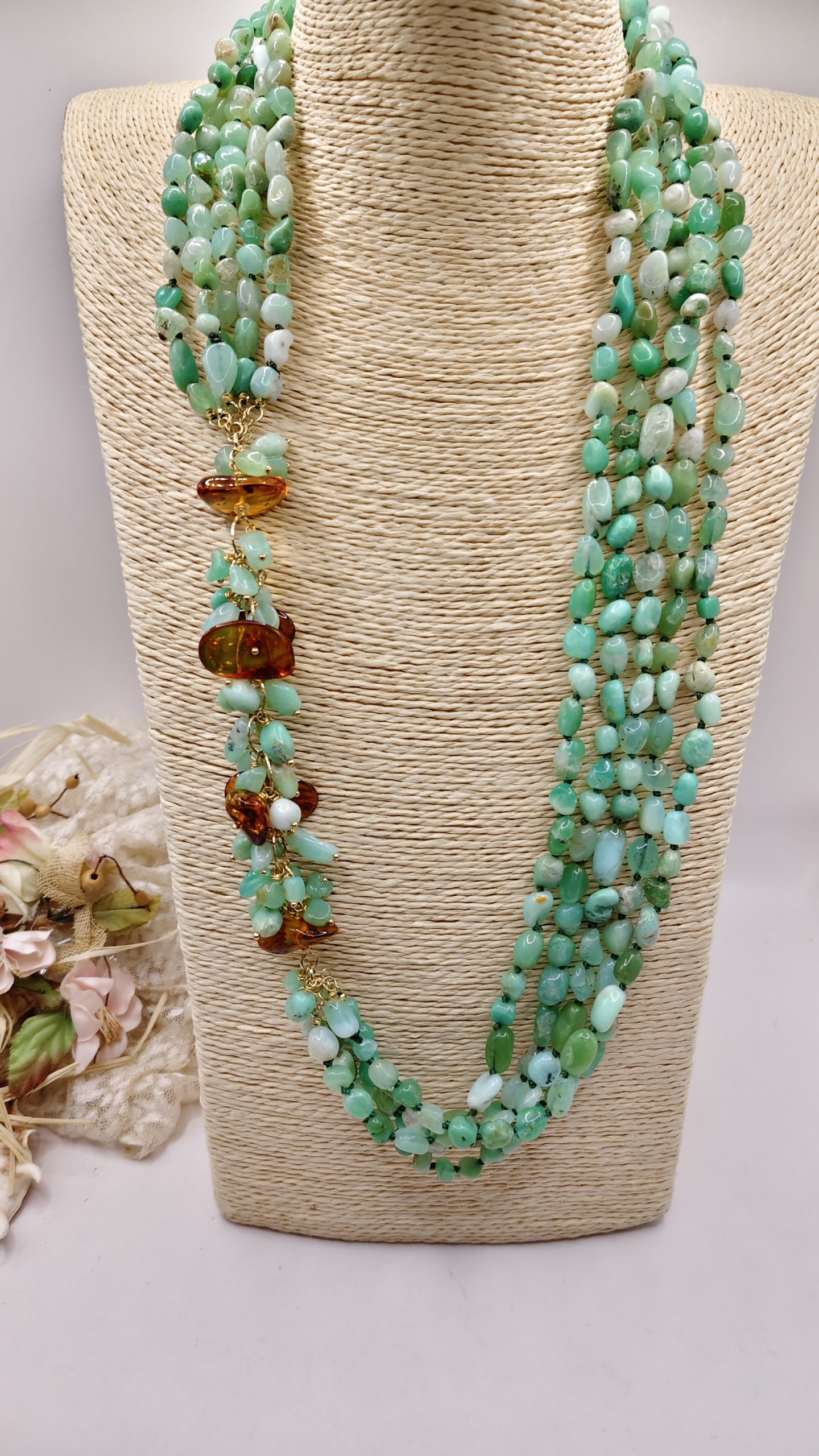 Bellissima collana artigianale multifilo (5 fili) di incantevole crisoprasio verde e laterale a grappoli in crisoprasio e ambra del baltico. Le finiture sono in argento 925 placcato oro