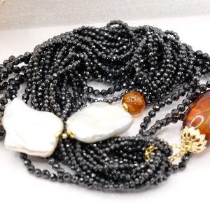 Collana Multifilo Decoltè Zirconi Neri Ambra del Baltico Perle Argento 925