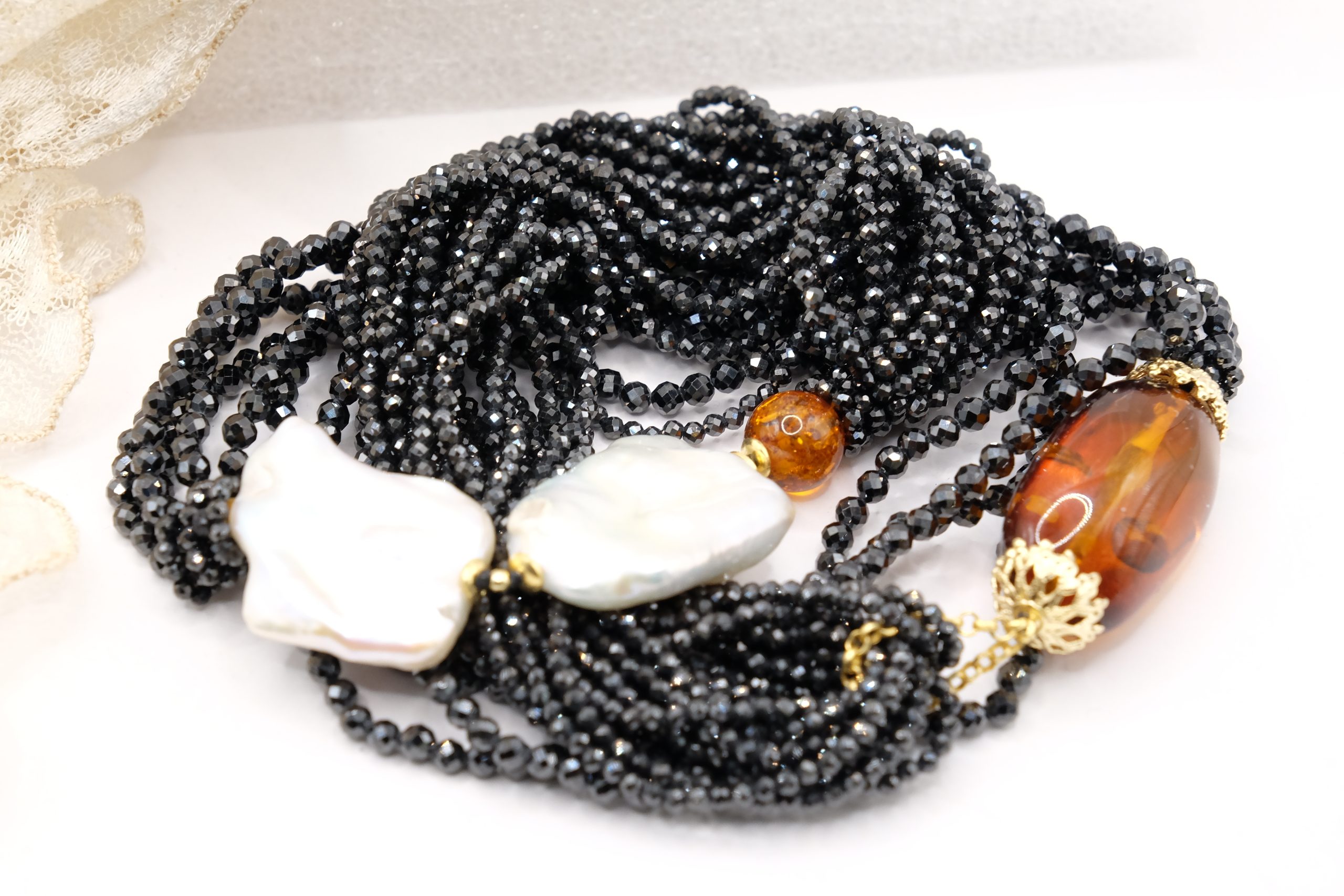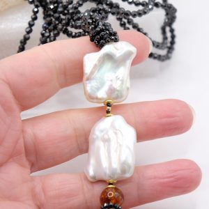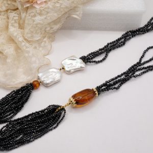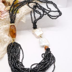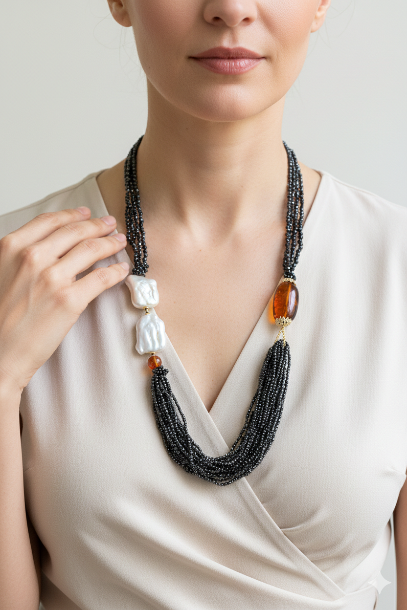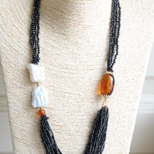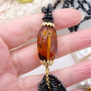 Aggiungi un tocco di eleganza e fascino al tuo look con questa collana in zirconi neri luminosi come brillanti, perle quadrate naturali e superlativa ambra del Baltico