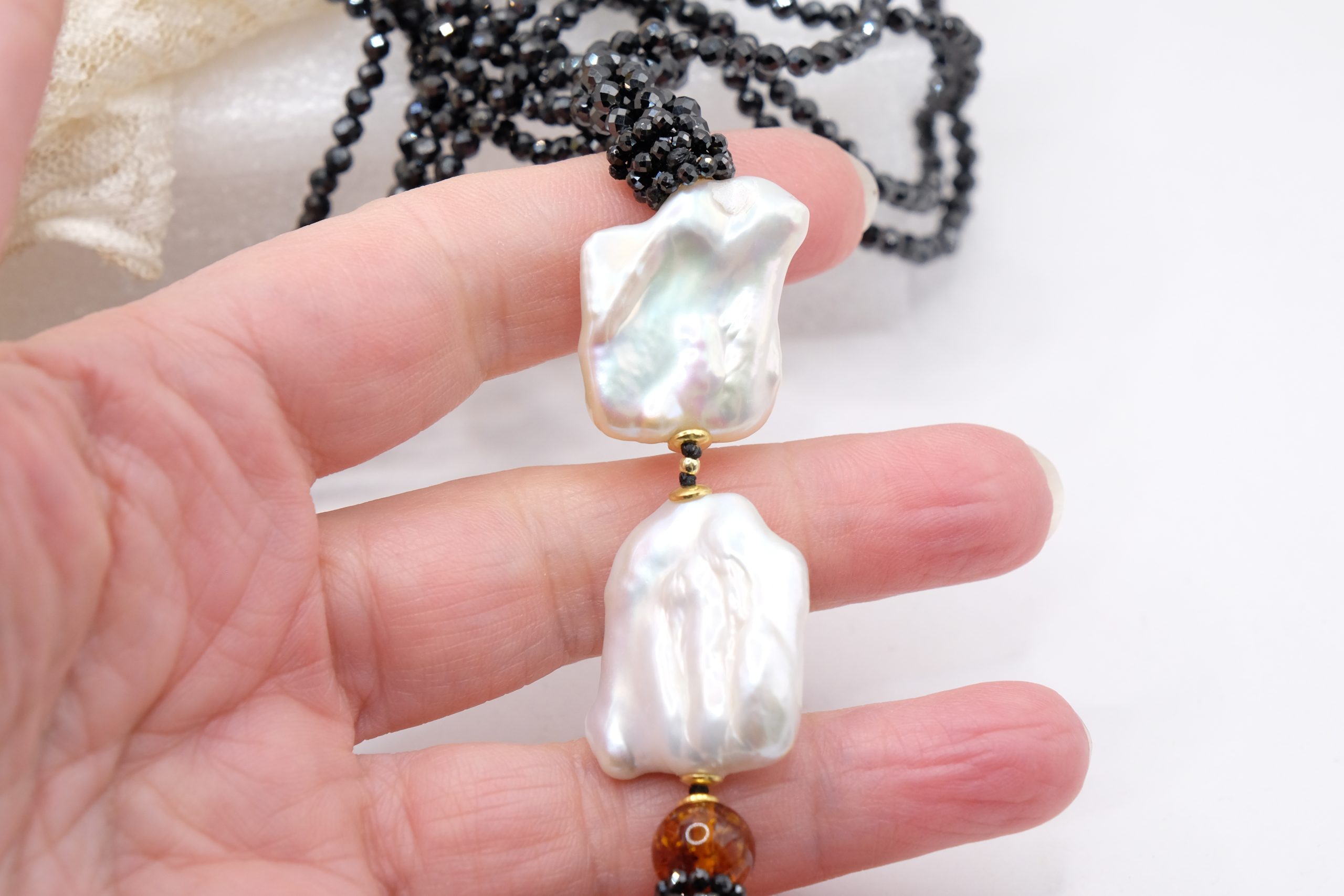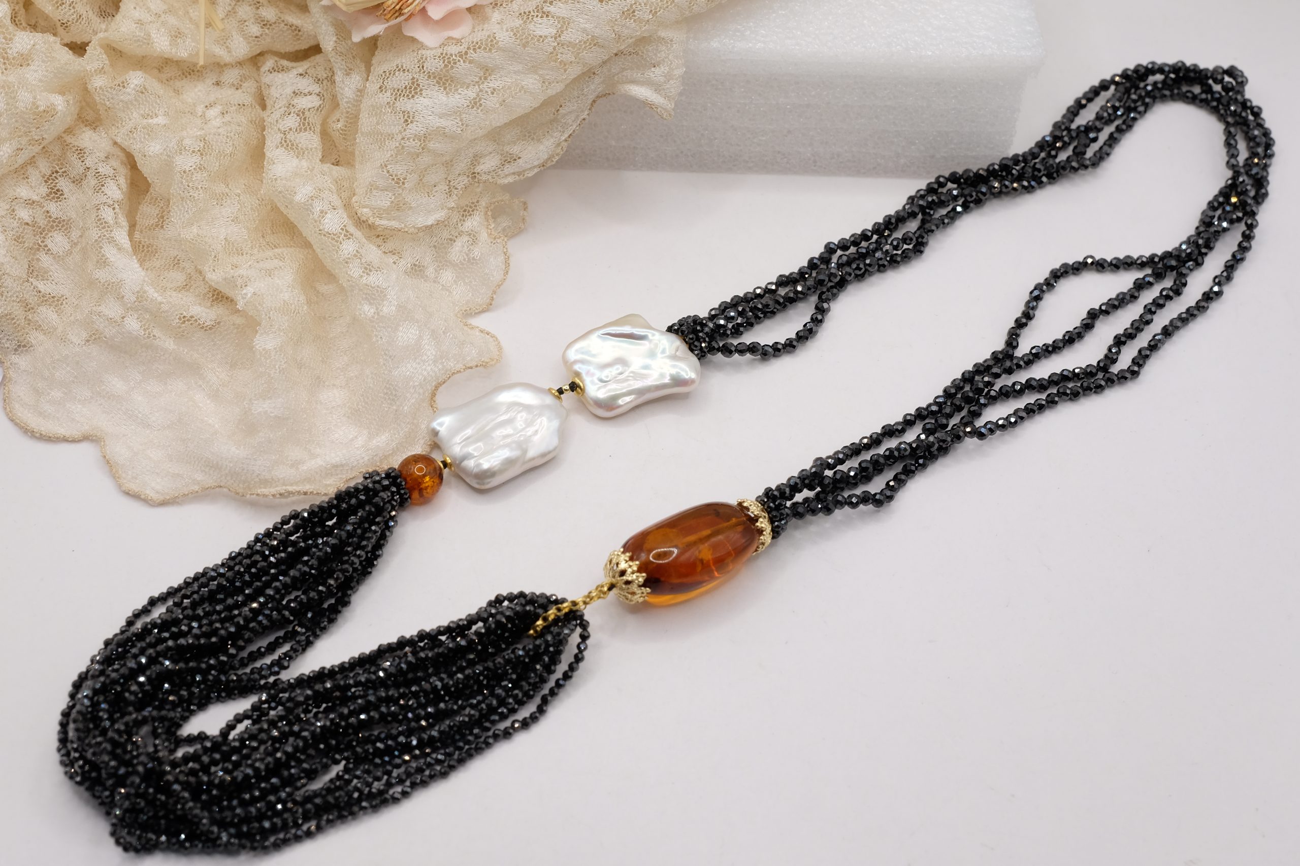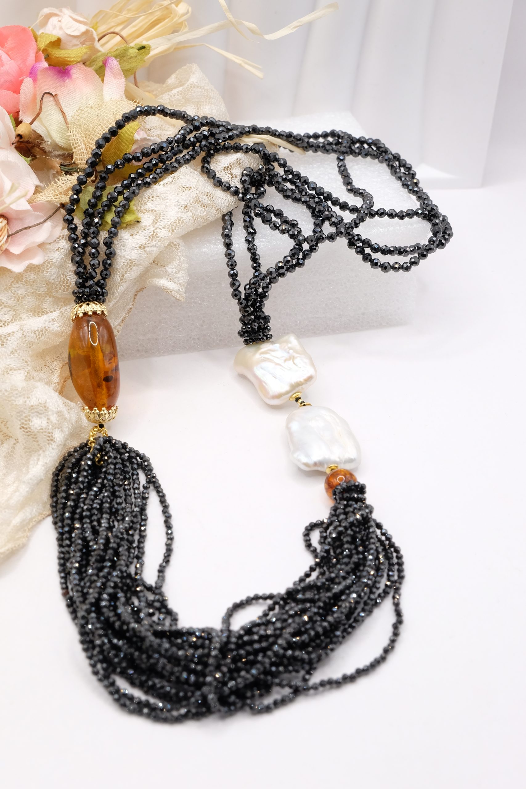 Aggiungi un tocco di eleganza e fascino al tuo look con questa collana in zirconi neri luminosi come brillanti, perle quadrate naturali e superlativa ambra del Baltico